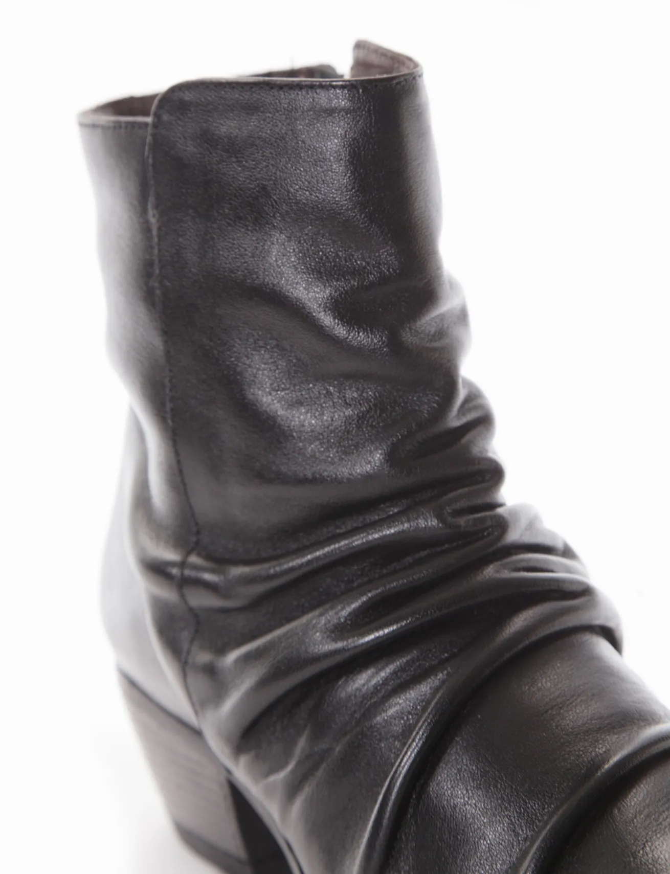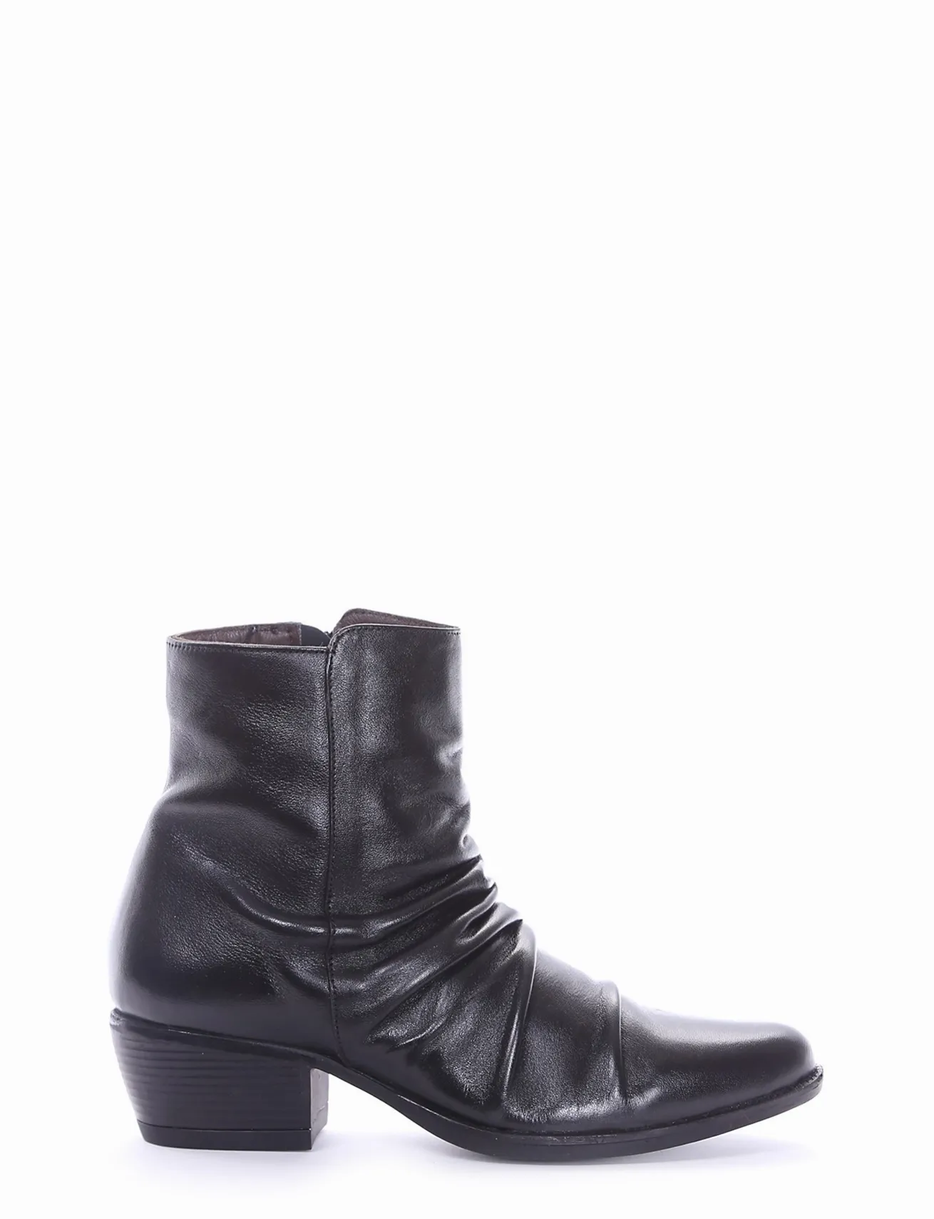 stivaletto texano tacco 3 cm, fondo in gomma e soletto interno in vera pelle. Tomaia in morbidissima pelle nappata con punta sfilata e arricciatura sul collo del piede. Cerniera lato interno per una facile e veloce calzata.
