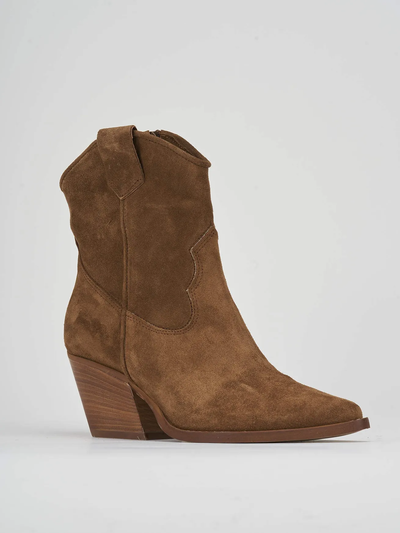 Stivaletto texano tacco 7cm, fondo cuoio e soletto interno in vera pelle. Tomaia in morbido camoscio, punta sfilata, cuciture esterne visibili, tacco grosso per una camminata comoda, adatte con dei jeans per un look cool.
