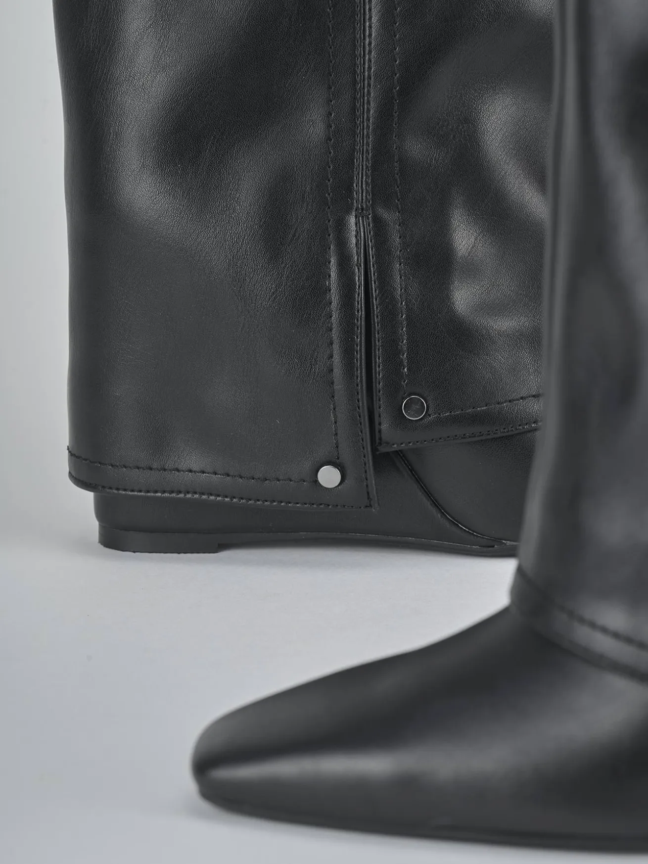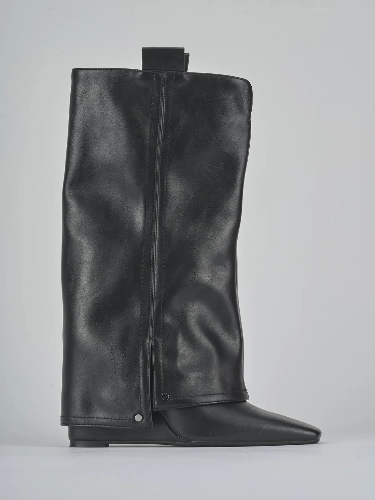 Realizzati in pelle sostenibile nera, questi stivali conferiscono un tocco di lusso al tuo guardaroba, mantenendo un impegno verso l’ecosostenibilità.