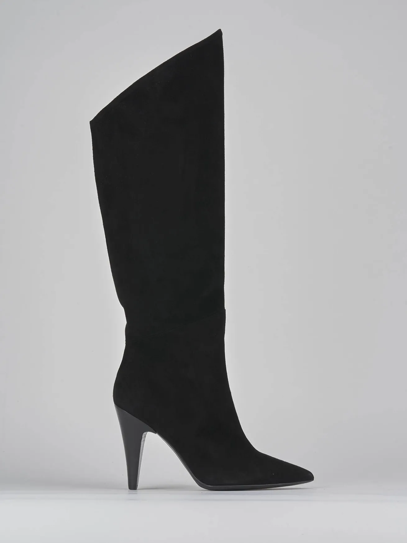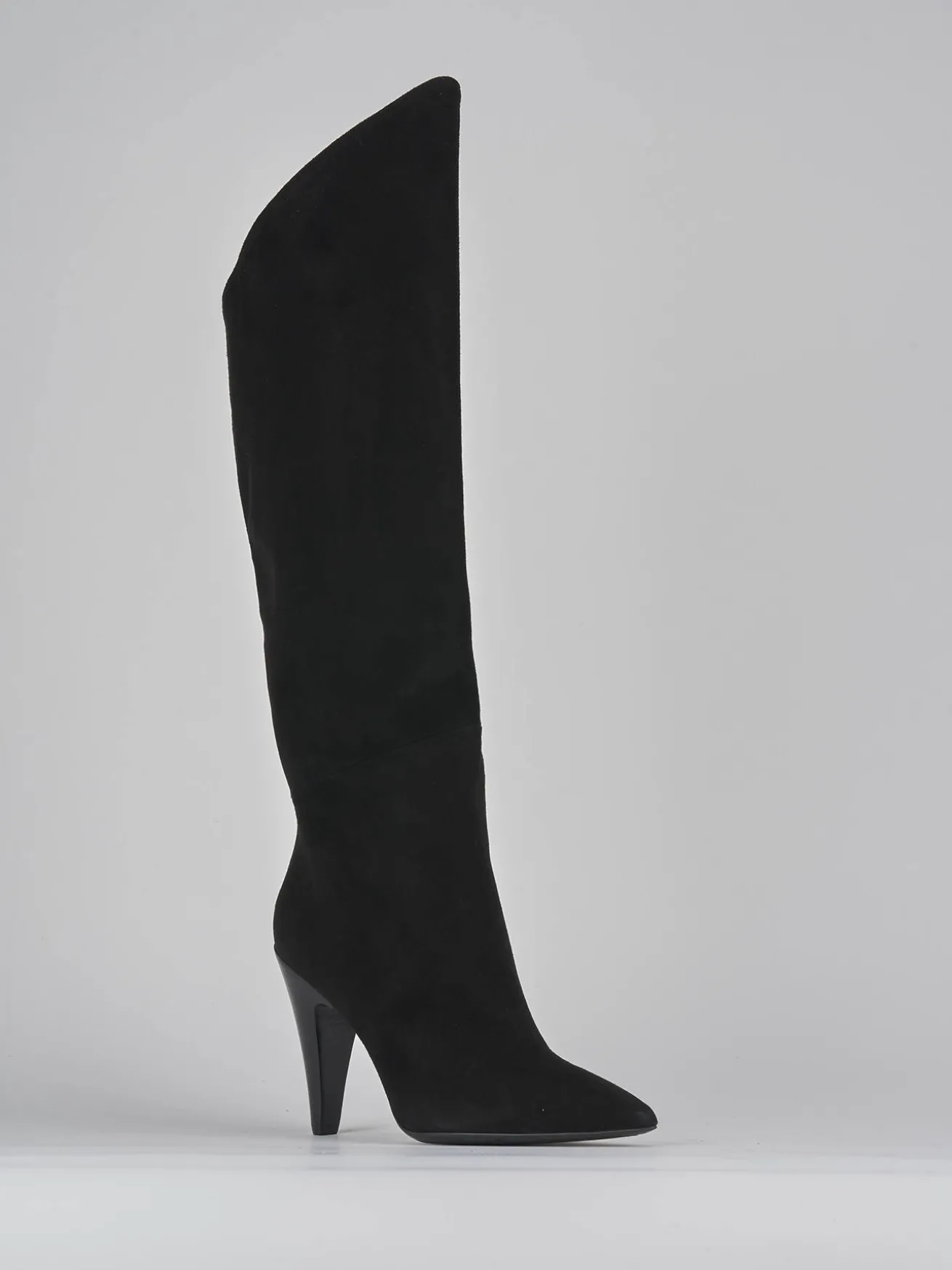 Stivale tacco 11 cm fondo in cuoio e soletto interno in vera pelle. Tomaia in morbido camoscio, punta sfilata, comoda cerniera laterale, gambale con taglio obliquo che misura appena sotto il ginocchio e tacco a cono per un look chic.