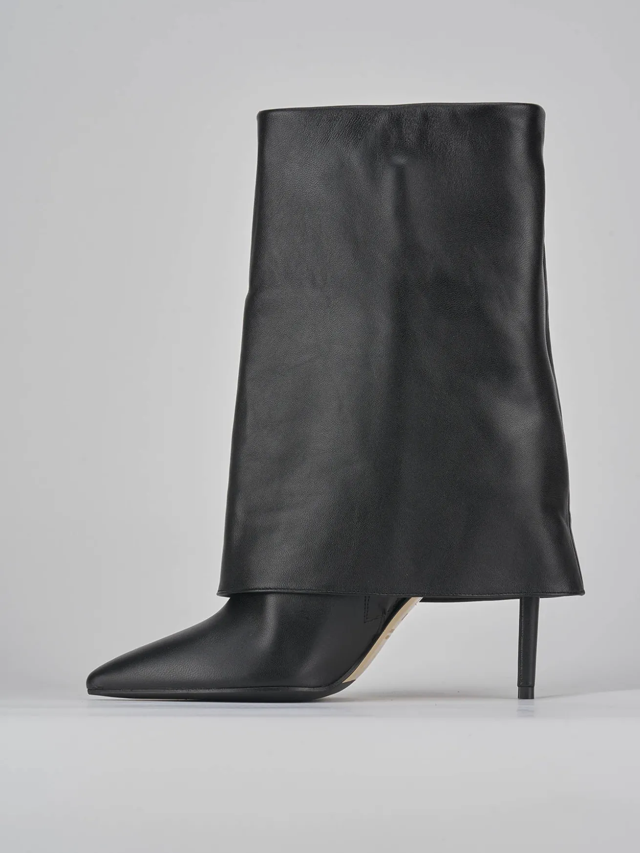 Stivale tacco 11 cm fondo in cuoio con inserto di gomma in punta e soletto interno in vera pelle. Tomaia in morbida pelle, punta sfilata, ampio gambale con risvolto che arriva appena sotto al ginocchio e tacco a spillo per un look chic.