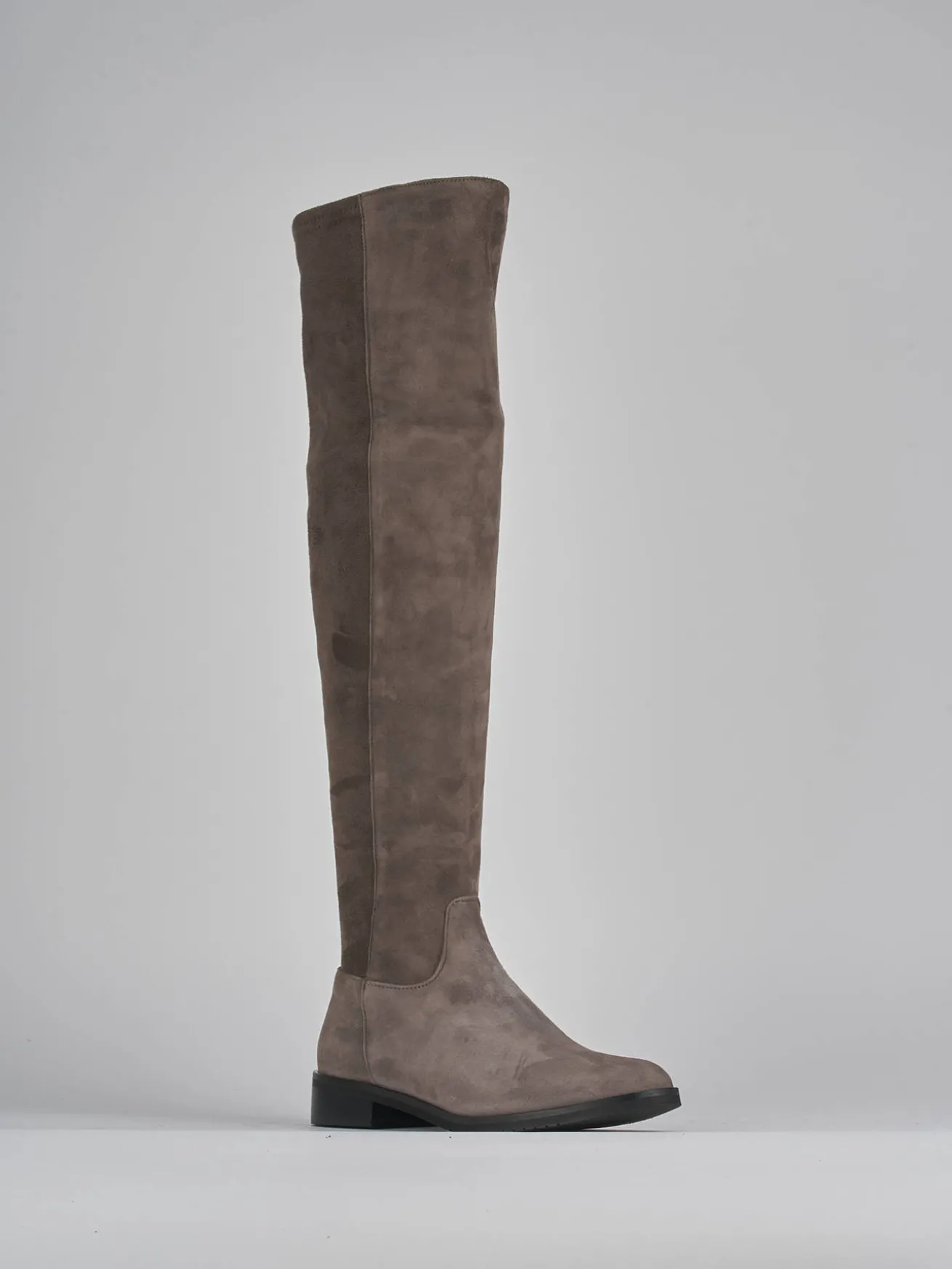 Stivale tacco 2 cm fondo in gomma e soletto interno in vera pelle. Tomaia in morbido camoscio, punta arrotondata, cerniera laterale, cuciture ben visibili e gambale elasticizzato per un fit perfetto per un look che non passa mai di moda. altezza gambale appena sopra il ginocchio.