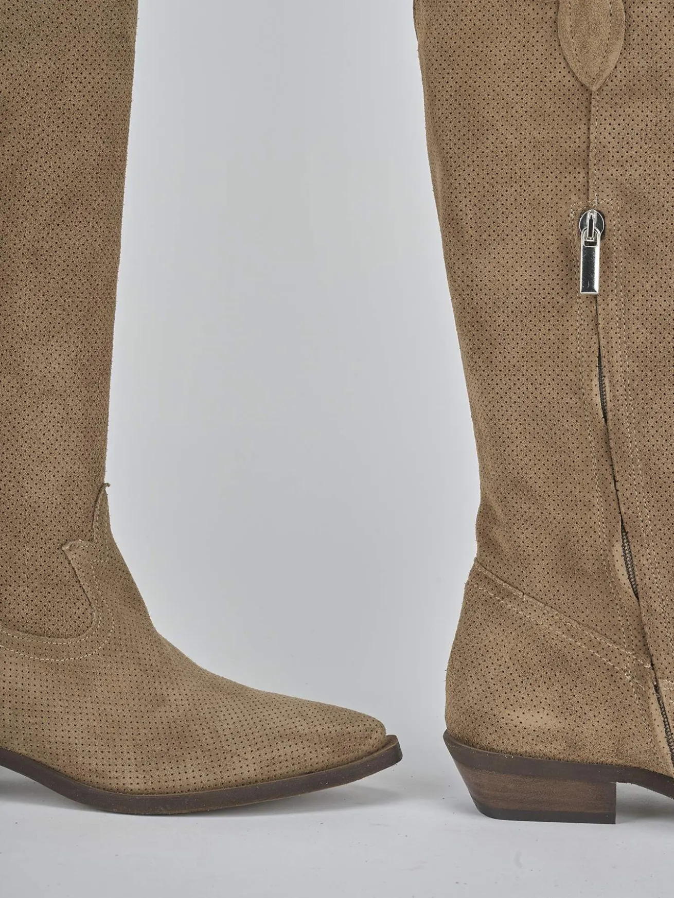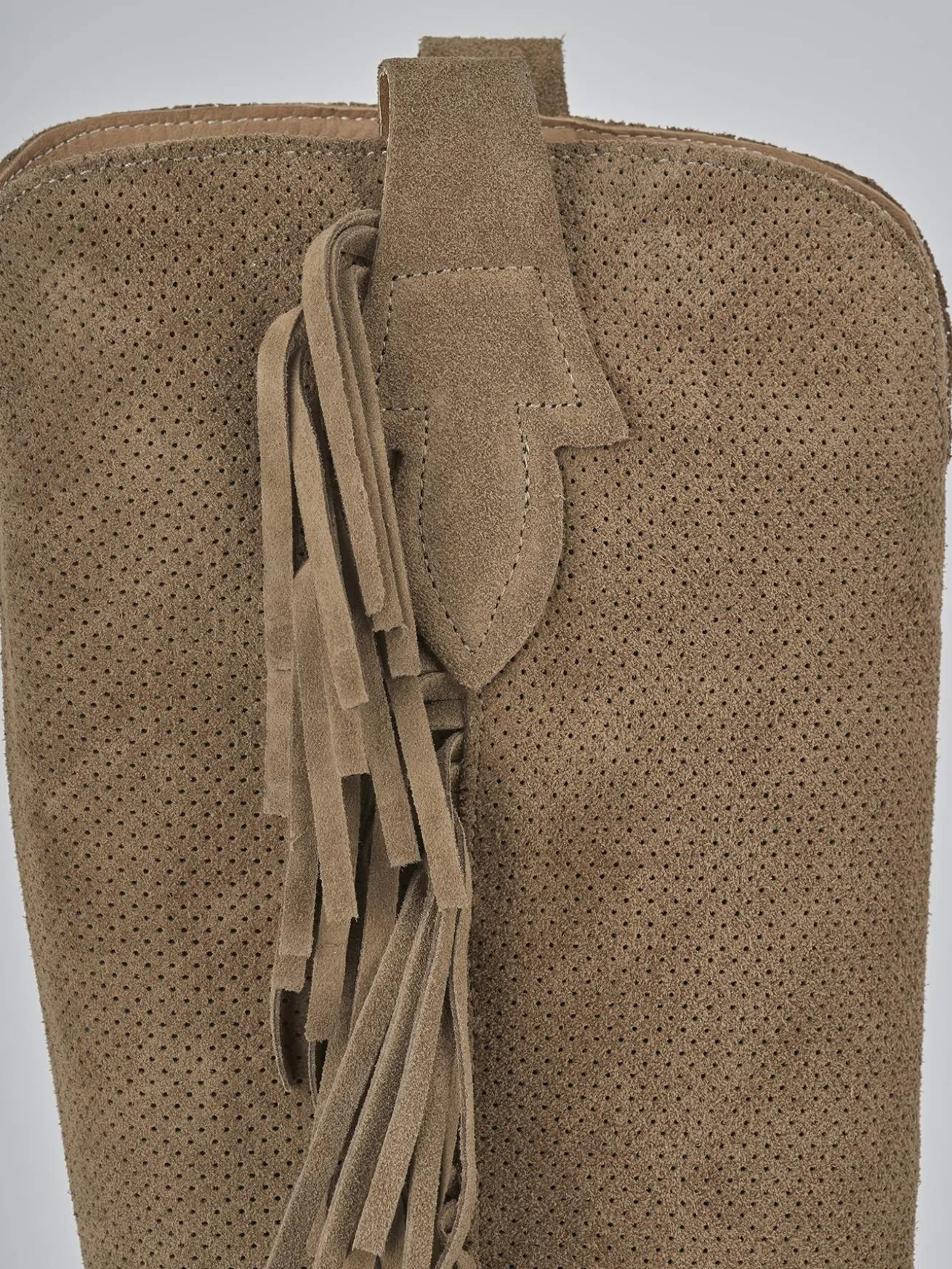 Stivale texano tacco 2 cm fondo in leggera gomma e soletto interno in vera pelle. Tomaia in morbida pelle scamosciata, punta sfilata, apertura lati ‘V’ sul gambale forato che misura appena sopra il ginocchio, ghette e frange laterali. Rapida chiusura con cerniera laterale. Perfetto per ogni tuo look.