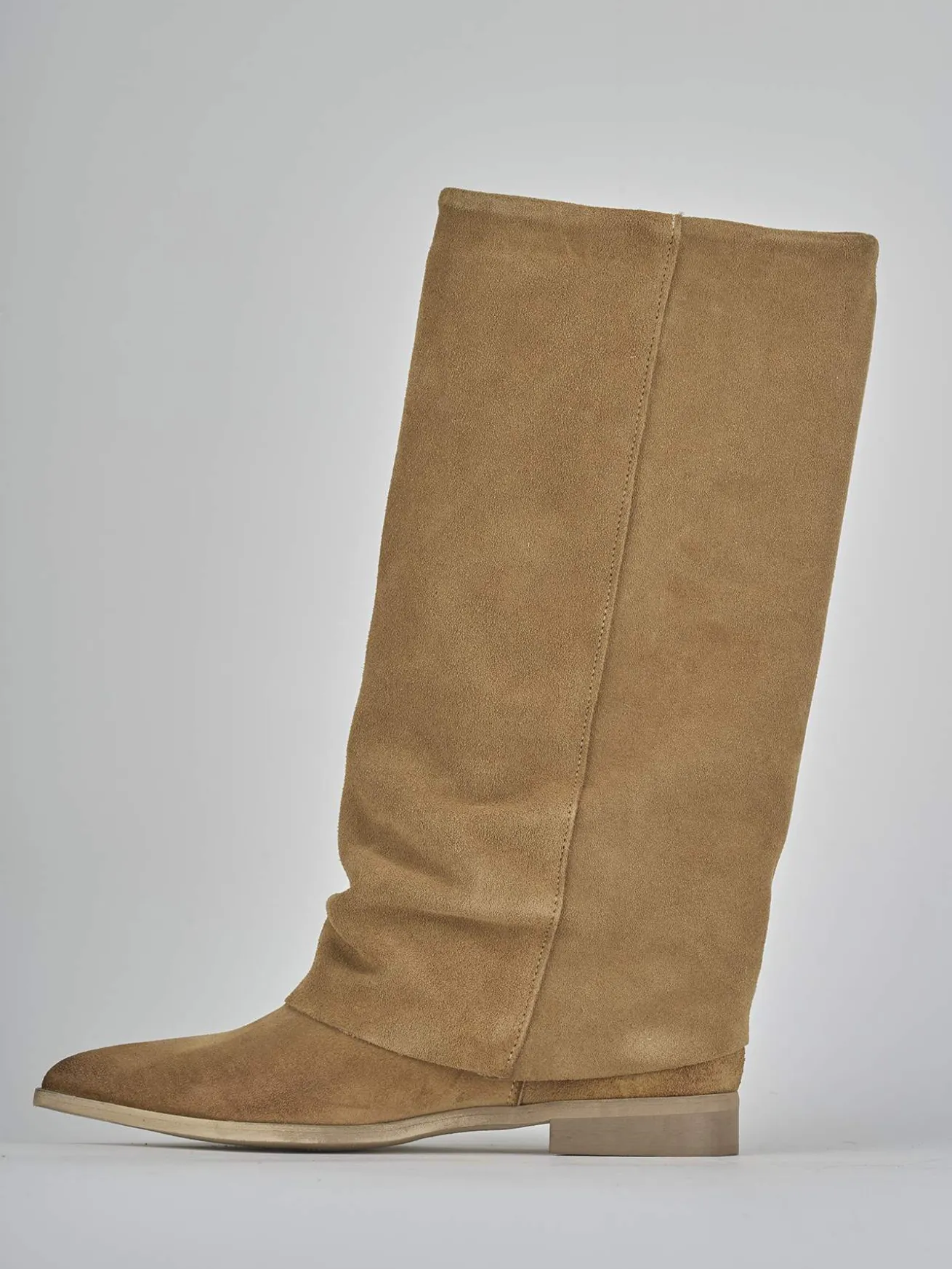 Stivale tacco 2 cm fondo in gomma e soletto interno in vera pelle. Tomaia in morbido camoscio, punta sfilata, risvolto aderente sul gambale che si arriccia e che misura a 3cm dal ginocchio. Dalle linee versatili per ogni tuo look.