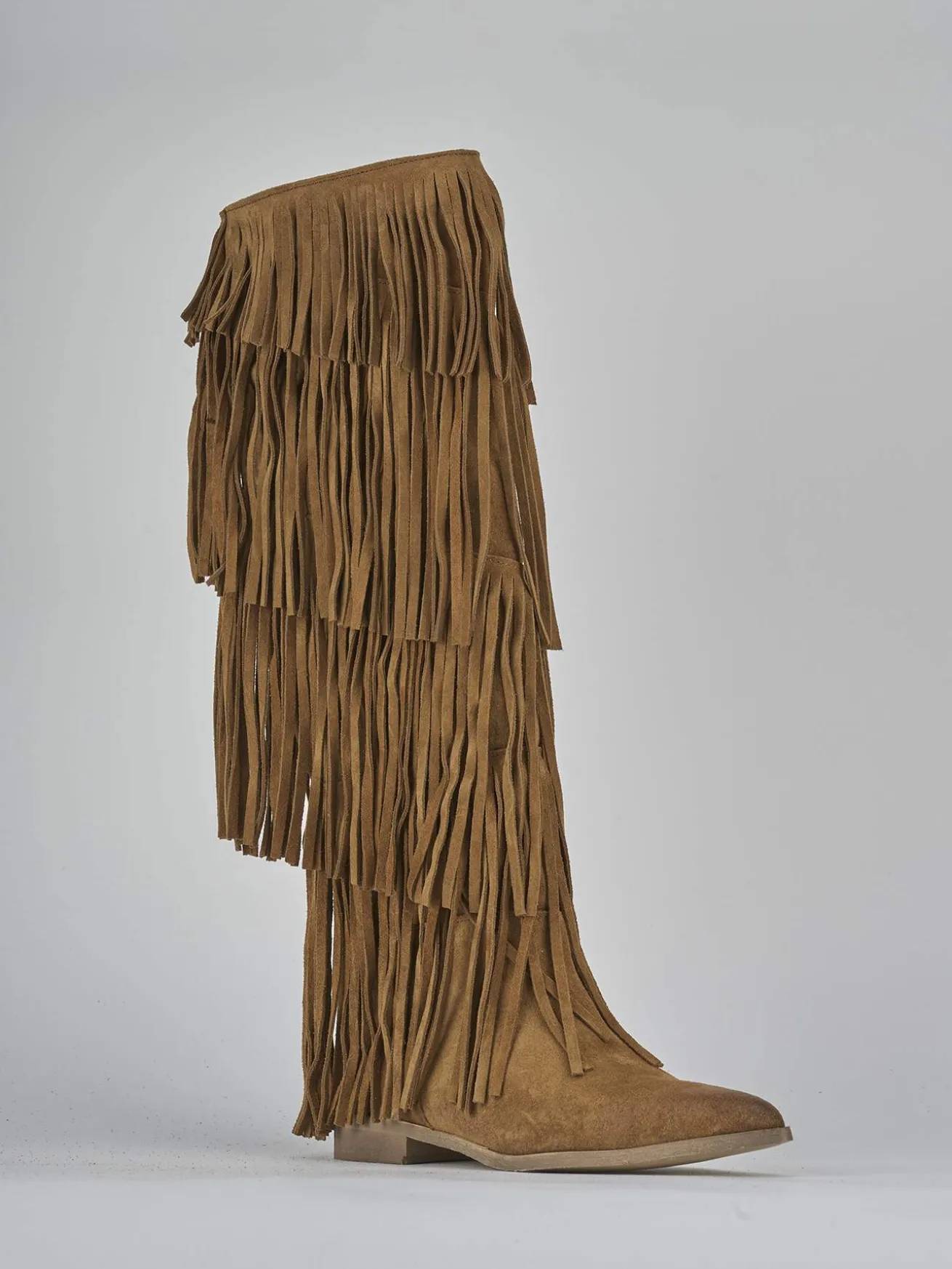 Stivale tacco 2 cm fondo in gomma e soletto interno in vera pelle. Tomaia in morbido camoscio, punta sfilata, frange su entrambi i lati del gambale che misura appena sotto il ginocchio. Perfetto con una minigonna e una maglia.