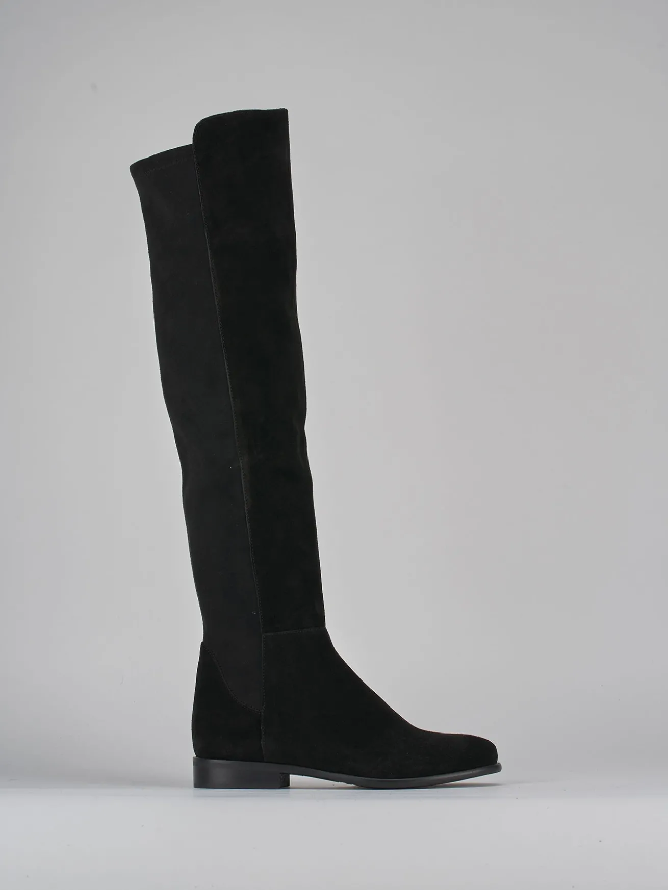 Stivale tacco 2 cm fondo in gomma e soletto interno in vera pelle. Tomaia in morbido camoscio, punta tonda, comoda zip laterale, gambale con tessuto elasticizzato dietro che misura appena sopra il ginocchio per un look cool.