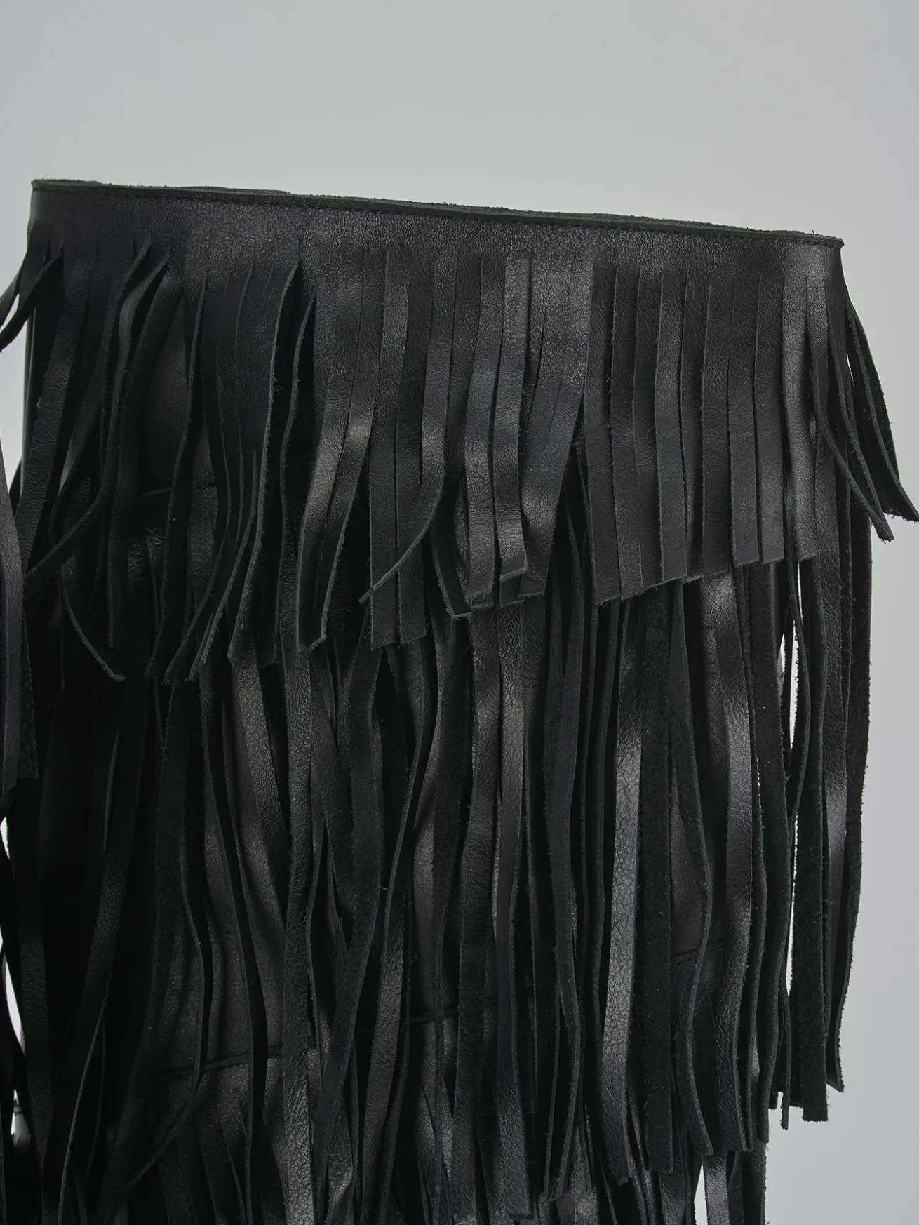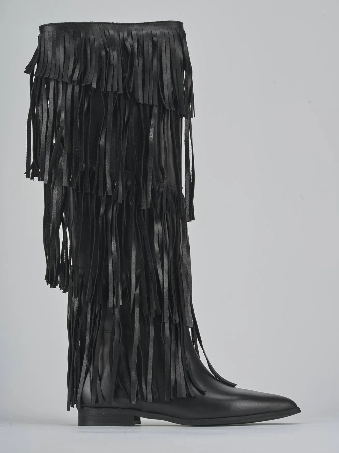 Stivale tacco 2 cm fondo in gomma e soletto interno in vera pelle. Tomaia in morbida pelle, punta sfilata, frange su entrambi i lati del gambale che misura appena sotto il ginocchio. Perfetto con una minigonna e una maglia.