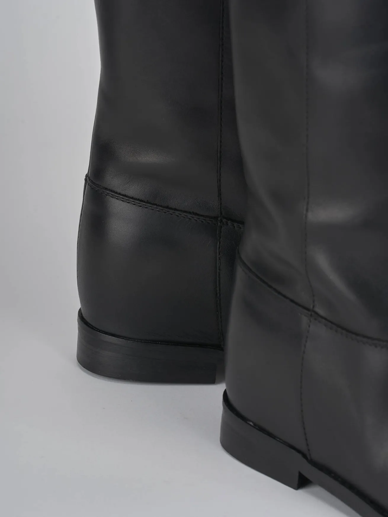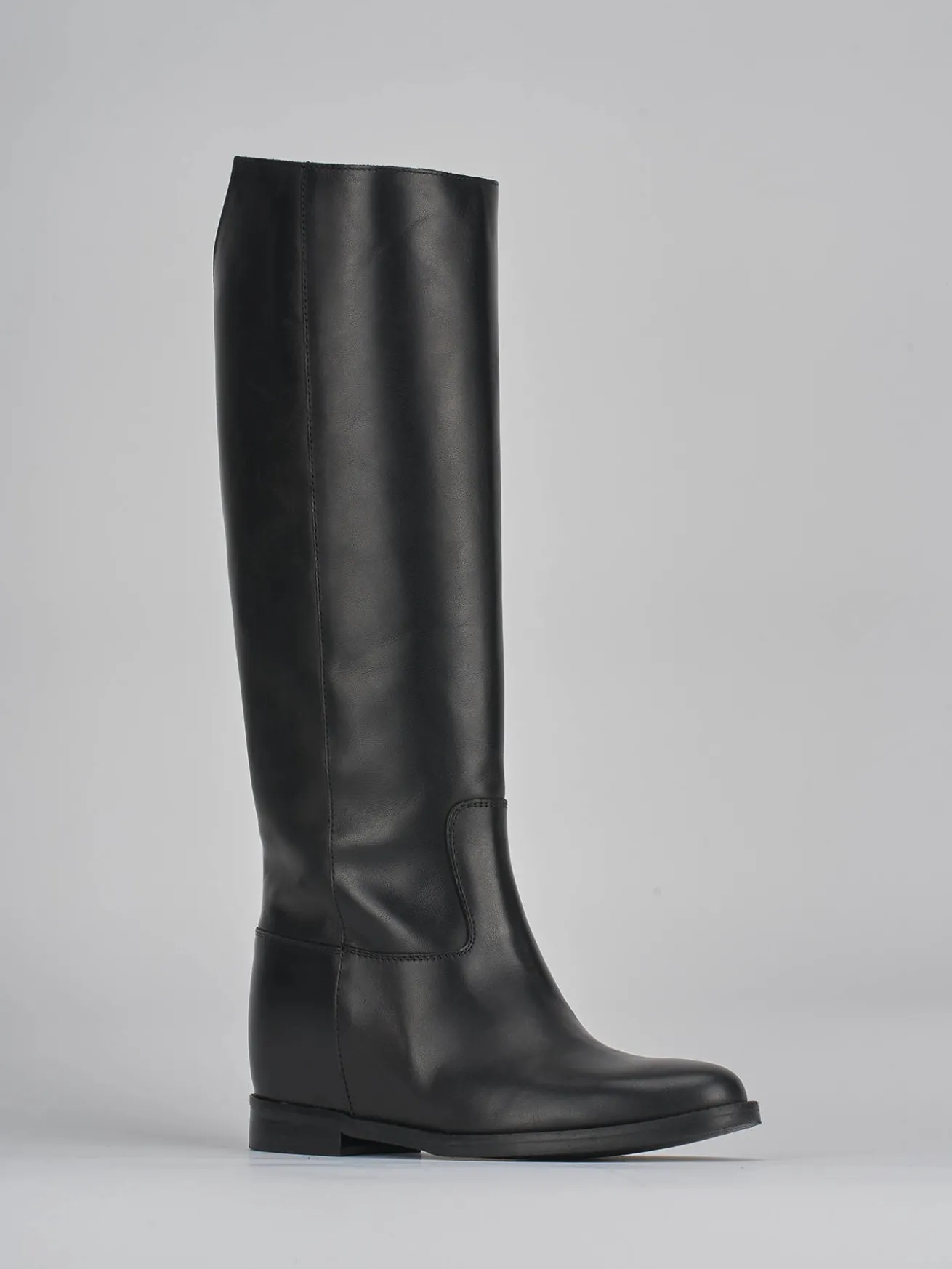 stivale tacco 2 cm fondo in gomma e soletto interno in vera pelle. tomaia in morbida pelle, punta affusolata, cuciture a mano a vista, altezza gambale appena sotto il ginocchio con zeppa interna di 3 cm. dettaglio posteriore con apertura a ‘V’. con una t-shirt elegante e un paio di jeans per un look casual-chic.