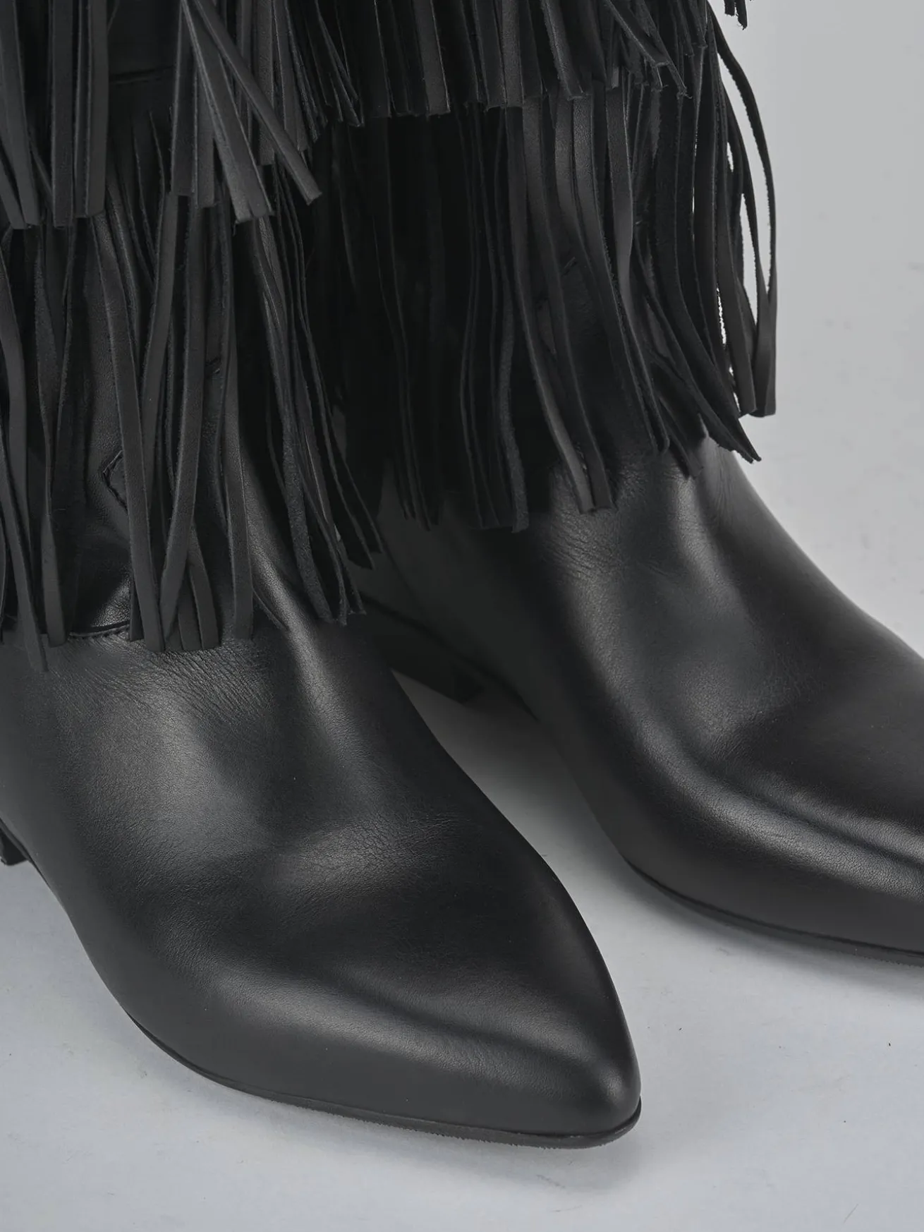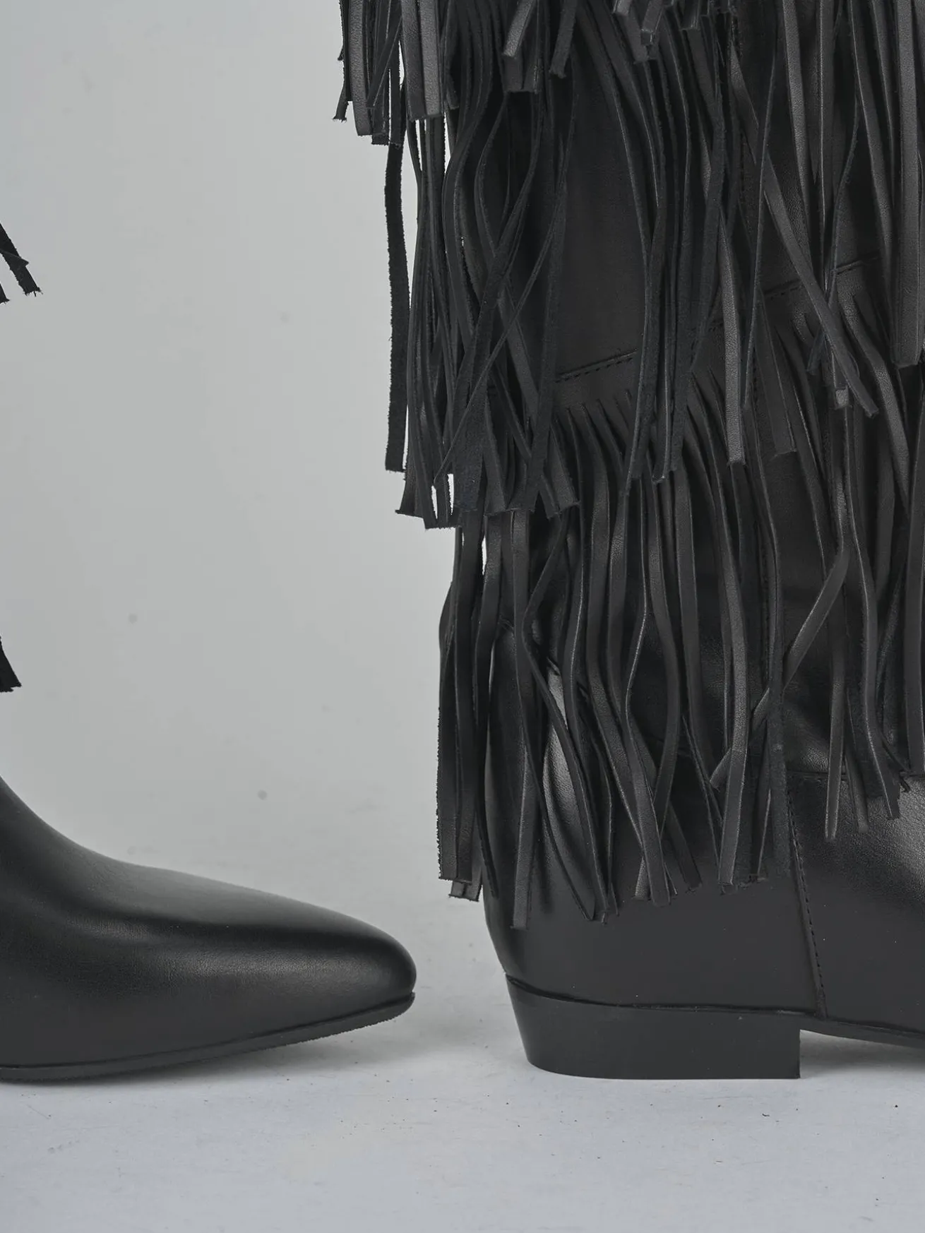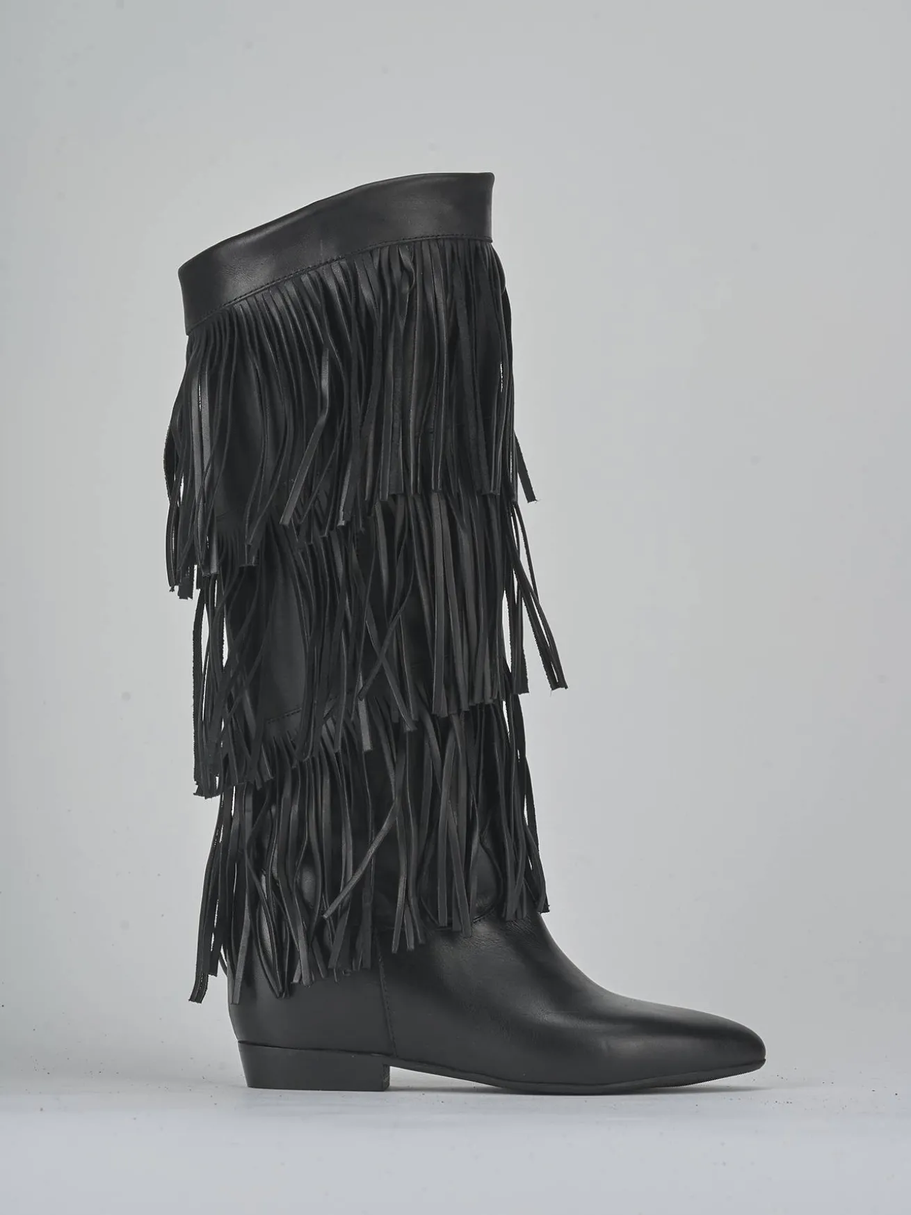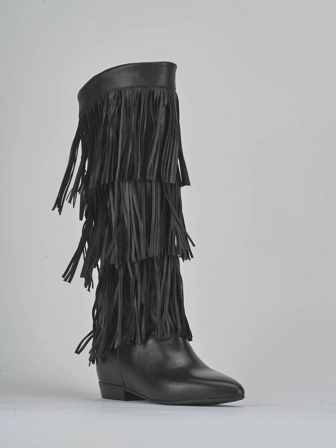 Le frange che adornano il gambale, che arriva appena sotto il ginocchio, aggiungono un tocco di originalità e movimento al tuo outfit.