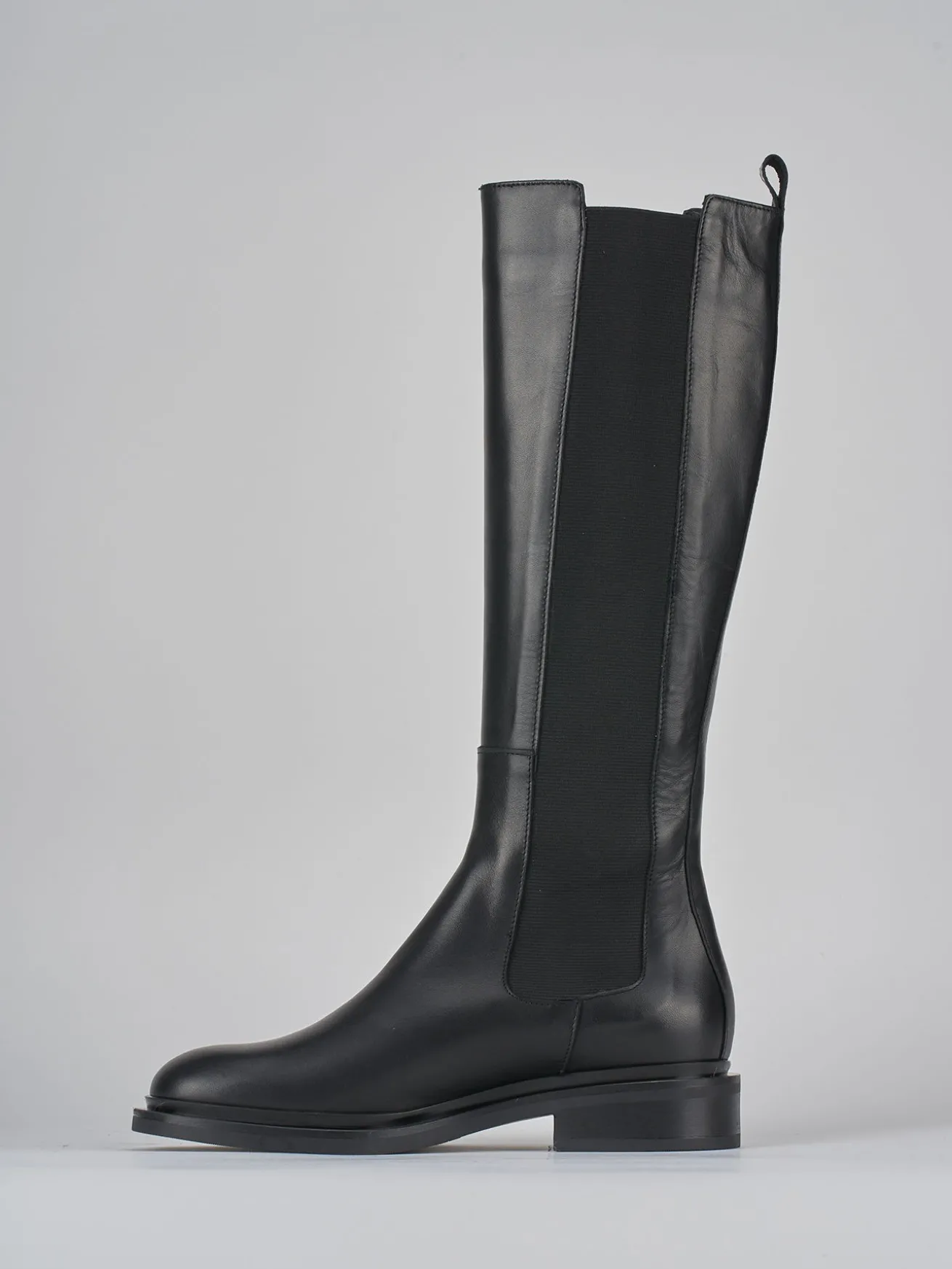 Stivale tacco 2 cm fondo in gomma e soletto interno in vera pelle. Tomaia in morbida pelle, punta tonda, cuciture a vista lungo il gambale che misura appena sotto il ginocchio con tessuto elasticizzato ai lati. dal design sottile ed elegante, è il modello passepartout per eccellenza.
