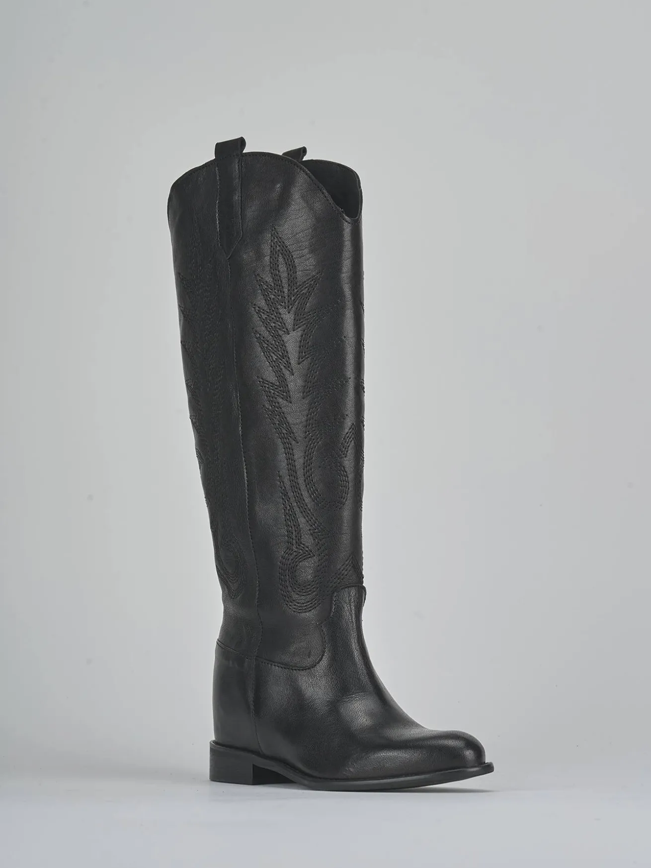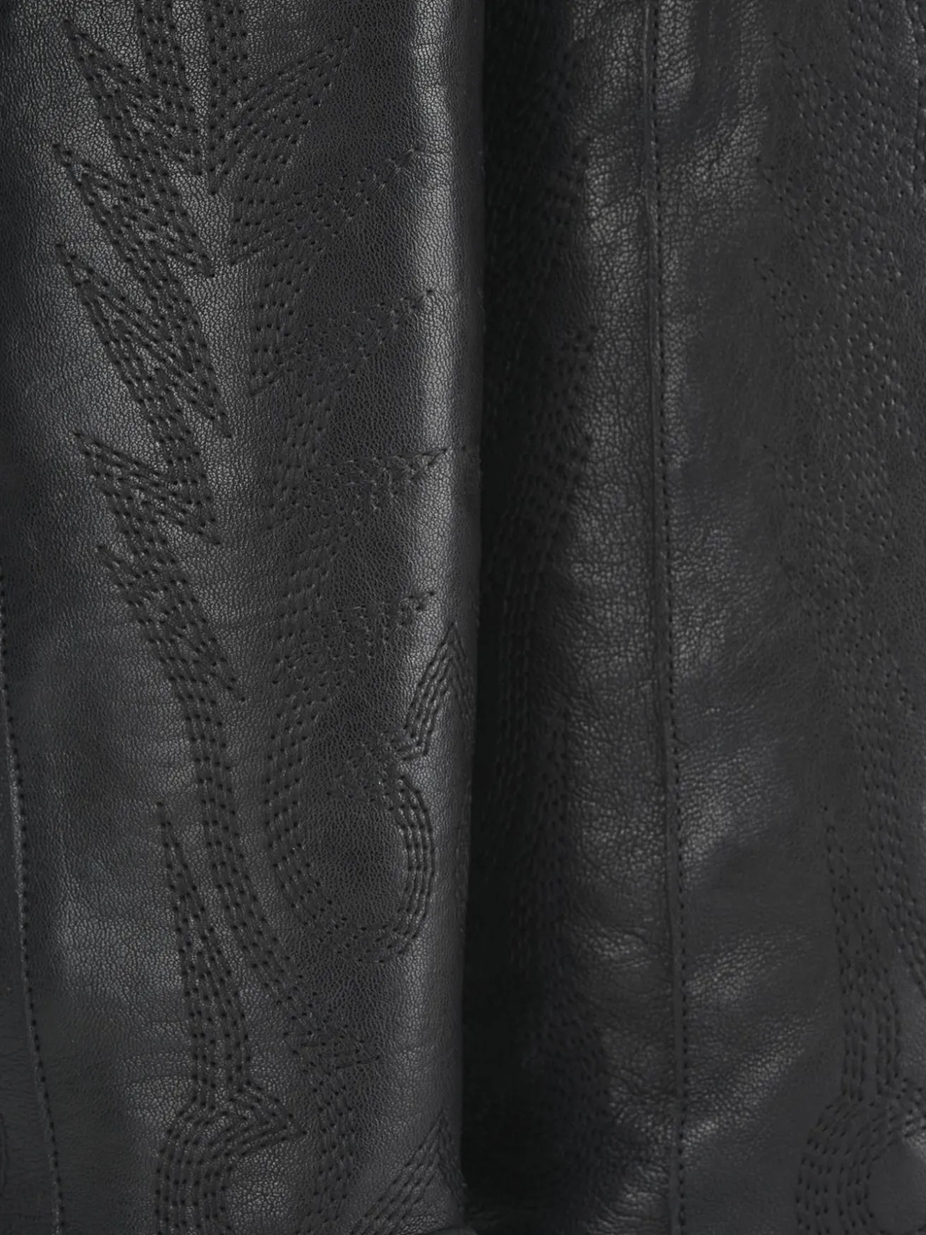 Realizzati in morbida pelle, questi stivali presentano una punta affusolata e ricami a mano sul gambale tubolare, che si ferma appena sotto il ginocchio.