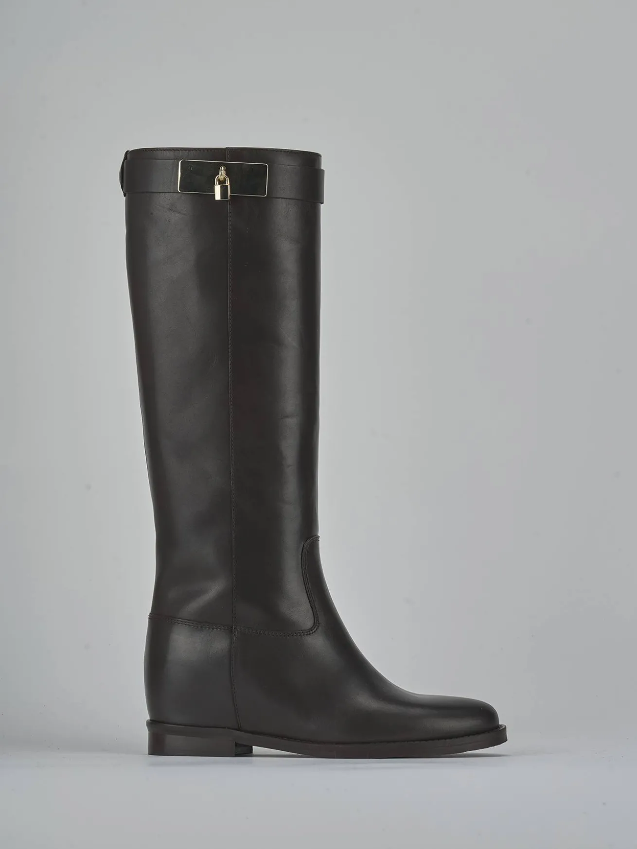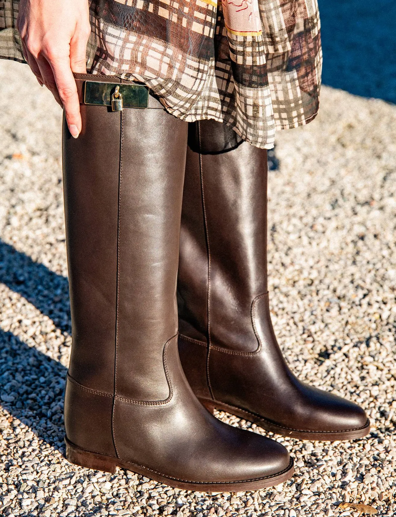 Il gambale si estende fino a poco sotto il ginocchio, con un cinturino decorativo che conferisce un look chic.