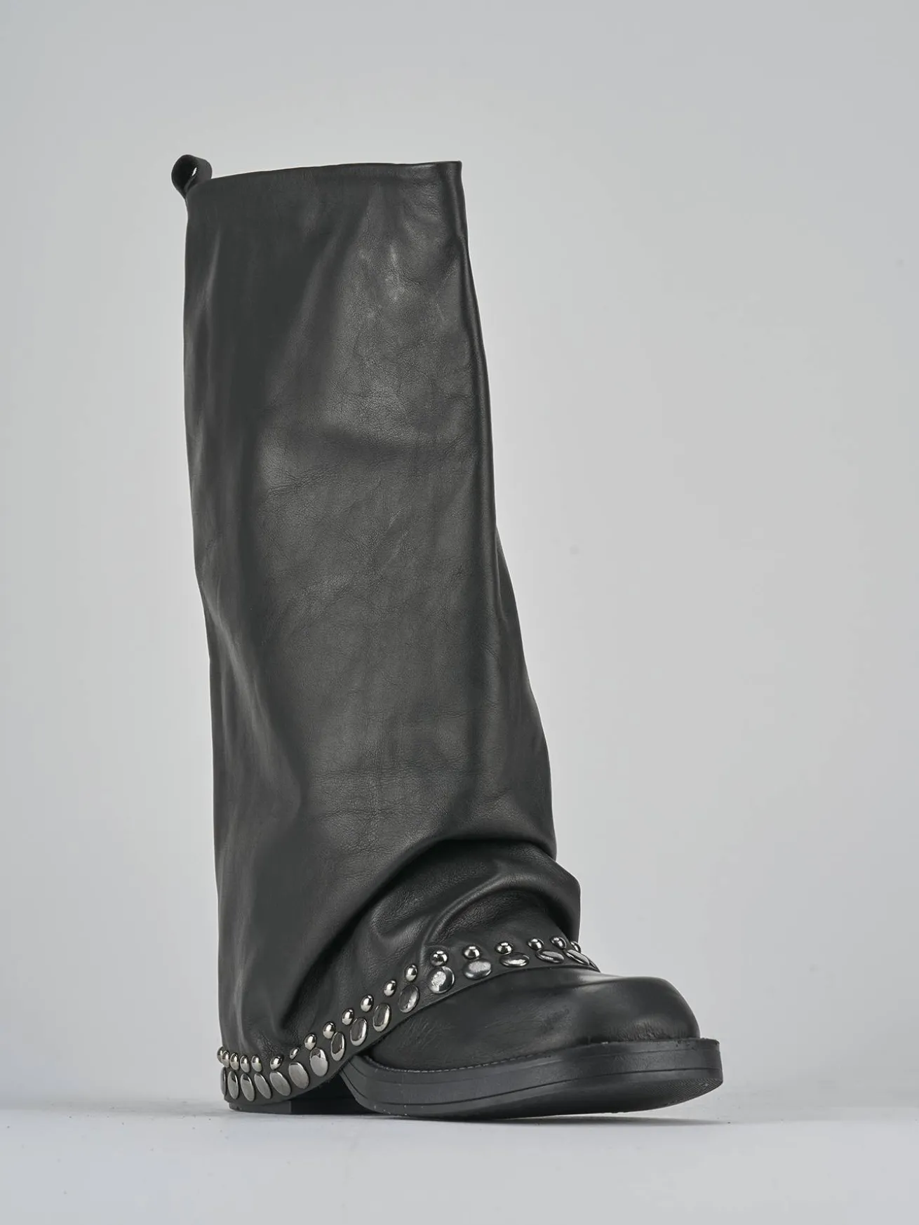 Il design è arricchito da un morbido risvolto decorato con borchiette, che conferisce un carattere distintivo e alla moda.