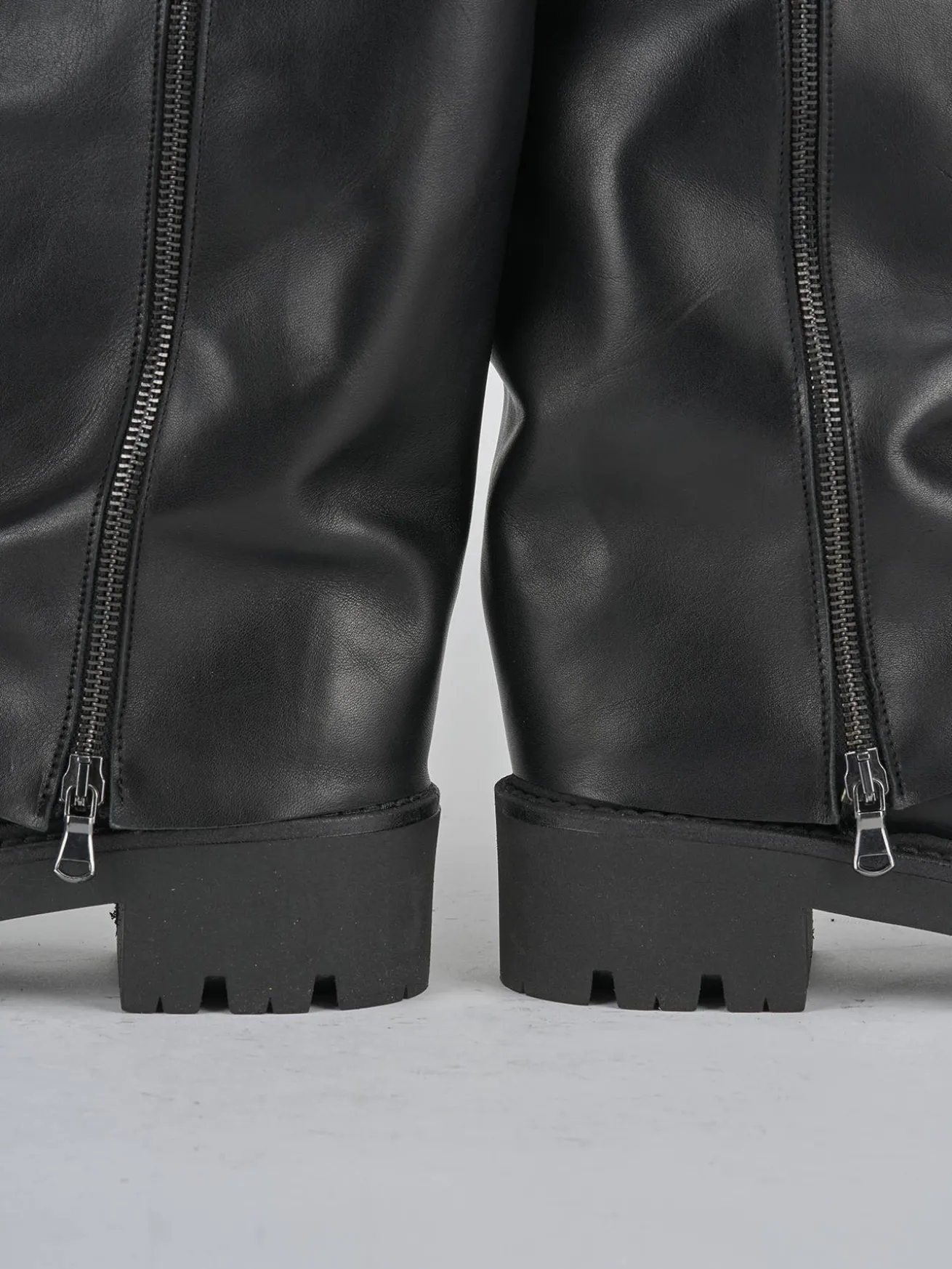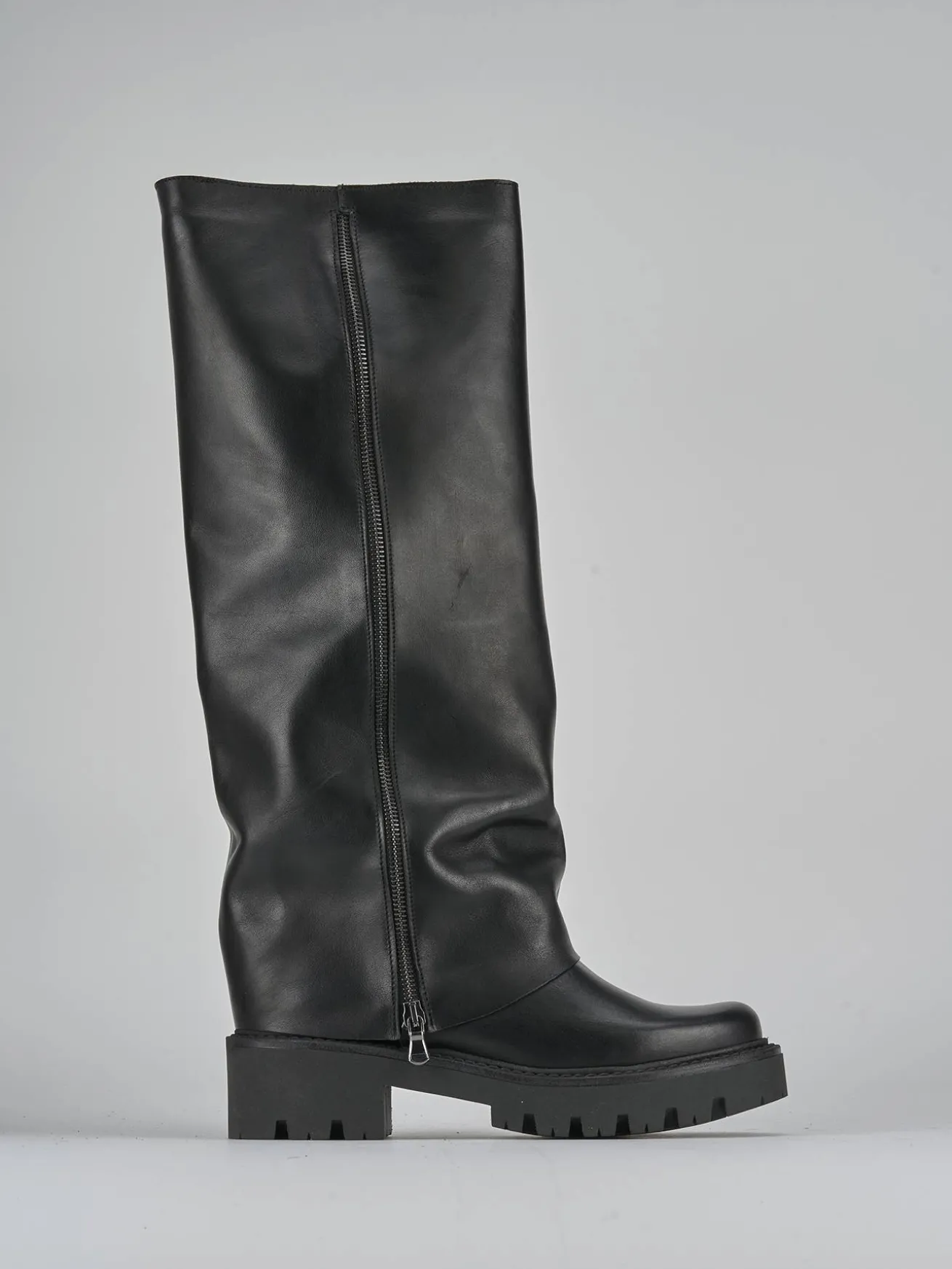 Realizzati in morbida pelle con una punta affusolata, presentano cuciture a mano sul gambale che arriva appena sotto il ginocchio.