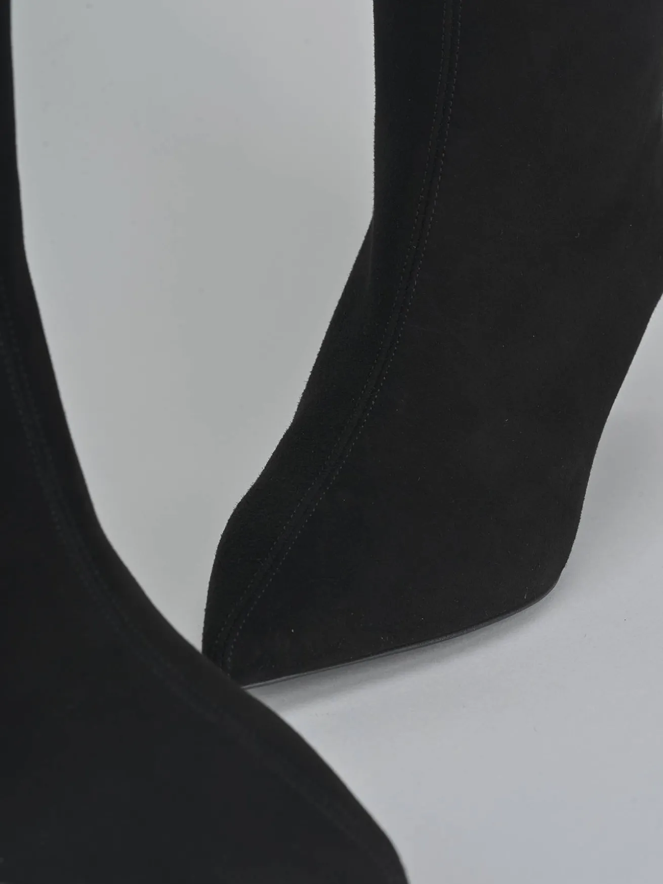 Realizzati in morbido camoscio, questi stivali presentano una punta sfilata e una cucitura a mano sul gambale, che si ferma appena sotto il ginocchio.