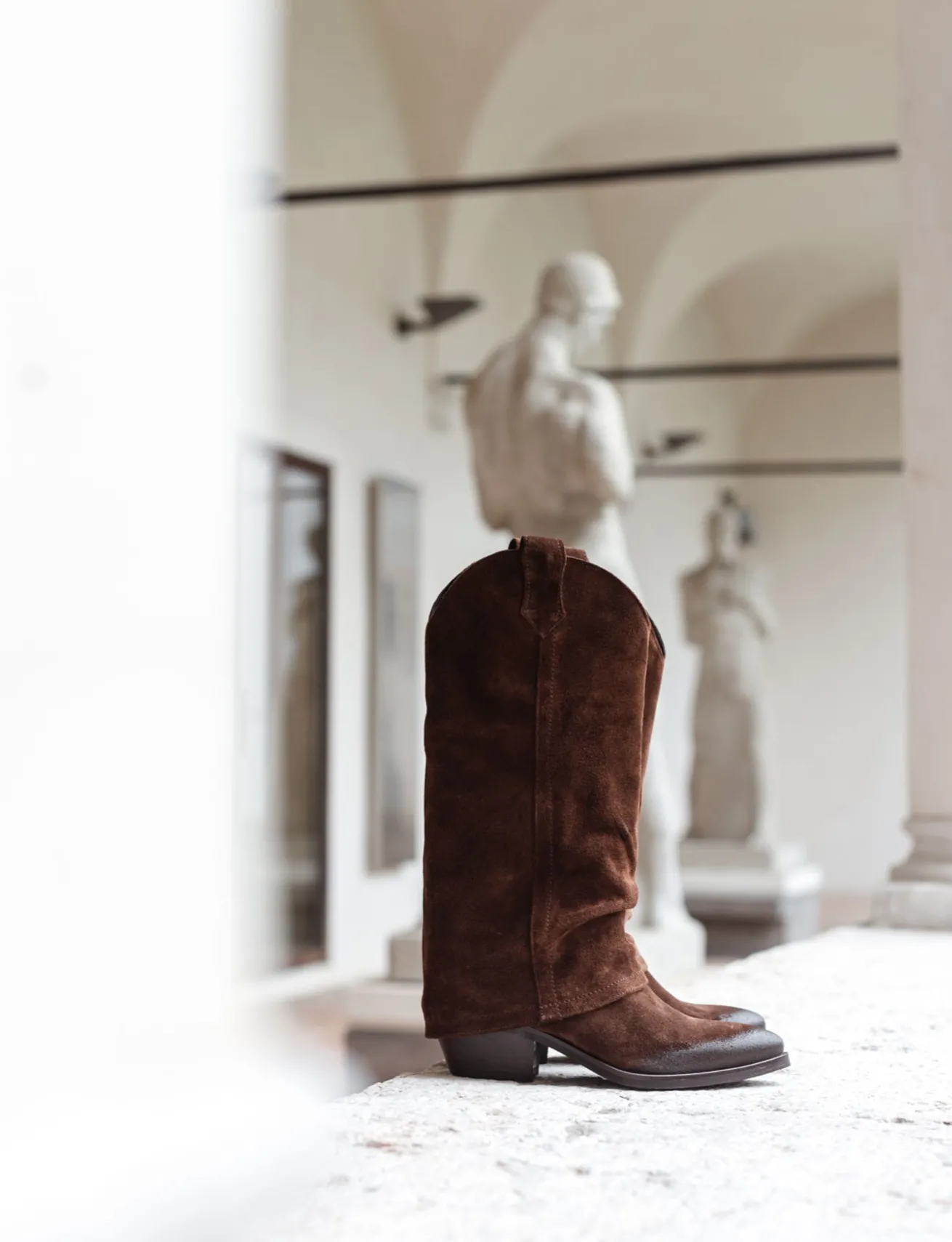 Stivale texano tacco 4 cm fondo in gomma e soletto interno in vera pelle. Tomaia in morbido camoscio, punta sfilata, cuciture visibili, ghette. gambale largo con risvolto che misura appena sotto il ginocchio, guardolo sporgente e tacco cubano per un look adatto ai tuoi outfit più chic.