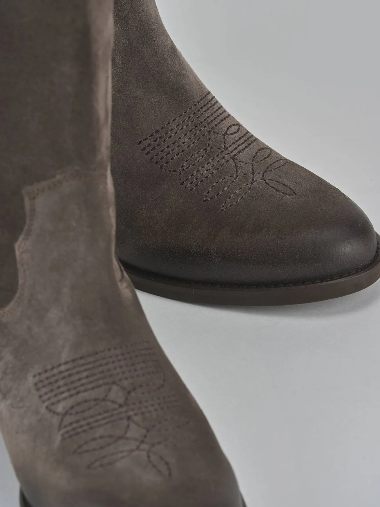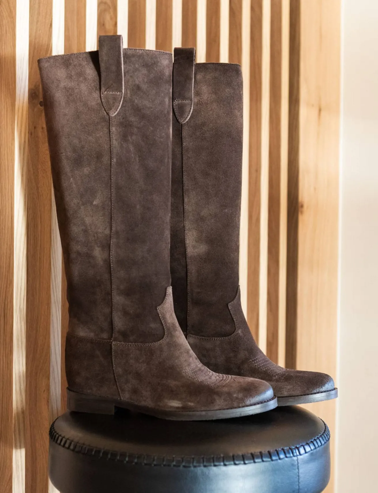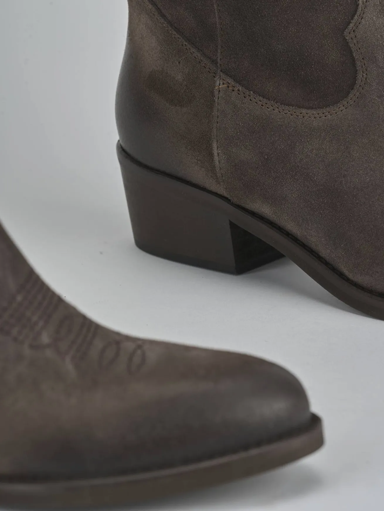 La tomaia in morbido camoscio accarezza la gamba, mentre la punta affusolata e le cuciture a mano in rilievo aggiungono un tocco di classe.