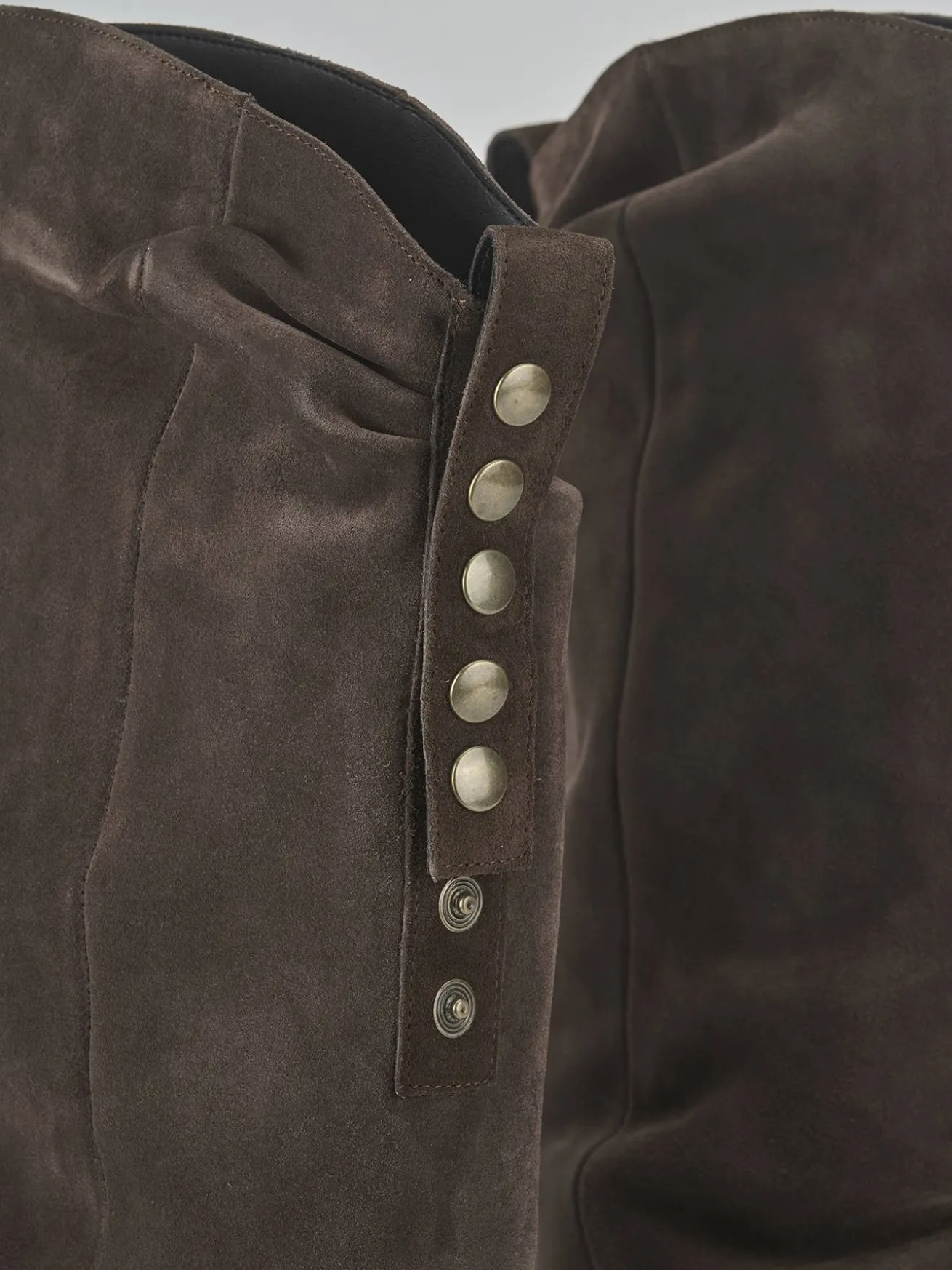 La tomaia è realizzata in morbido camoscio, con una punta sfilata e dettagli di cuciture a mano che ne esaltano la qualità artigianale.