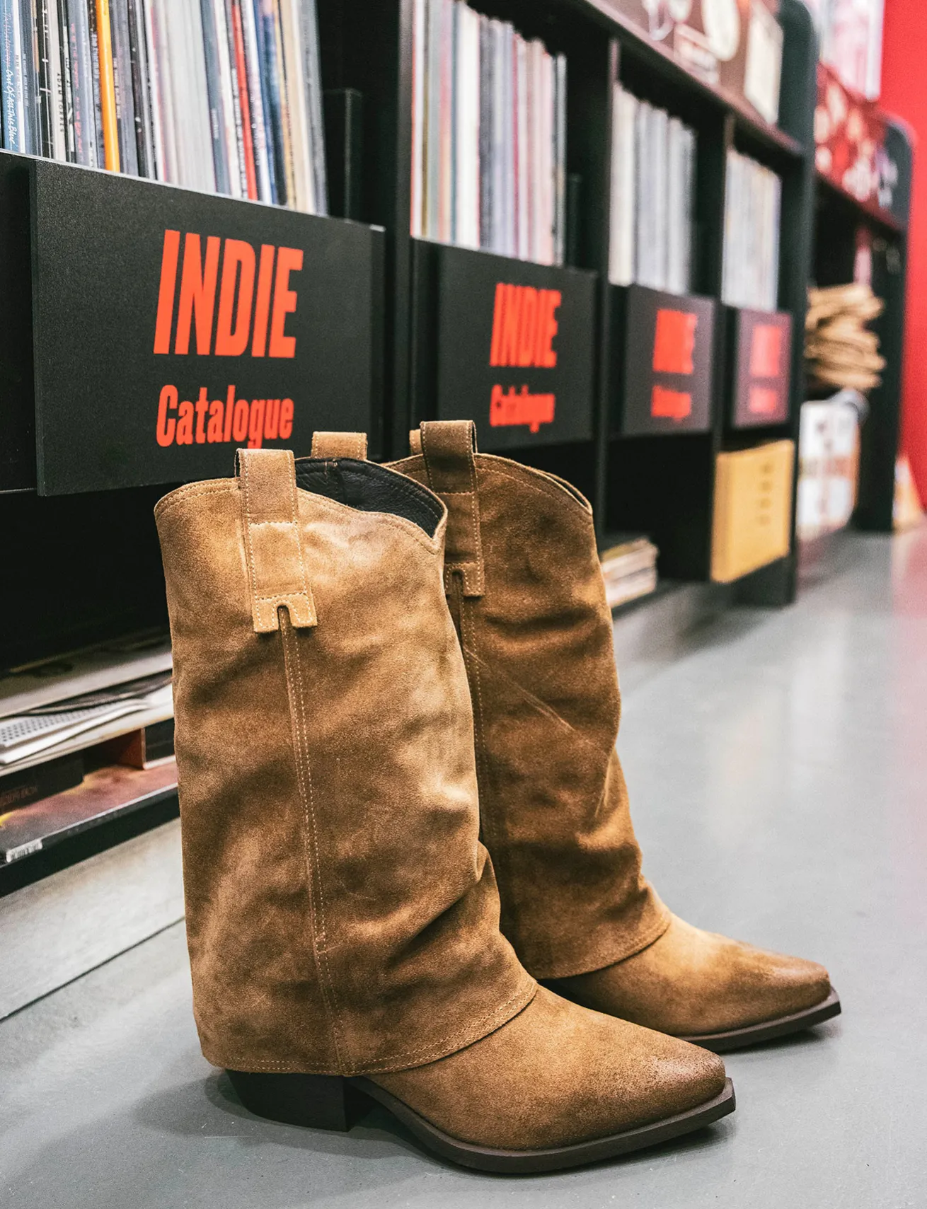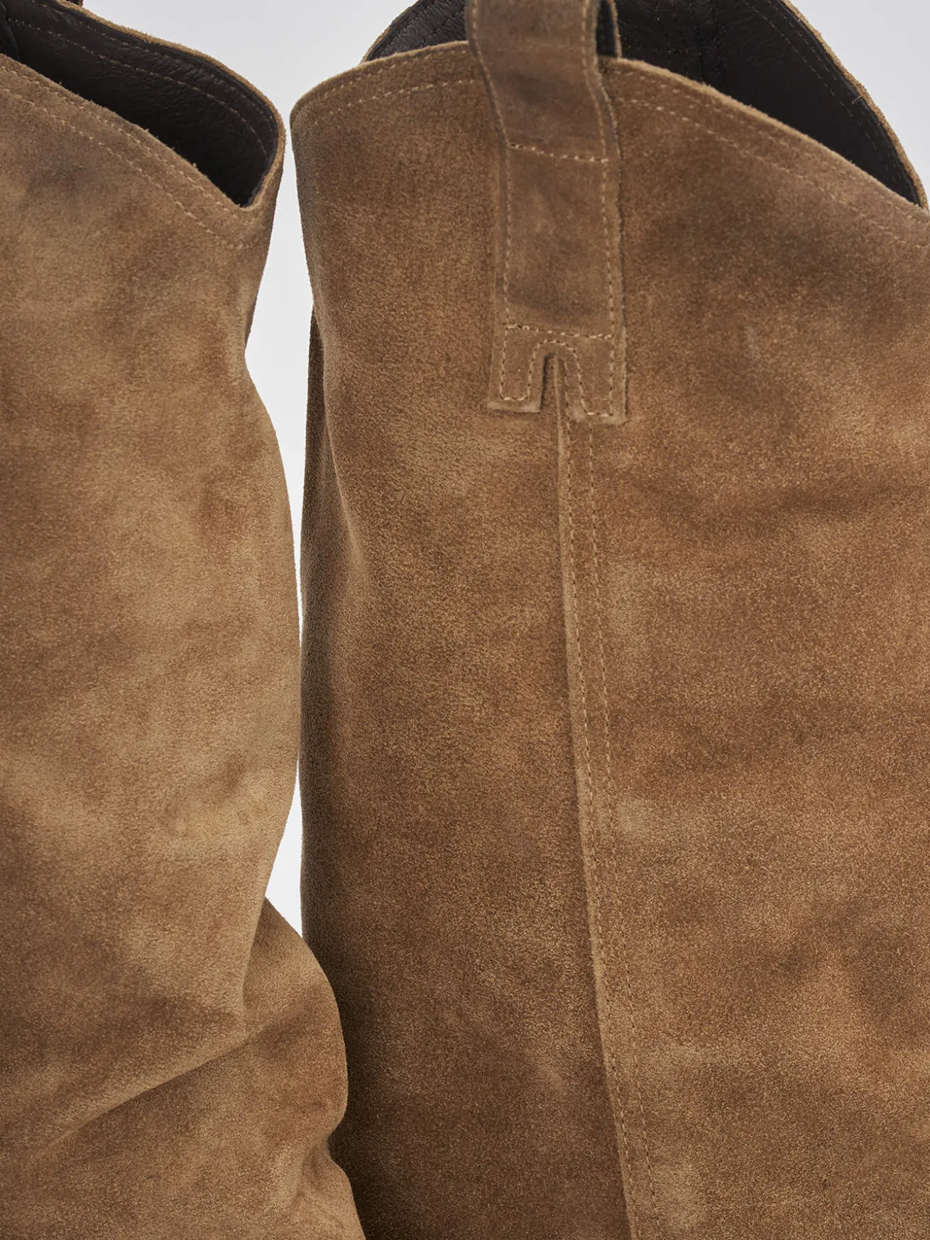 Stivale tacco 5 cm fondo in gomma e soletto interno in vera pelle. Tomaia in morbida pelle scamosciata, punta sfilata, cuciture ben visibili, ghette ai lati, stile texano e largo gambale che misura appena sotto il ginocchio per un look cool.