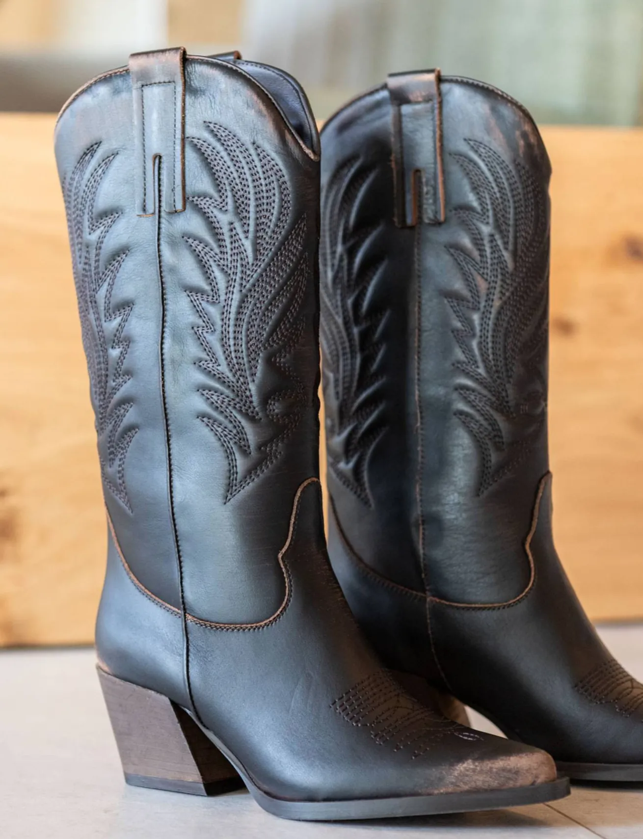 Realizzati in morbida pelle Texas, presentano una tomaia con cuciture a mano in rilievo e ricami in tinta che decorano la punta e il gambale.