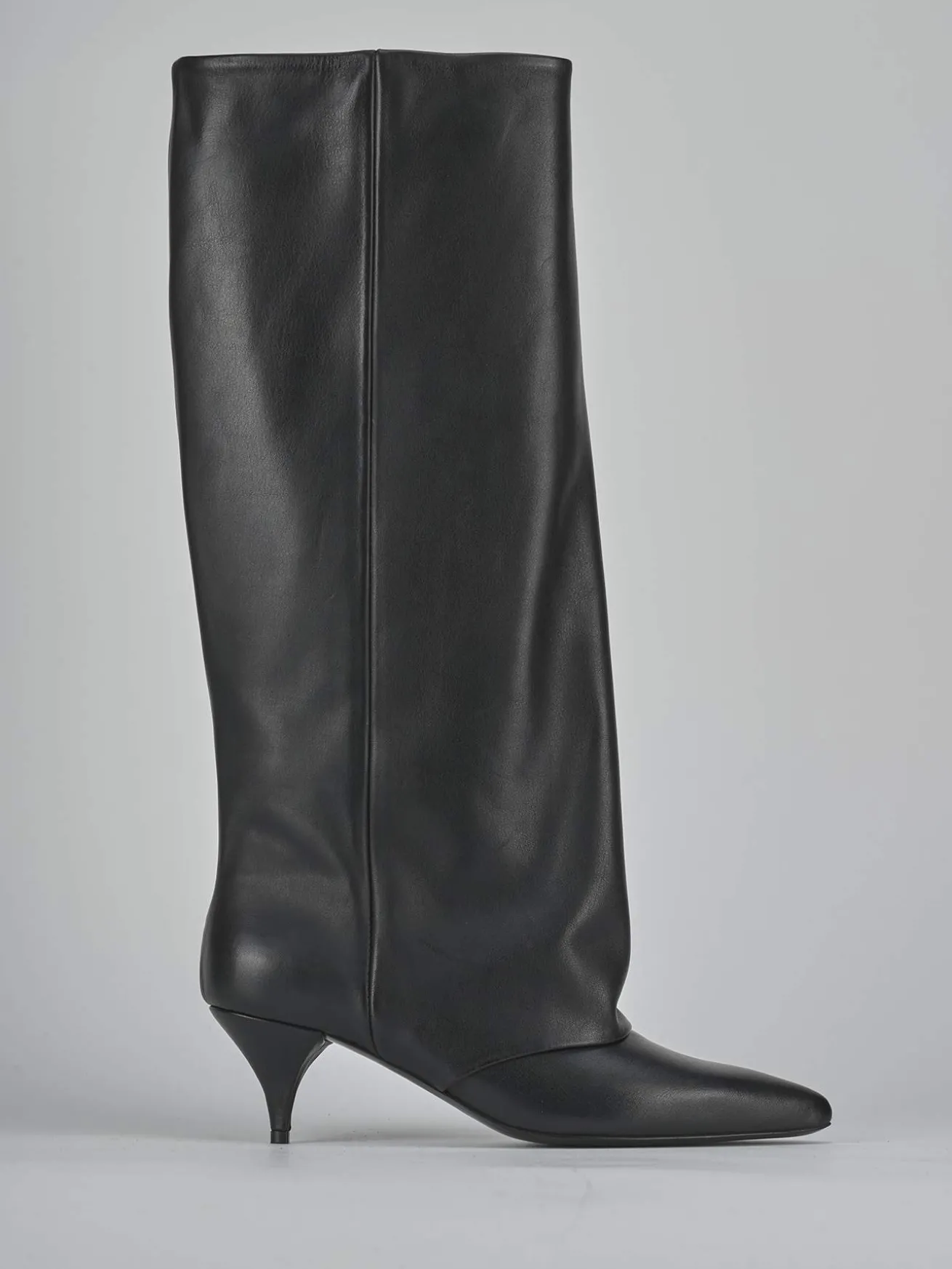 Stivale tacco 5 cm fondo in cuoio e soletto interno in vera pelle. Tomaia in morbida nappa , punta sfilata, cuciture visibili, altezza gambale fino al ginocchio ricoperto da un risvolto fino al tacco e tacco fino rocchetto. Per un look cool.