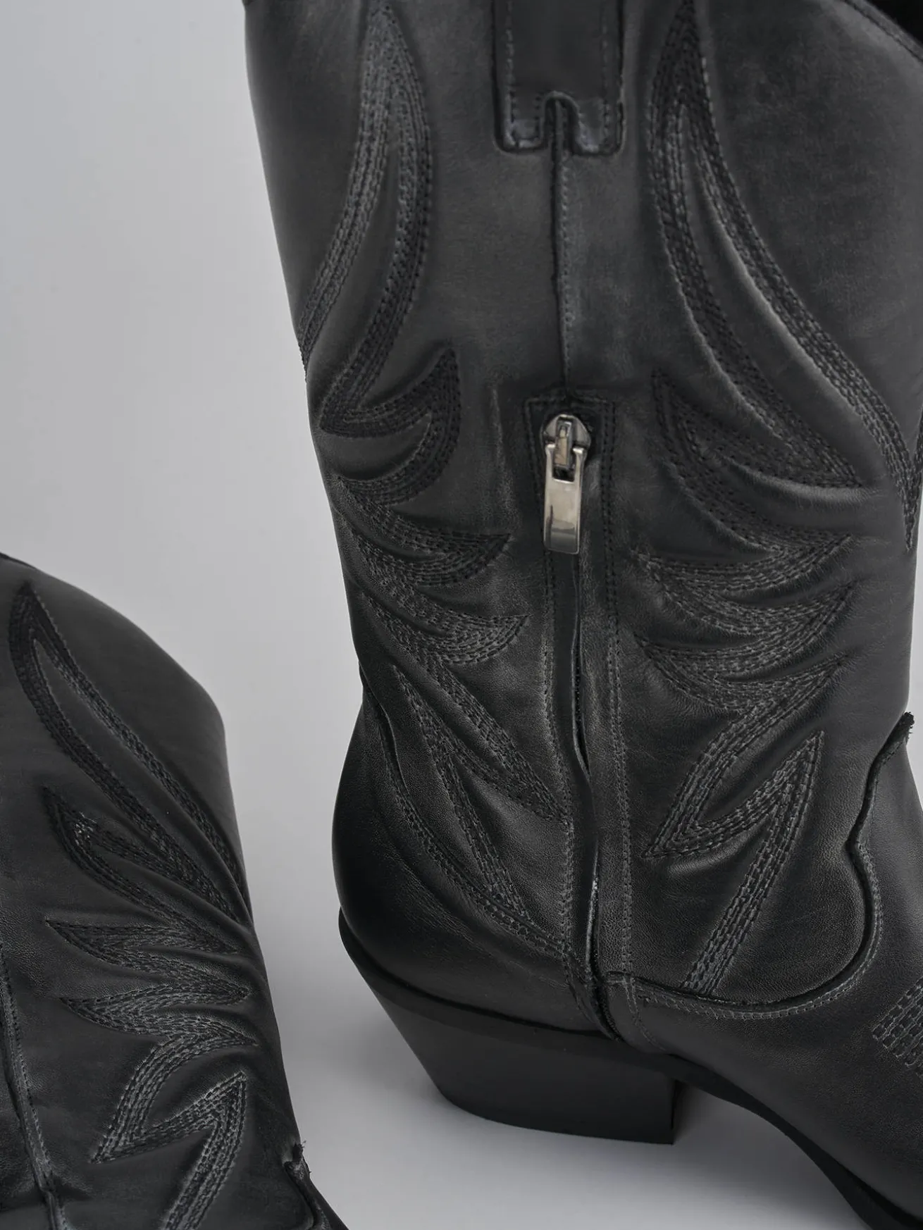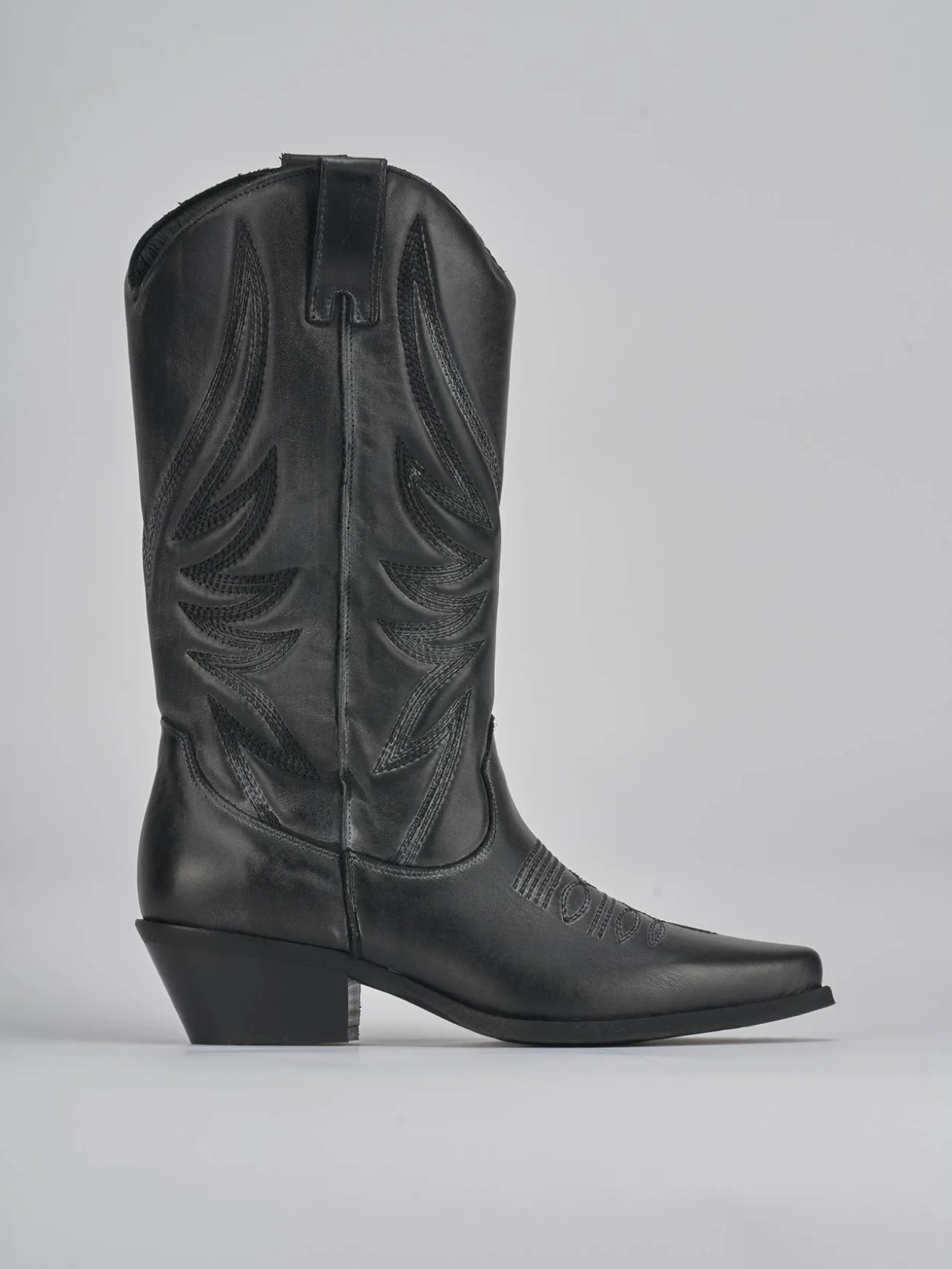 Stivale tacco 5 cm fondo in gomma e soletto interno in vera pelle. Tomaia in morbido vitello, punta sfilata, raffinati ricami sul collo del piede e sul gambale che misura 3/4 del polpaccio. dettaglio del guardolo sporgente, ghette e comoda cerniera laterale. perfetto con una gonna o pantaloni ampi a pinocchietto.