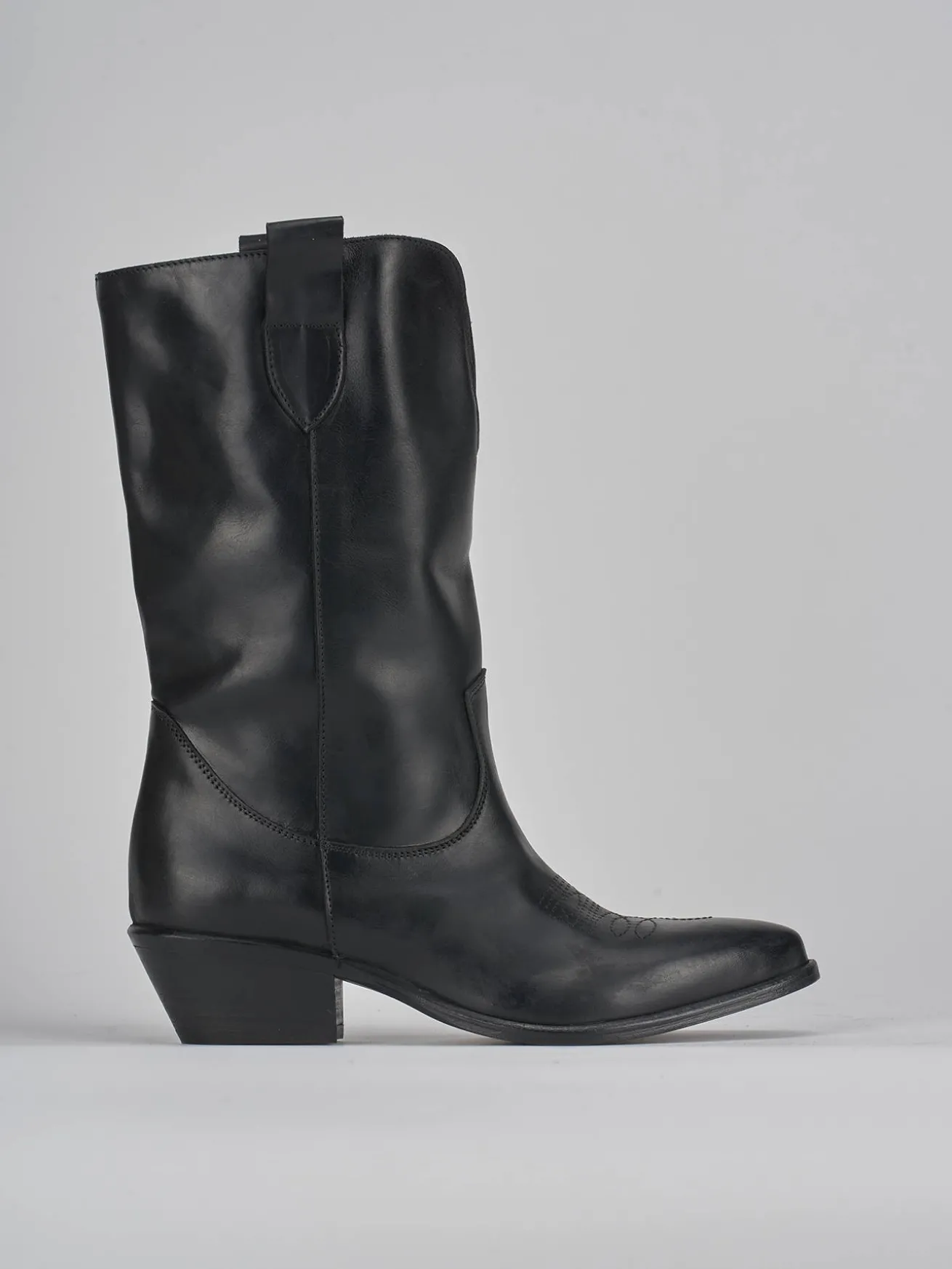 Stivale texano tacco 5 cm fondo in cuoio e soletto interno in vera pelle. Tomaia in pelle di ottima qualità, punta sfilata, ricami in tinta sulla punta del piede, ghette e apertura frontale a forma di V sul gambale per un tex look cool. altezza gambale a 3/4 del polpaccio.