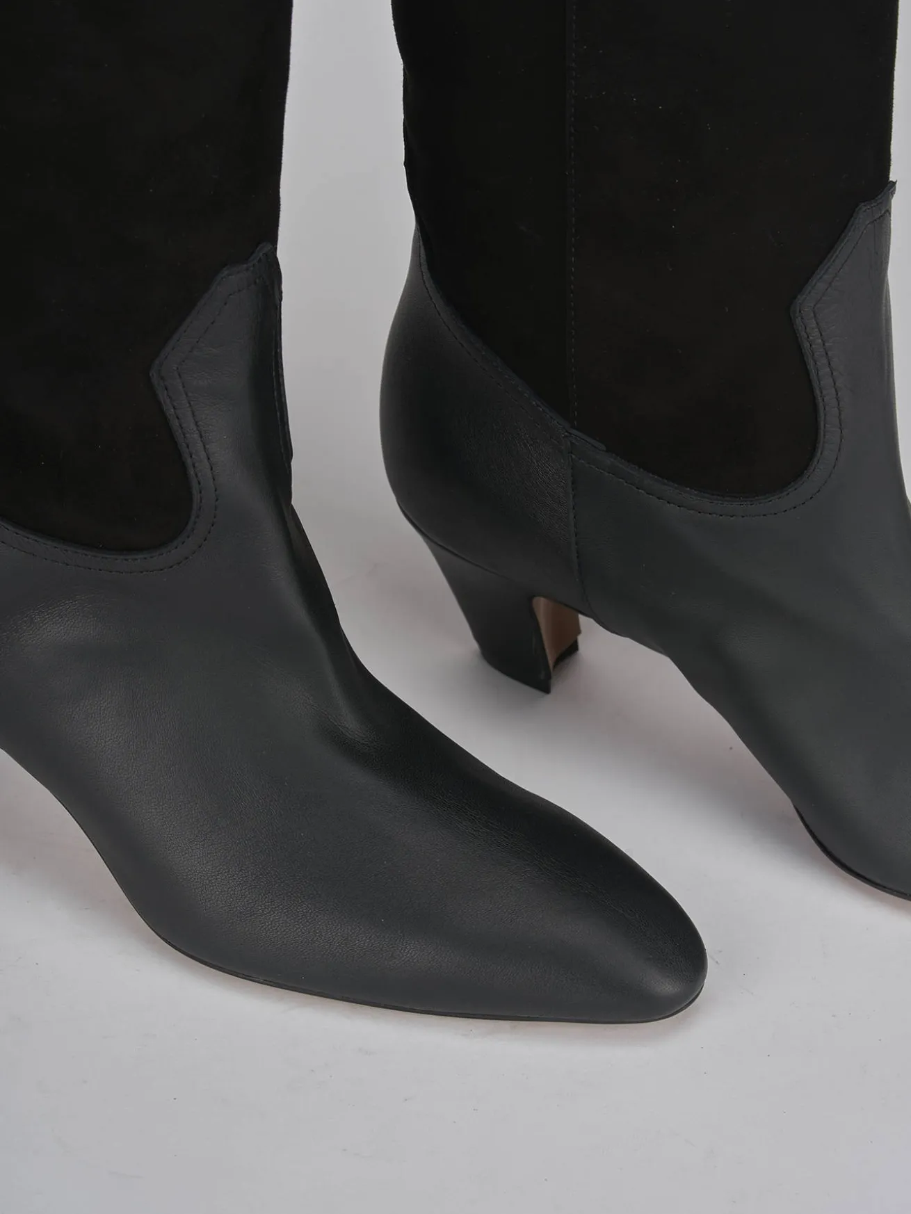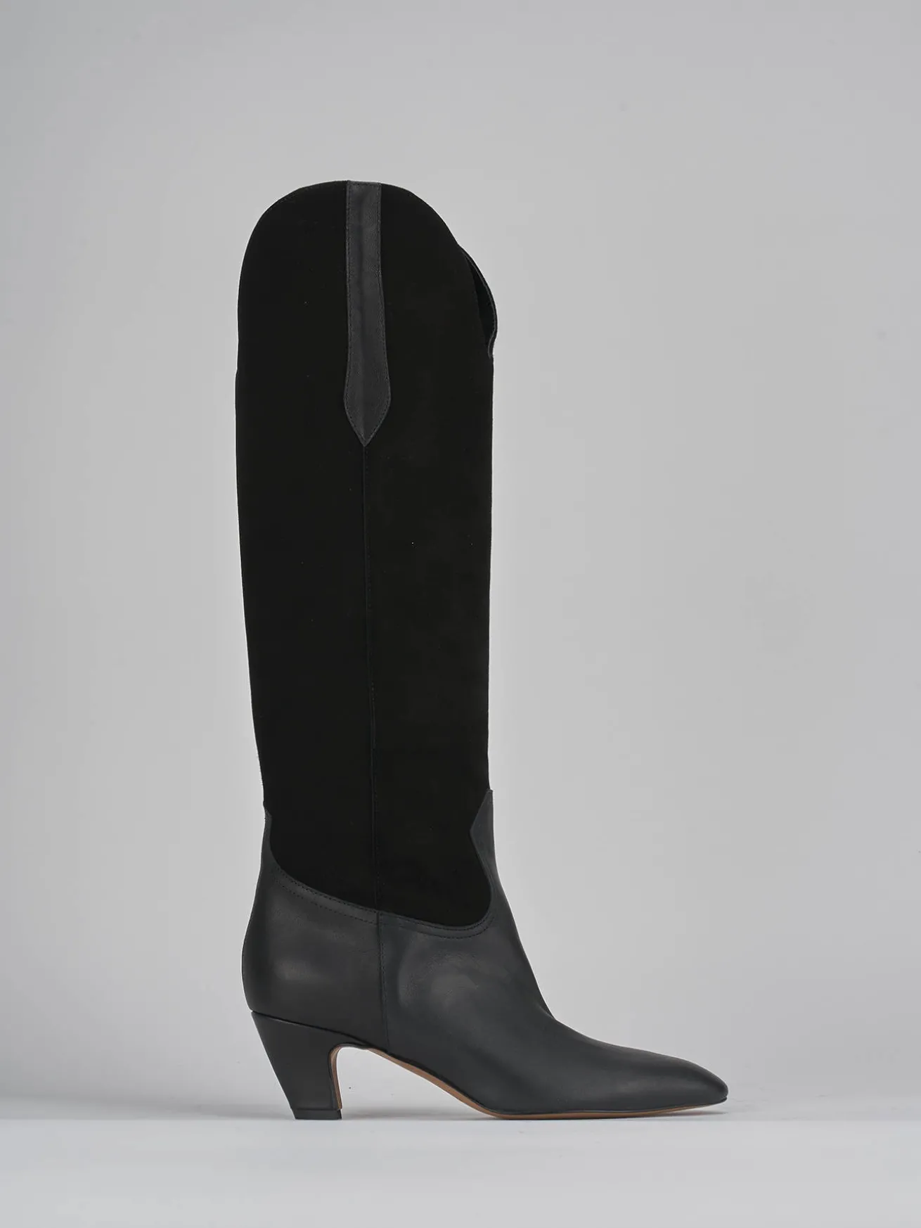 Stivale tacco 5 cm fondo in gomma e soletto interno in vera pelle. Tomaia in morbida pelle, punta sfilata, cuciture visibili, ghette, gambale scamosciato che misura appena sotto il ginocchio con apertura a V per un richiamo allo stile texano.