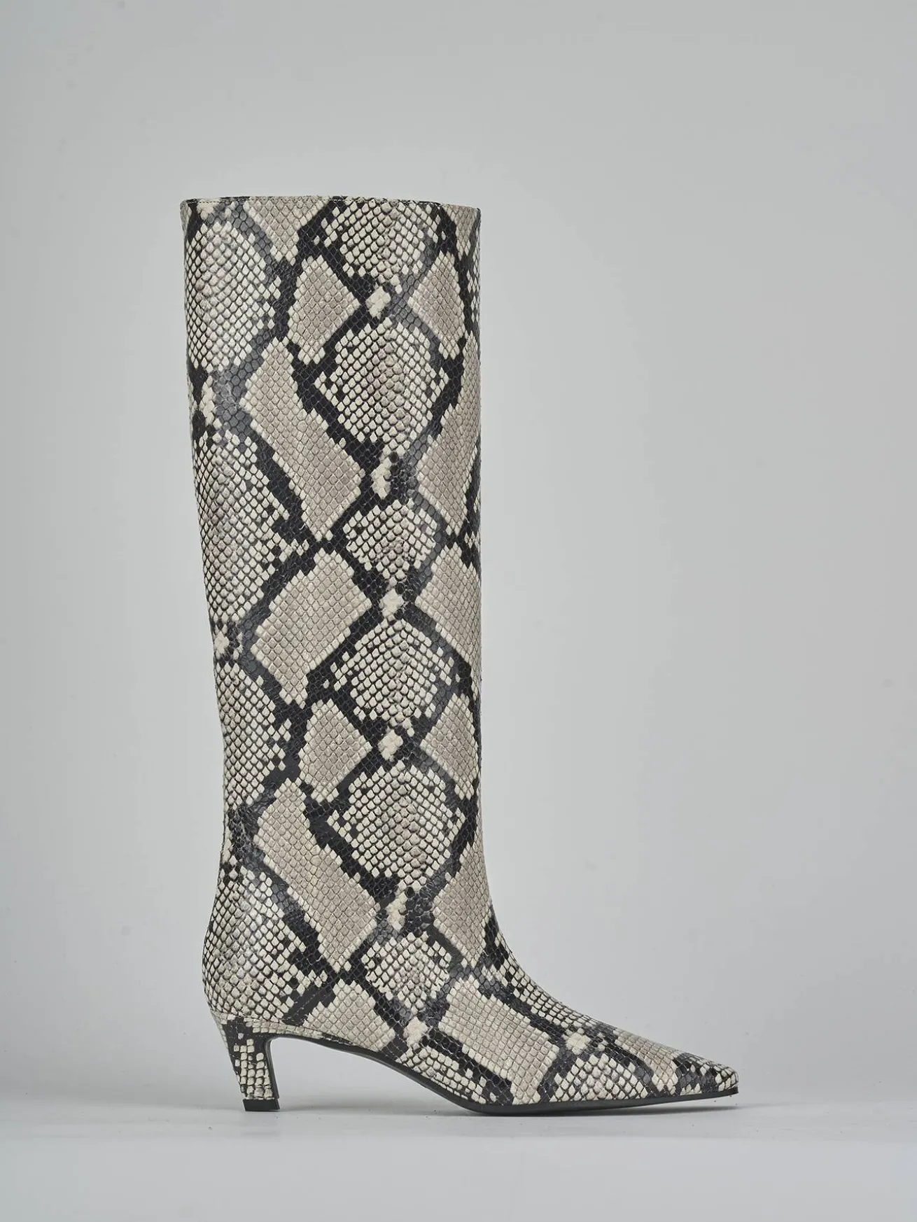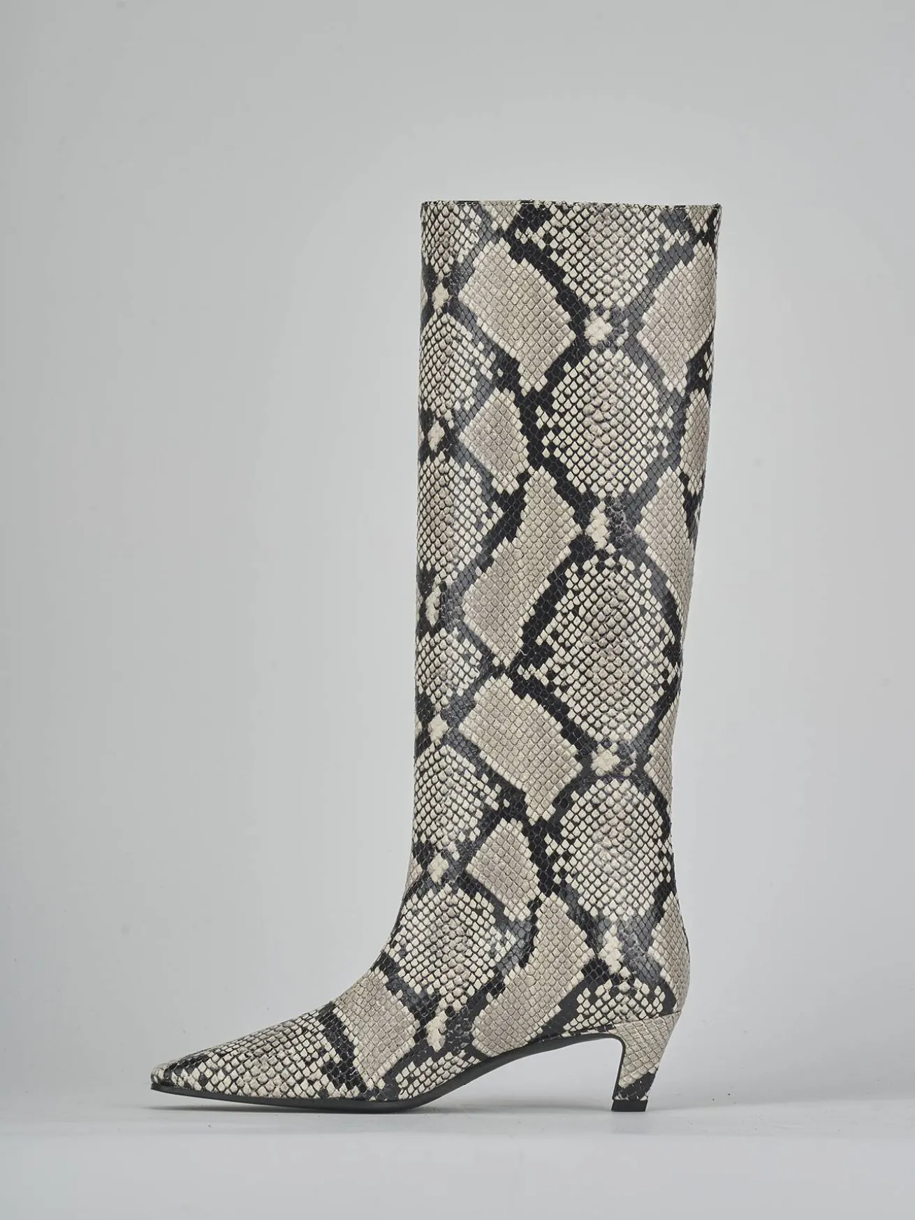 La punta sfilata e le cuciture a mano sul gambale tubolare, che arriva appena sotto il ginocchio, esaltano l’artigianalità del design.
