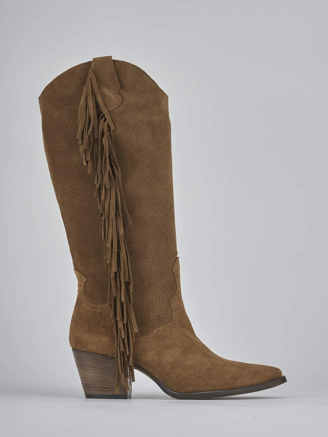 Stivale texano tacco 6 cm fondo in gomma e soletto interno in vera pelle. Tomaia in morbida pelle scamosciata, punta sfilata, frange laterali, ghette che mantengono la forma del gambale che misura appena sotto il ginocchio e tacco cubano. Dal design ricercato per un look cool.