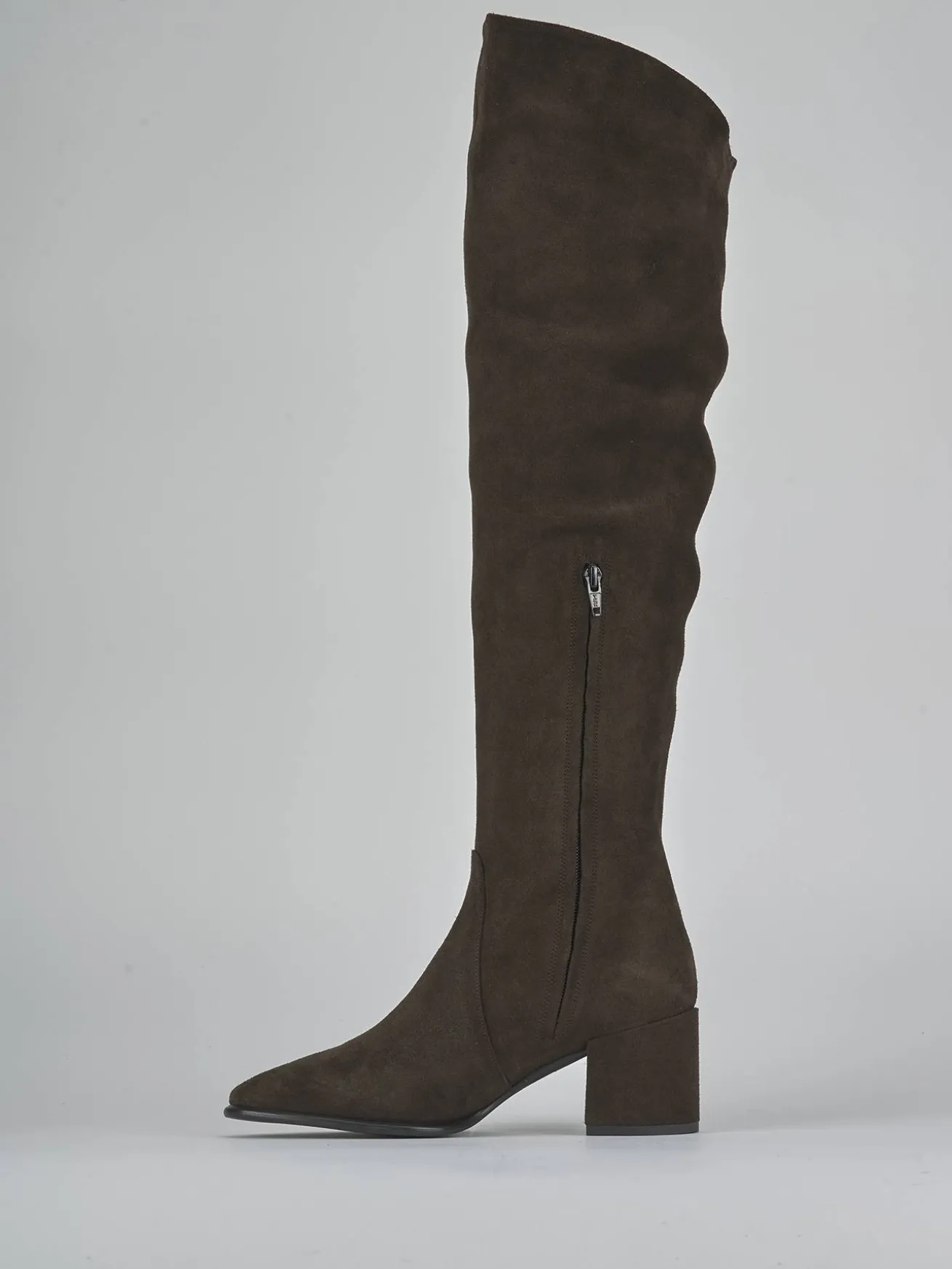 Realizzati in morbido camoscio color testa di moro, questi stivali sono il connubio ideale tra stile e comfort.