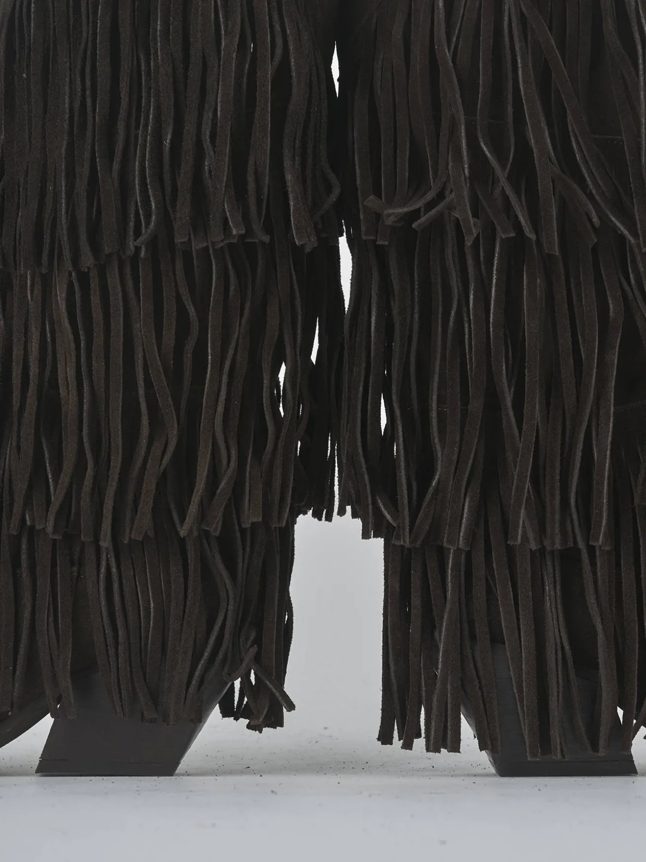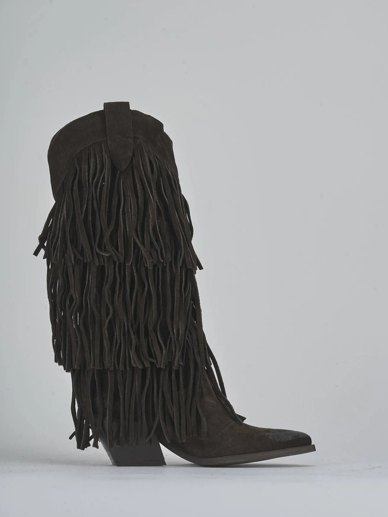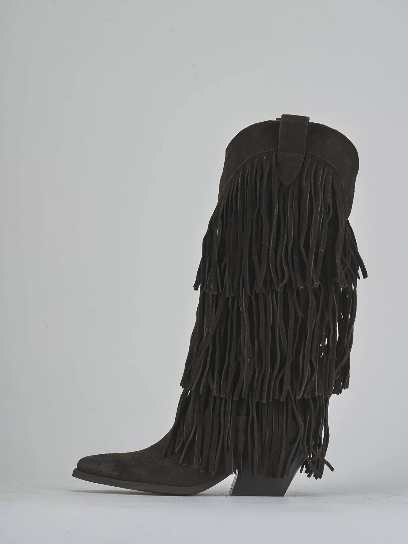 Realizzati in morbido camoscio, questi stivali presentano una punta sfilata e frange accattivanti che catturano l’attenzione a ogni passo.