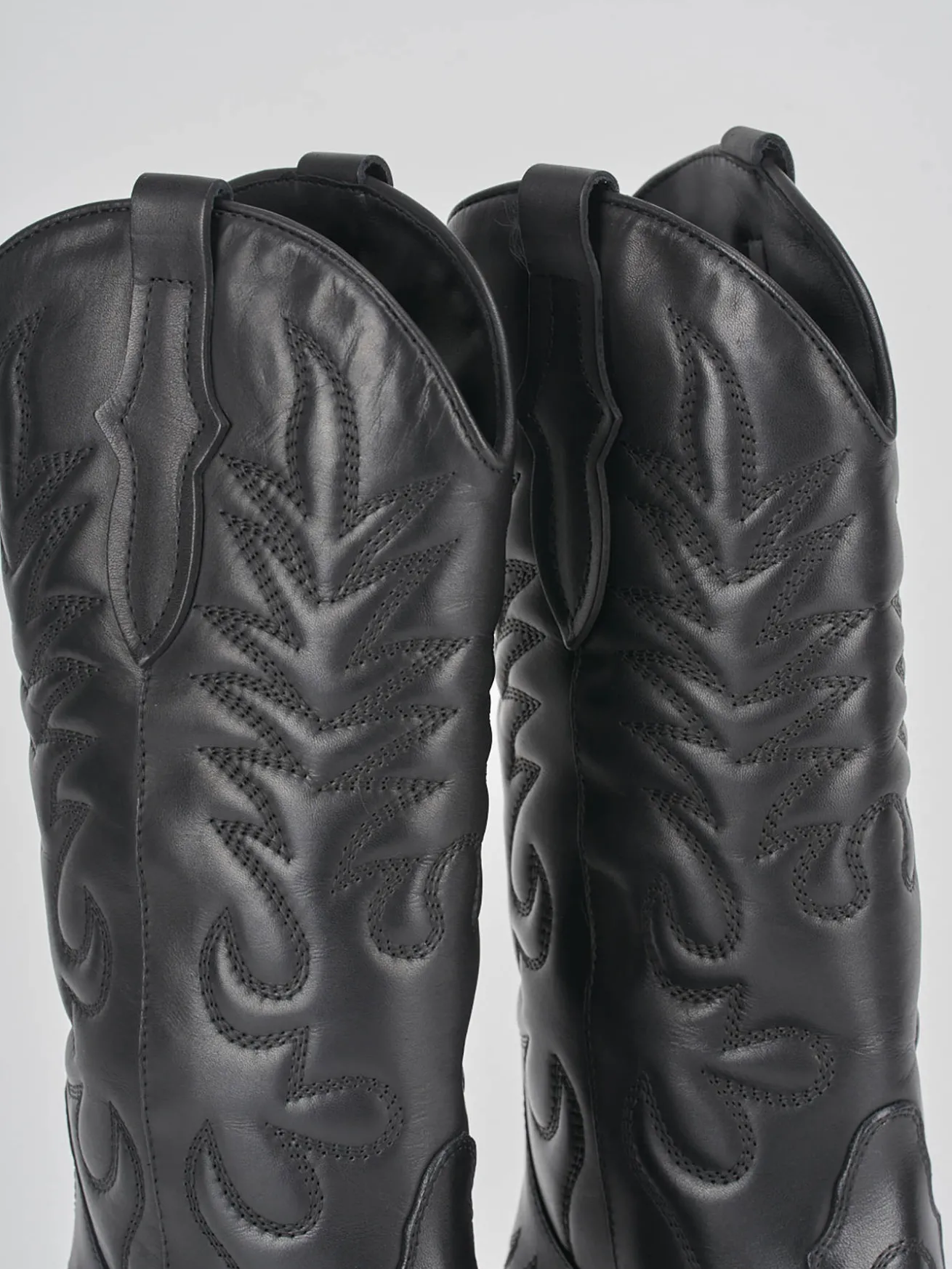 Stivale texano tacco 6 cm fondo in cuoio e soletto interno in vera pelle. Tomaia in morbida pelle, punta sfilata, ricami in tinta ghette che mantegono la forma del gambale che misura appena sotto il ginocchio. tacco cubano per un look cool.