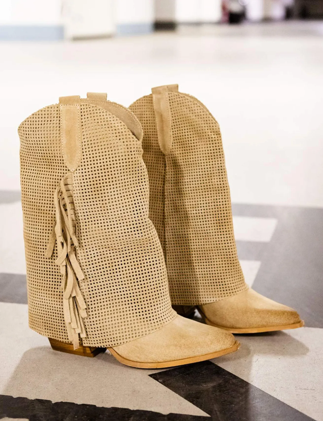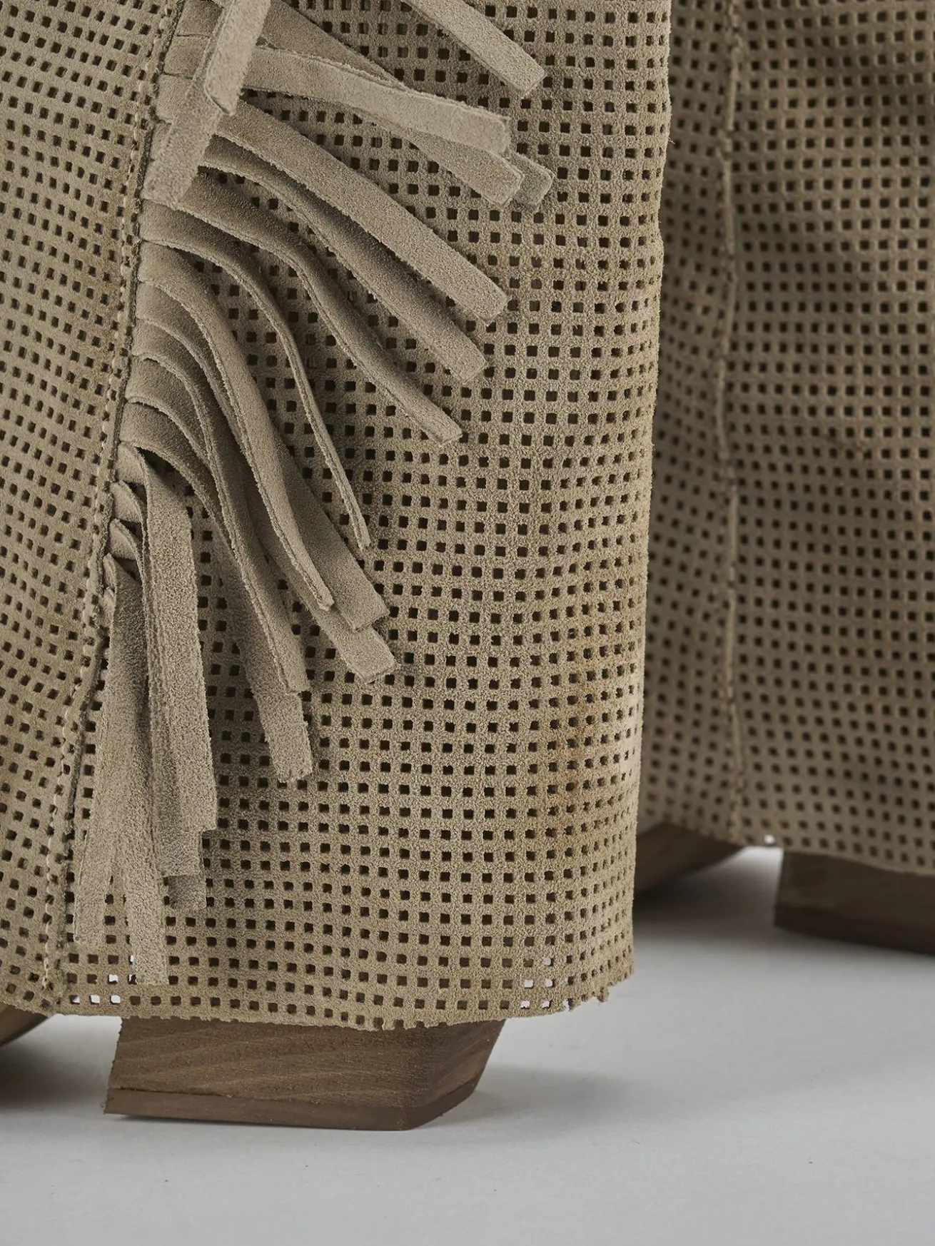 Stivale tacco 7 cm fondo in gomma e soletto interno in vera pelle. Tomaia in morbido camoscio, punta sfilata, cuciture a mano, forato, ghette laterati e frangia sul gambale che misura a 3/4 del polpaccio. Per un look trendy.