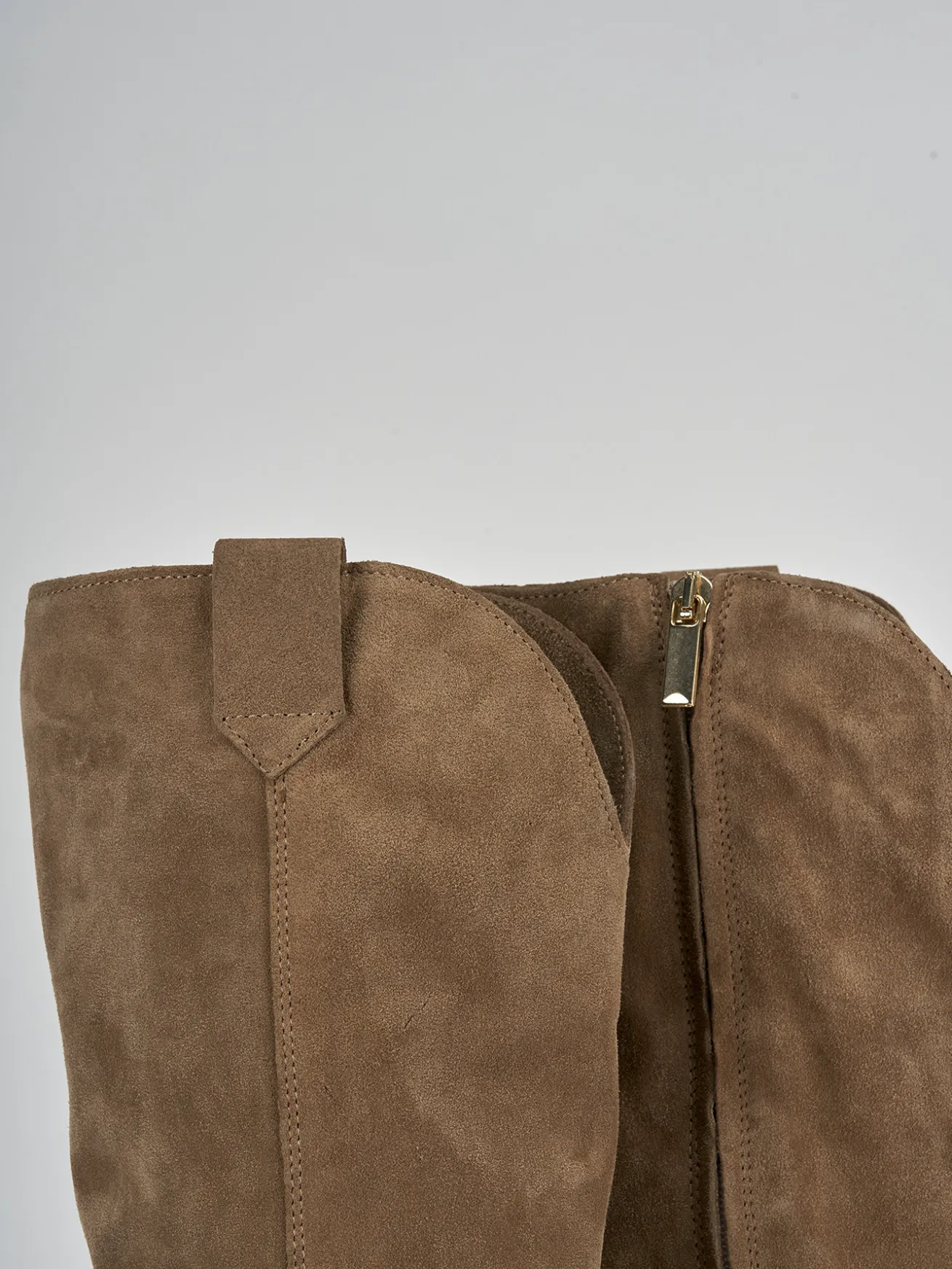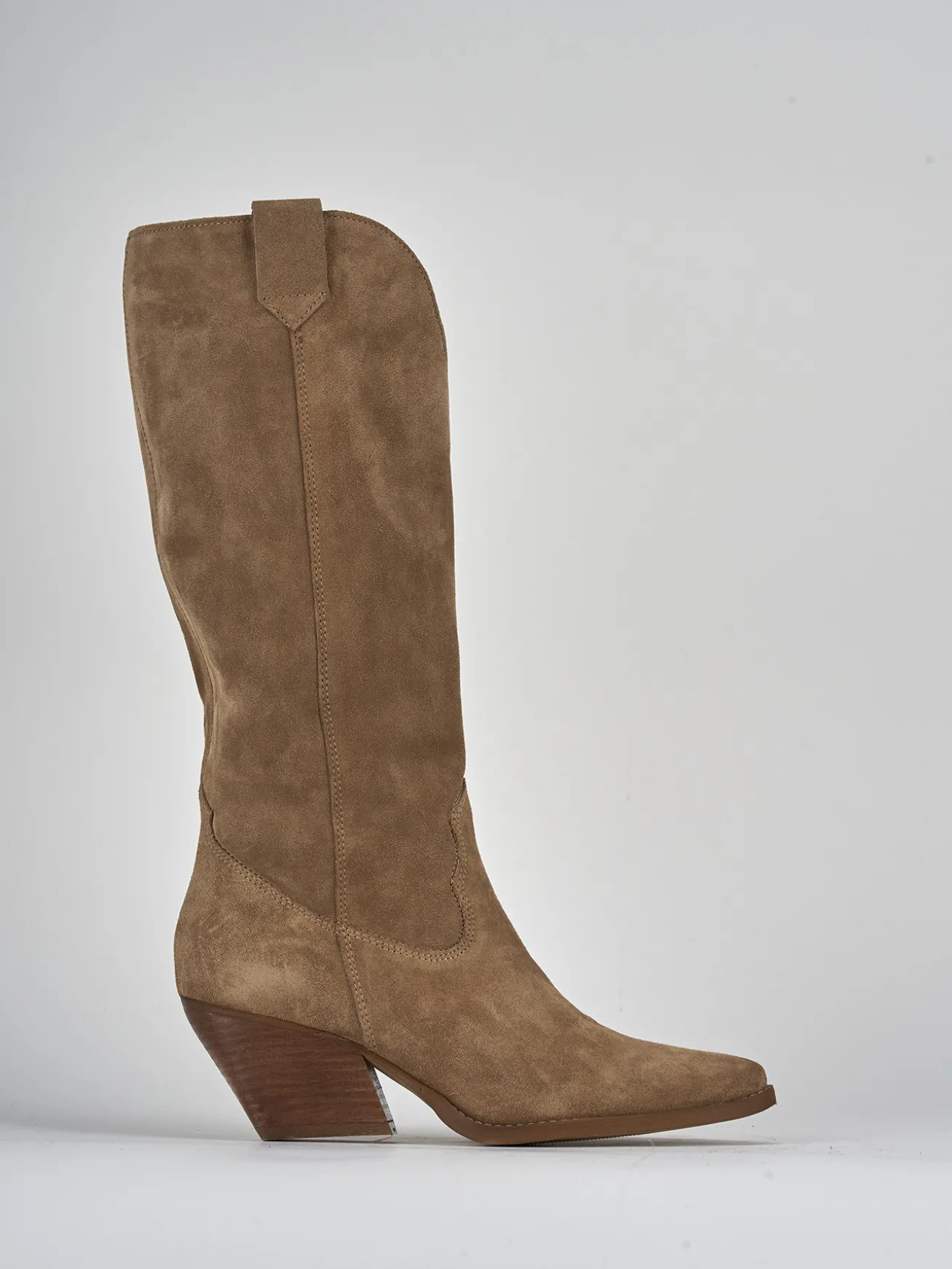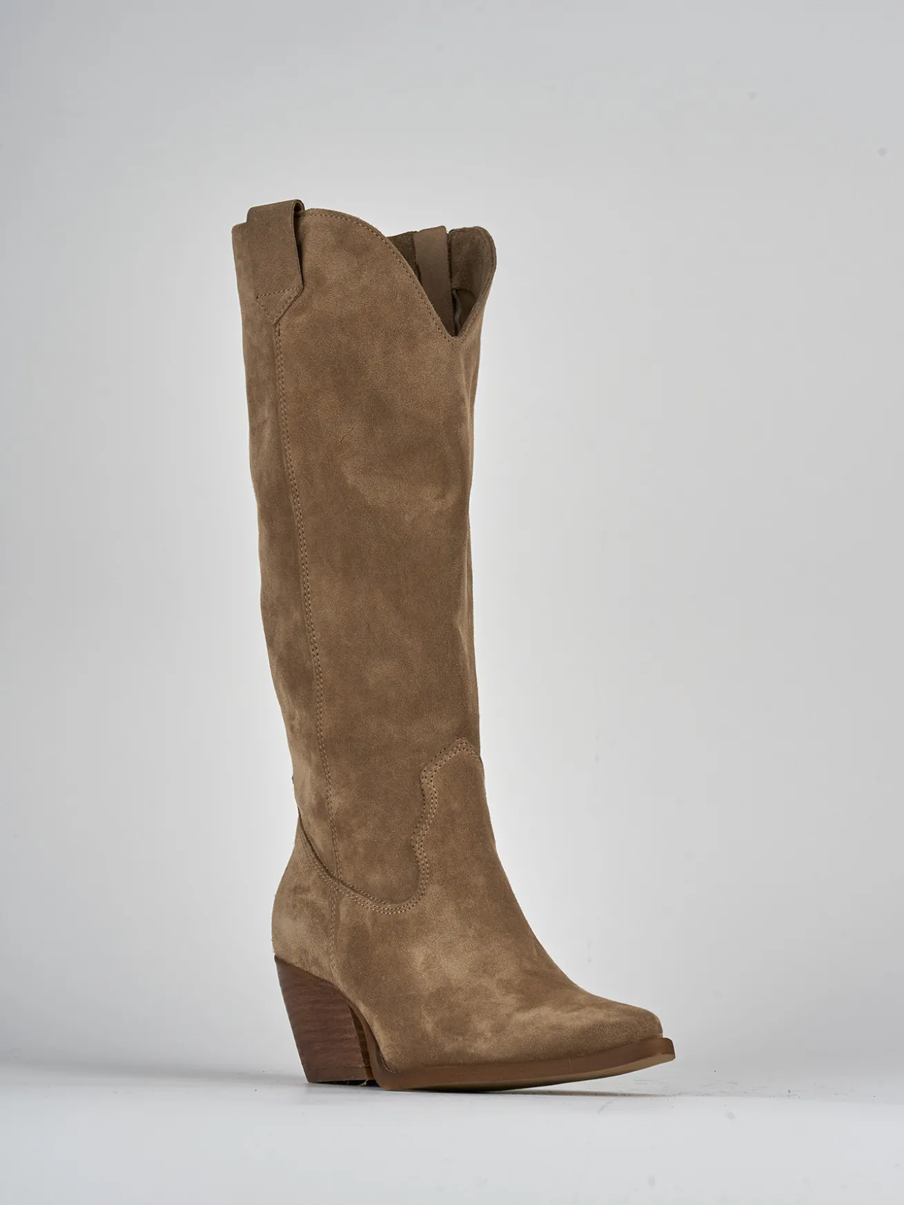 Stivale texano tacco 6.5 cm fondo in leggerissima gomma e soletto interno in vera pelle. tomaia in morbido camoscio, punta sfilata, cuciture a vista, piccolo spacco a ‘V’ frontale, cerniera laterale, ghette per sostenere gambale che misura appena sotto il ginocchio e tacco cubano. Perfetto per le tue occasioni più speciali.
