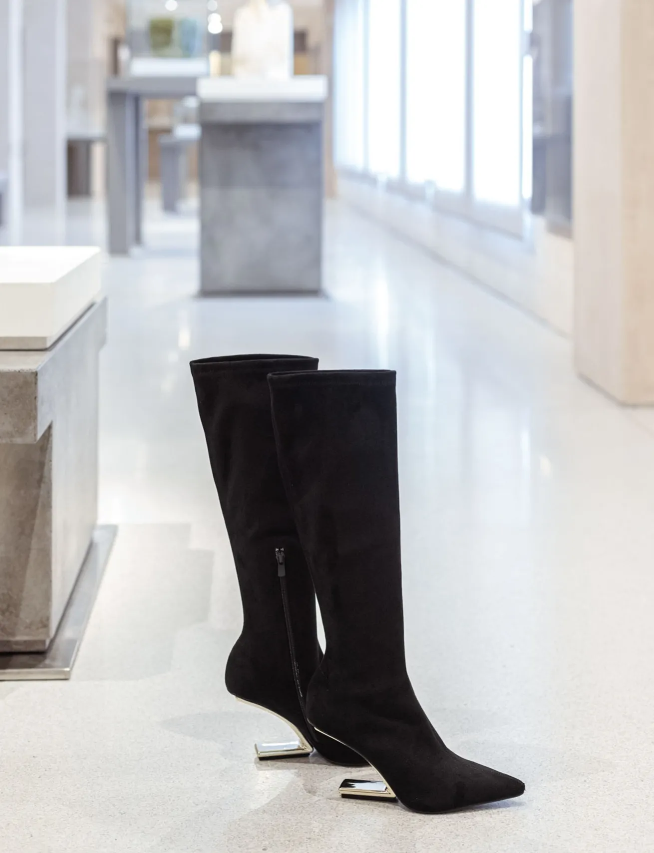 Stivale tacco 7 cm fondo in gomma e soletto interno in vera pelle. Tomaia in morbido camoscio, punta sfilata, cuciture raffinate, comoda cerniera laterale, gambale tubolare che misura appena sotto il ginocchio e nuovissimo tacco per uno stivale che non può mancare nella tua collezione.