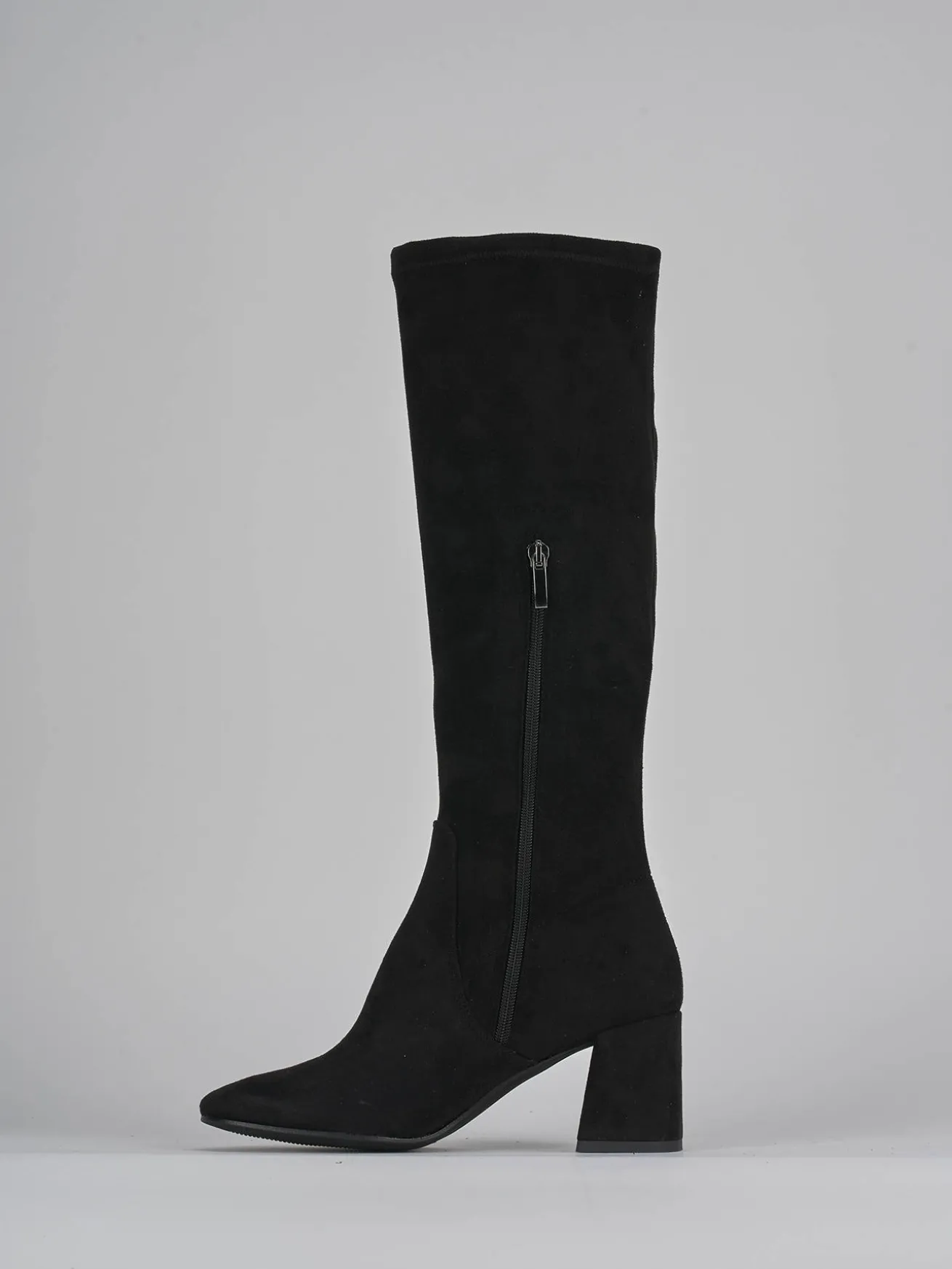 stivale tacco 7 cm fondo in leggera gomma e soletto interno in vera pelle. tomaia in morbido camoscio, punta affusolata, gambale tubolare che misura appena sotto il ginocchio, comoda cerniera laterale, cuciture a vista, tacco grosso. stivale passepartout che durerà negli anni.