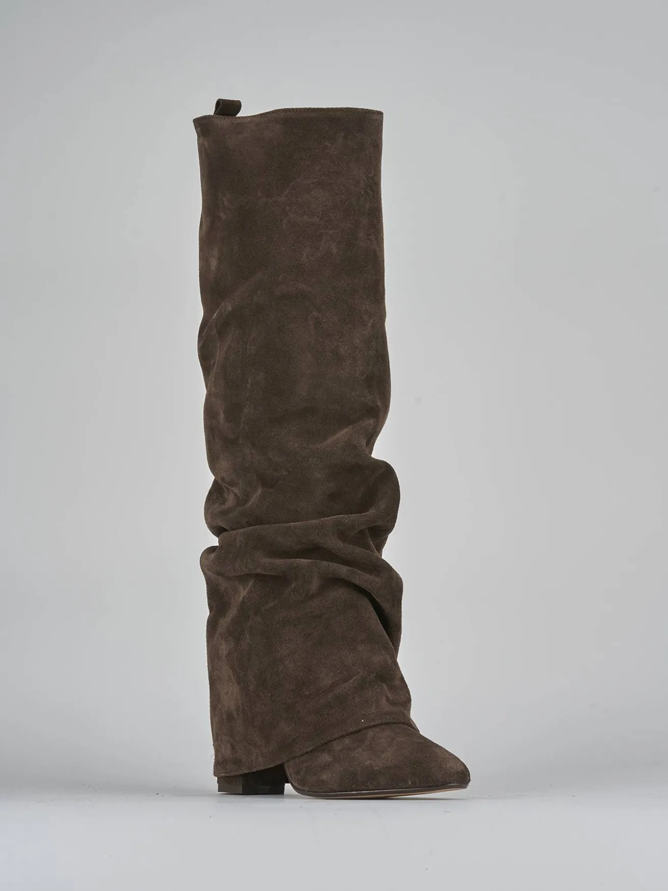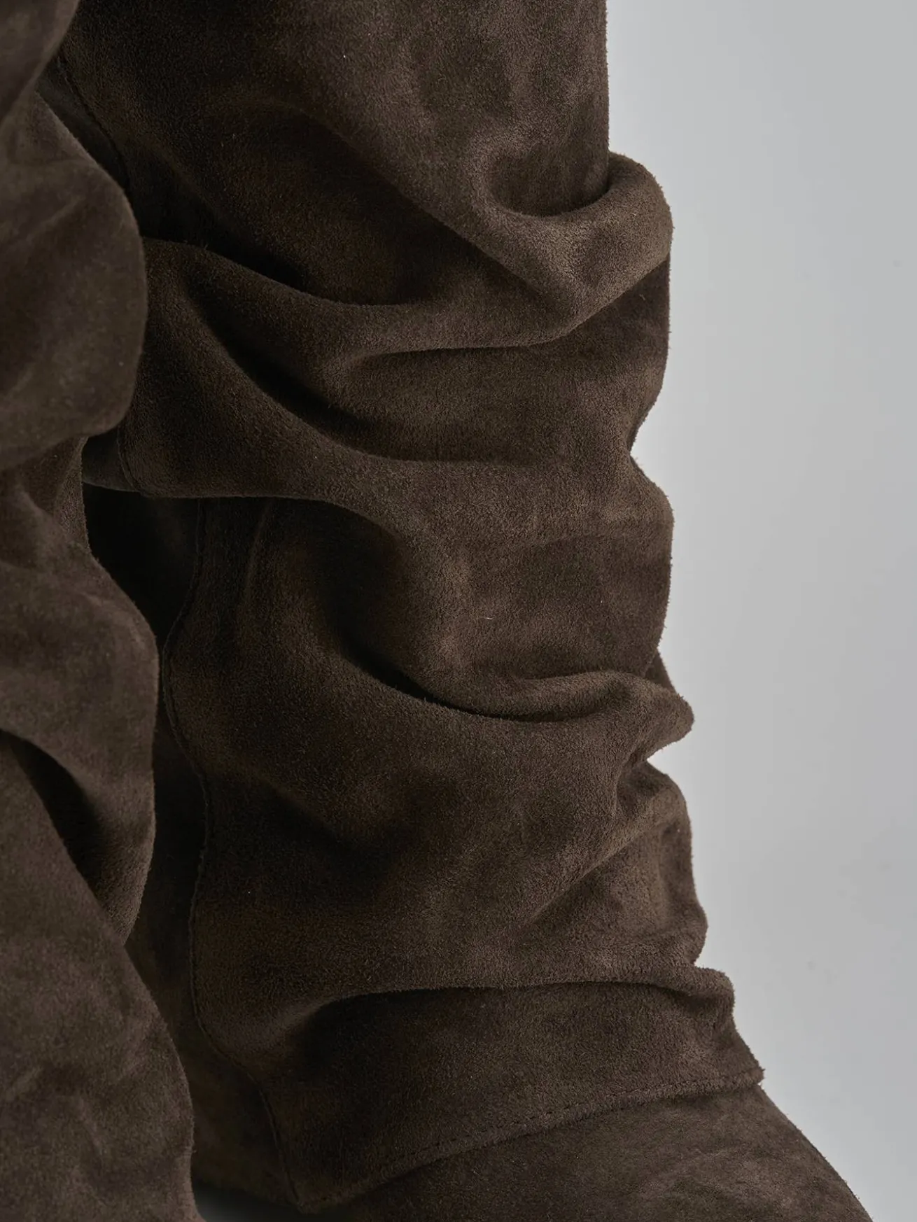 Realizzati in morbida pelle scamosciata color testa di moro, questi stivali da donna presentano un affascinante effetto arricciato.