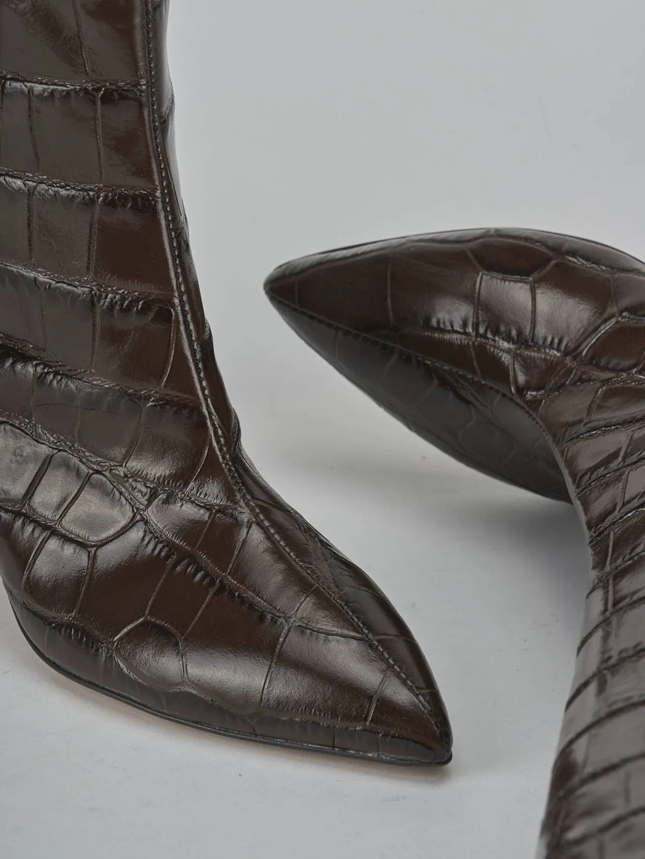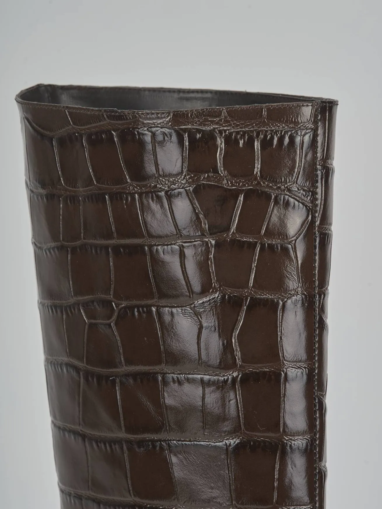 La punta sfilata e il nuovissimo tacco fino conferiscono un look chic e contemporaneo, mentre le cuciture a mano sul gambale, che arriva appena sotto il ginocchio, mostrano una cura artigianale nei dettagli.