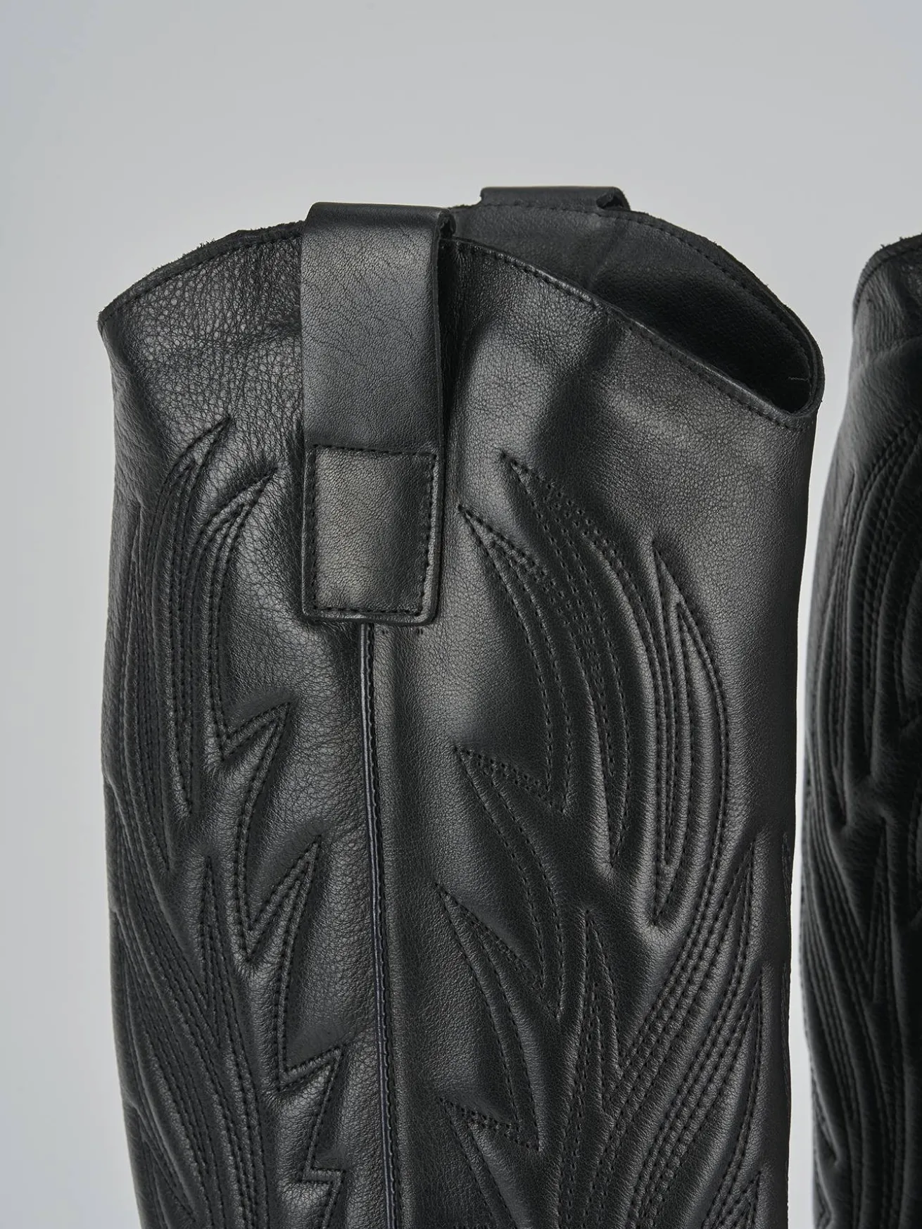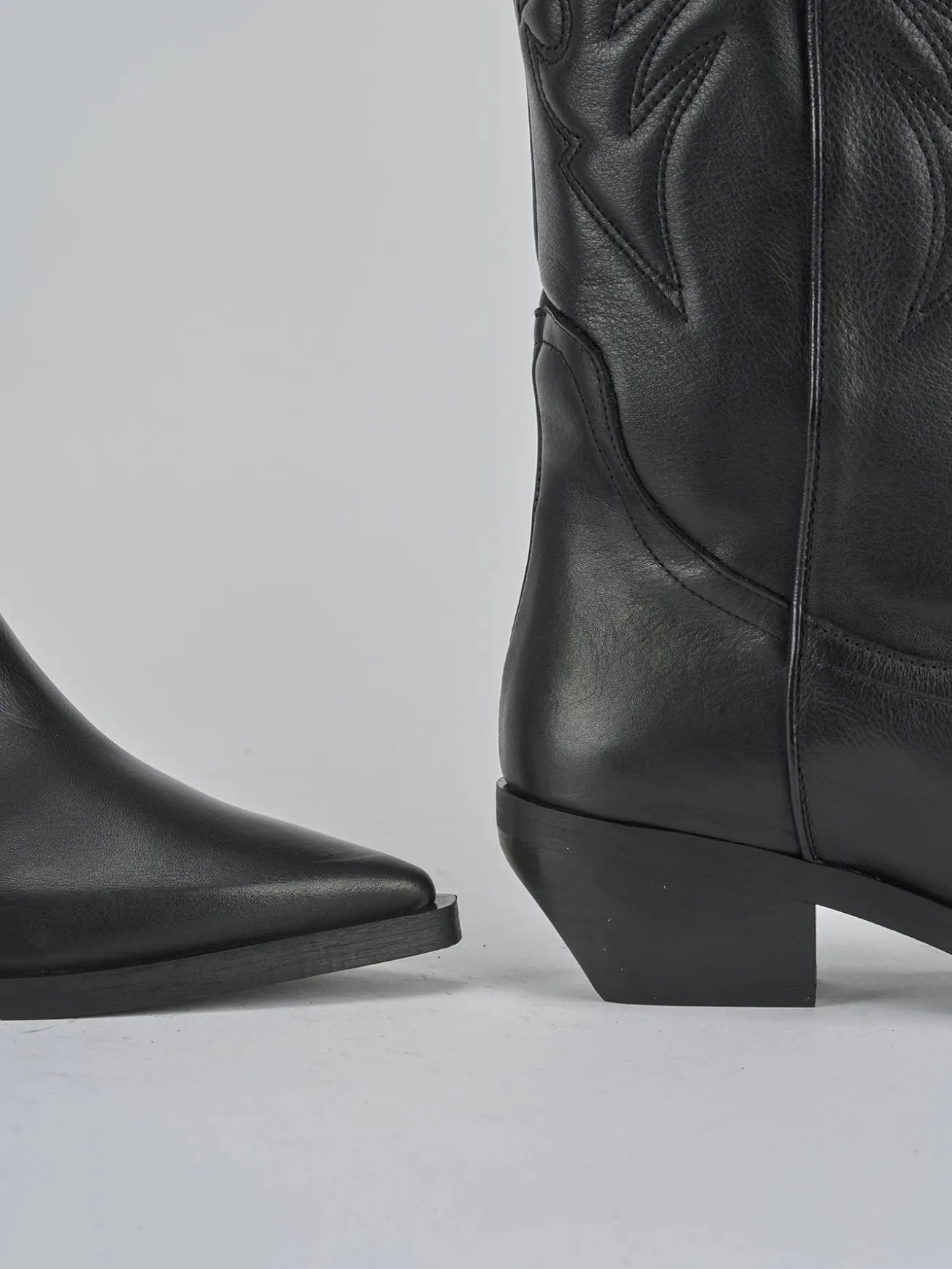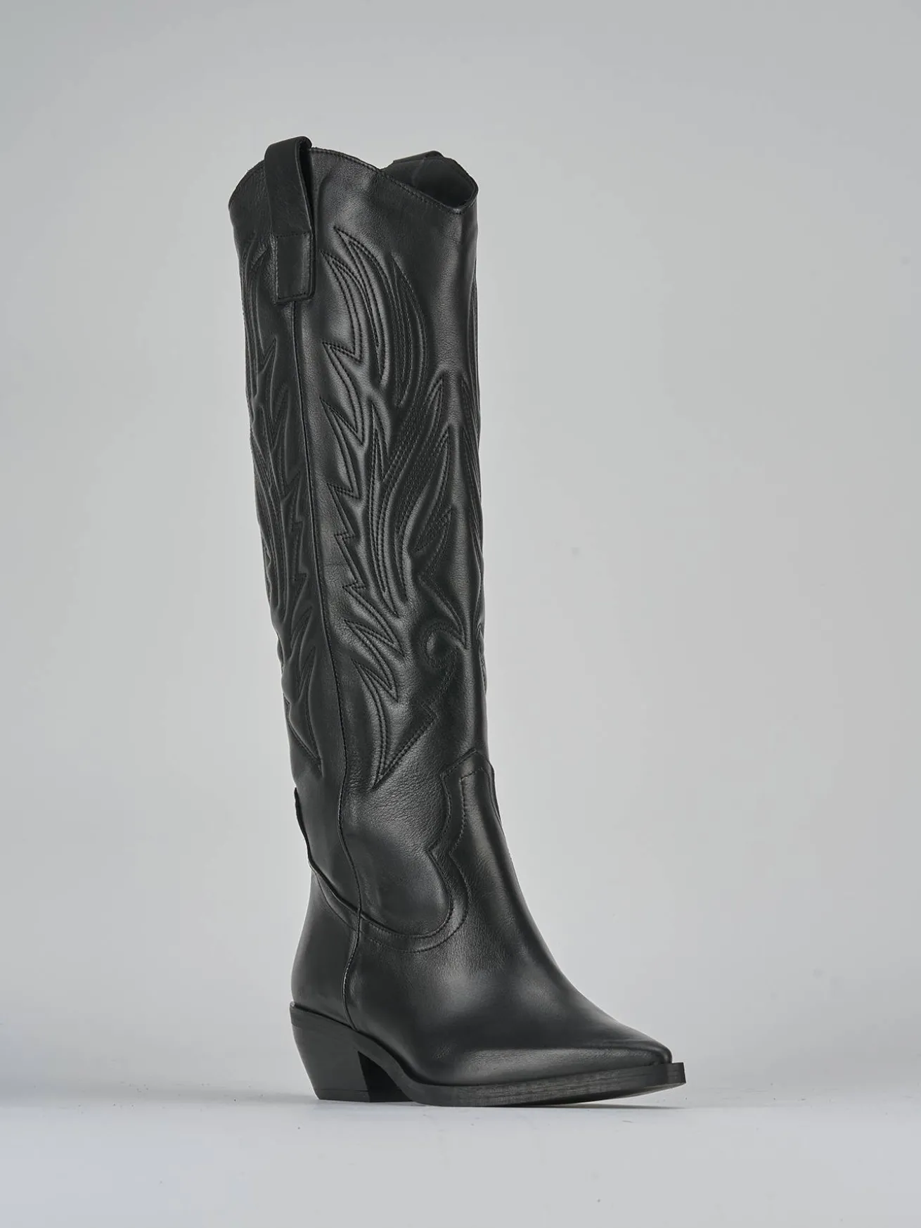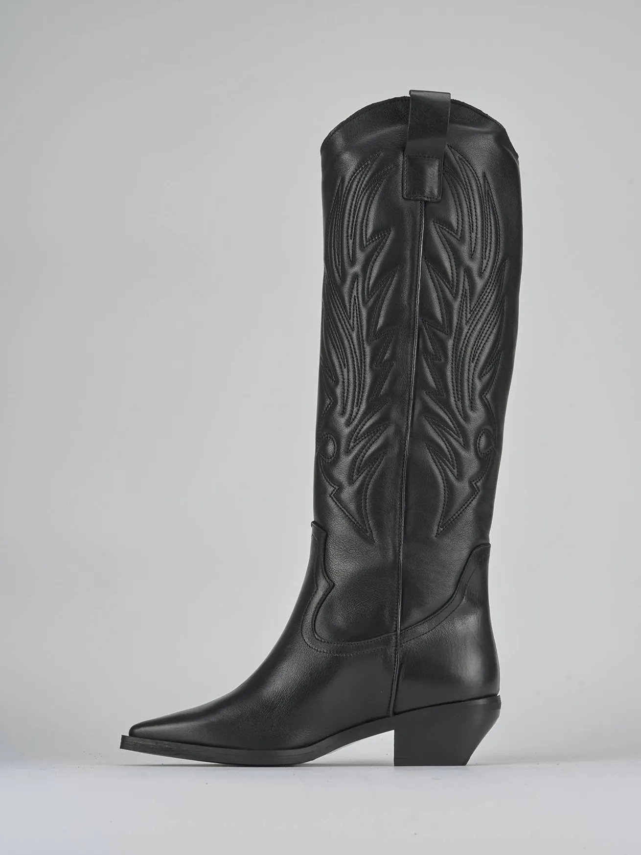 Le cuciture e i ricami sul gambale, che arriva appena sotto il ginocchio, donano un look distintivo e raffinato.