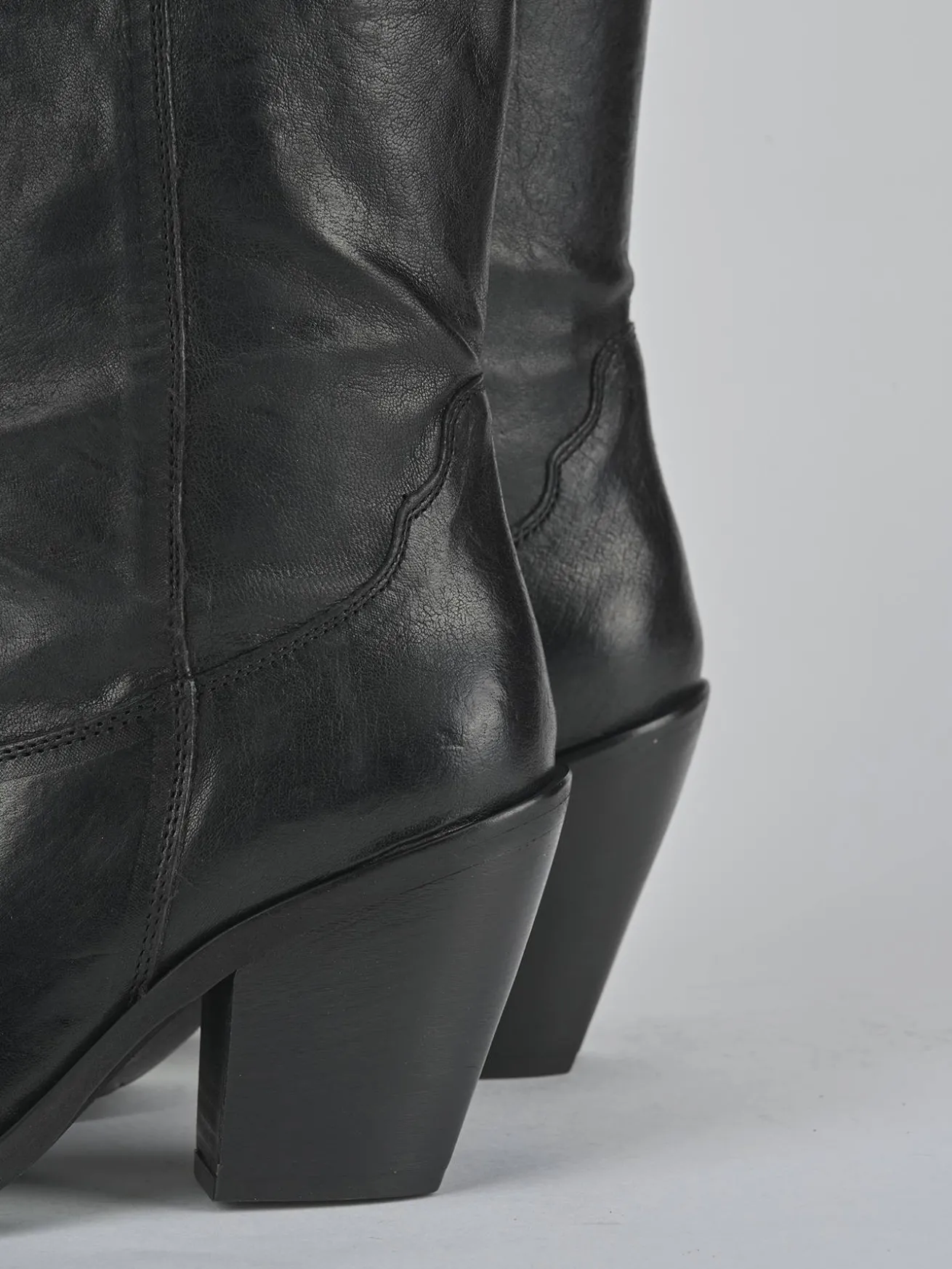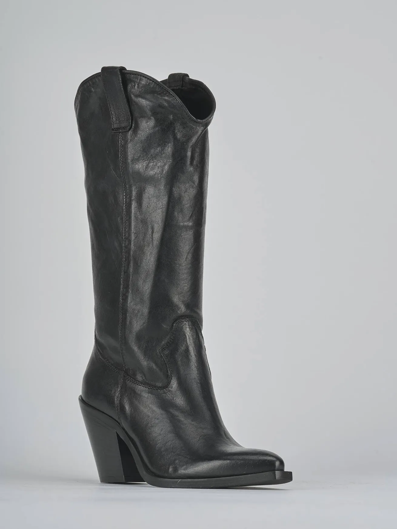 Stivale texano tacco 7 cm fondo in gomma e soletto interno in vera pelle. Tomaia in morbida pelle, punta sfilata, cuciture a mano, ghette che mantengono la forma del gambale che misura appena sotto il ginocchio. Comoda cerniera laterale e tacco cubano. Perfetto sia con un pantalone che con un vestito.
