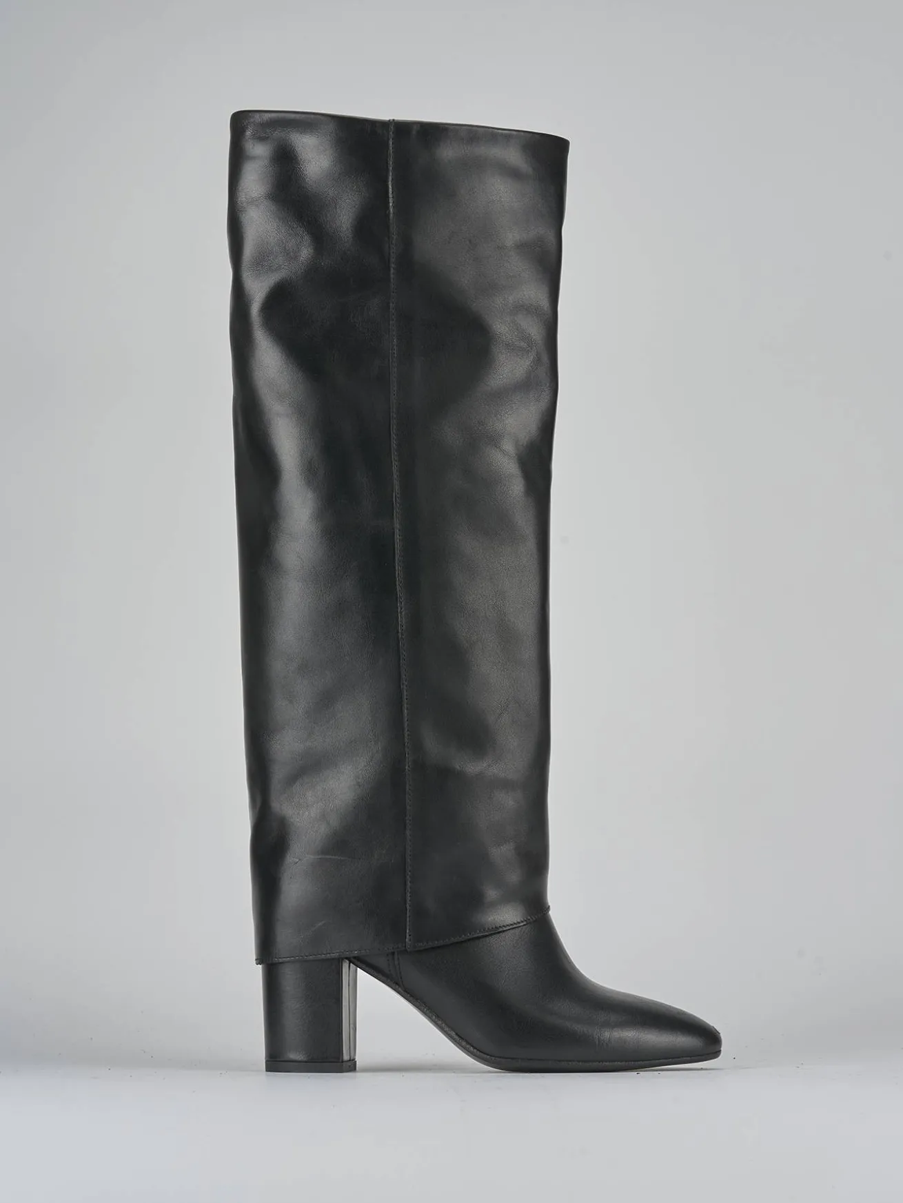 Questi eleganti stivali in pelle nera presentano un tacco di 7 cm, ideale per esaltare la femminilità e la sicurezza in ogni passo.