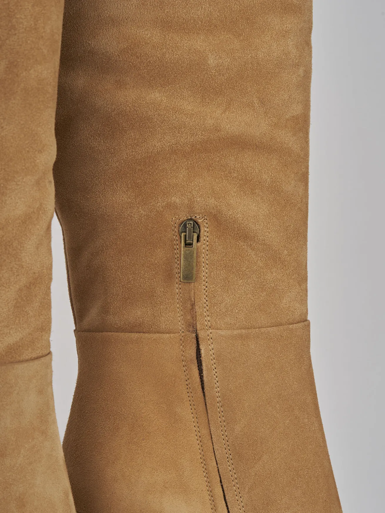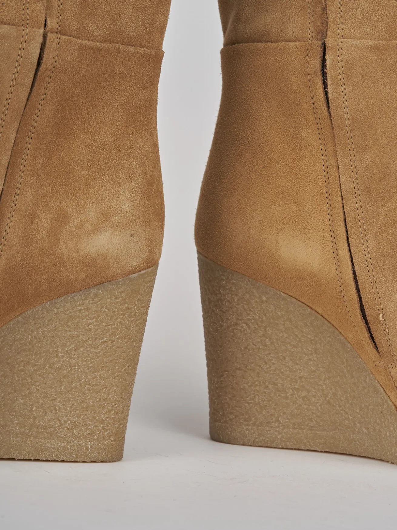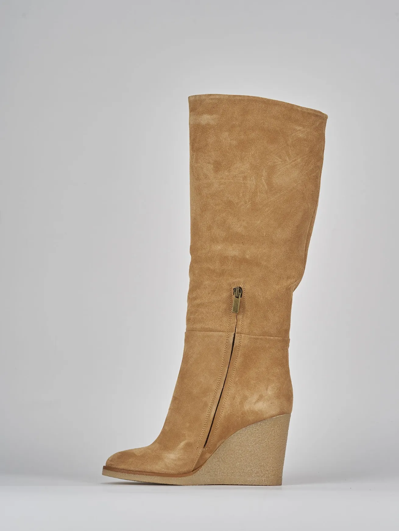 Stivale zeppa 8 cm fondo in gomma e soletto interno in vera pelle. Tomaia in morbido camoscio, punta affusolata, cerniera laterale, gambale tubolare che misura fino a sotto il ginocchio e zeppa a contrasto con 1 cm di plateau anteriore per un look cool.