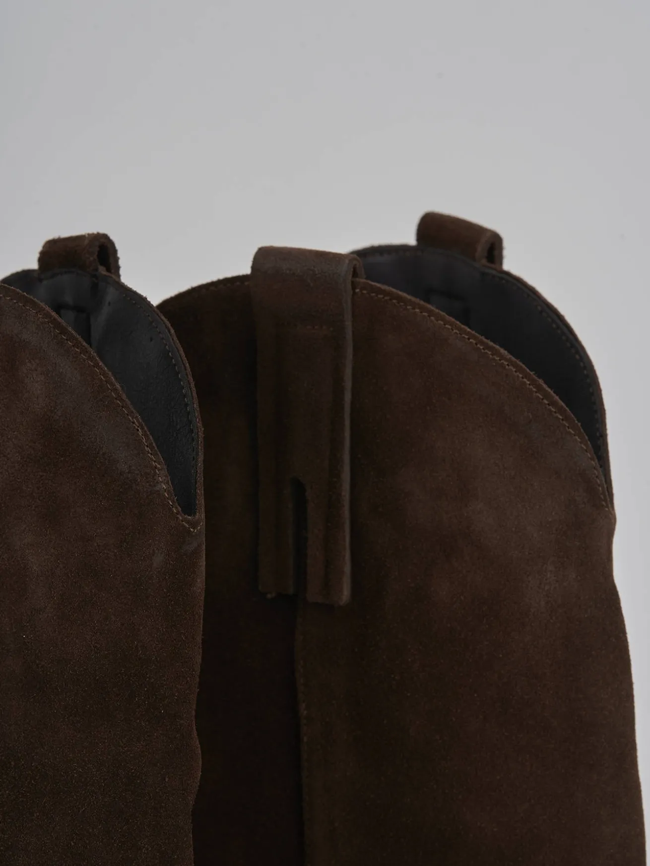 stivale tacco 8 cm fondo in gomma e soletto interno in vera pelle. tomaia in morbido camoscio, punta sfilata, stile texano, ghette per dare maggiore forma al gambale che misura appena sotto il ginocchio e tacco cuban per un look davvero cool.