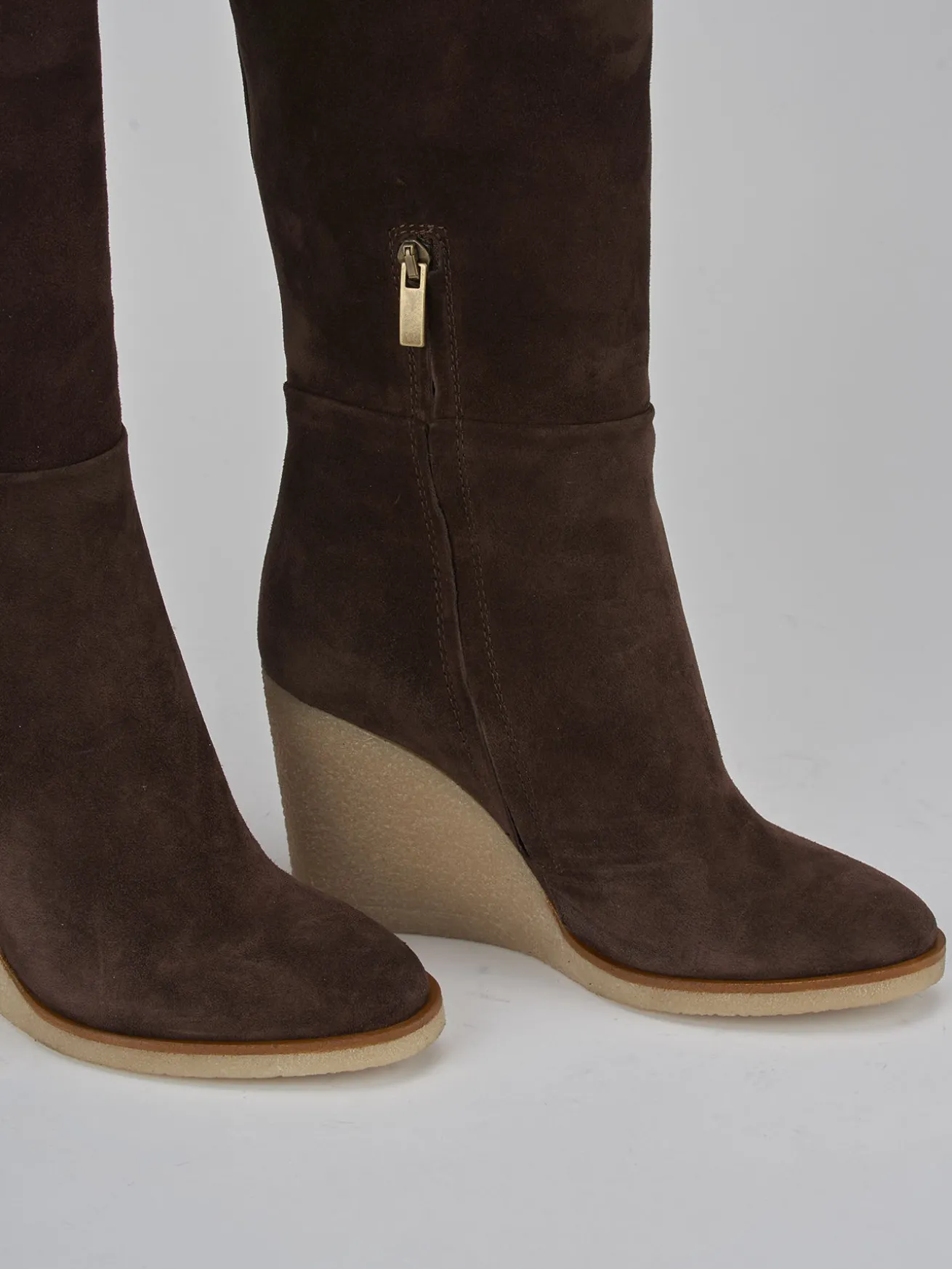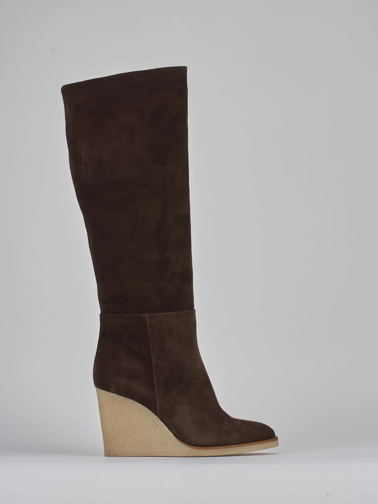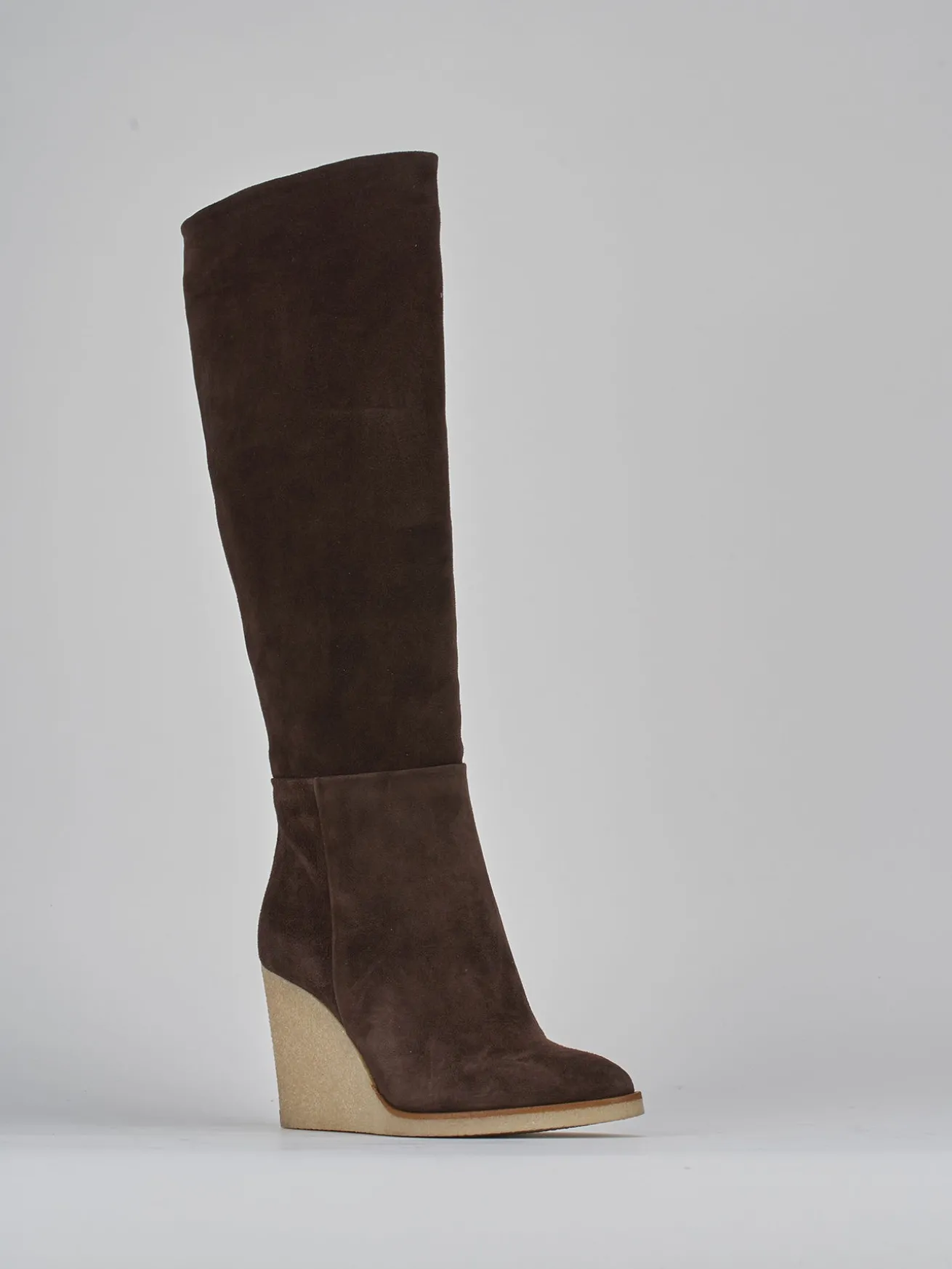 Stivale zeppa 8 cm fondo in gomma e soletto interno in vera pelle. Tomaia in morbido camoscio, punta affusolata, cerniera laterale, gambale tubolare che misura fino a sotto il ginocchio e zeppa a contrasto con 1 cm di plateau anteriore per un look cool.