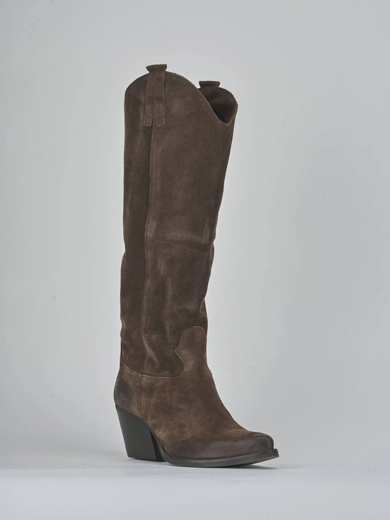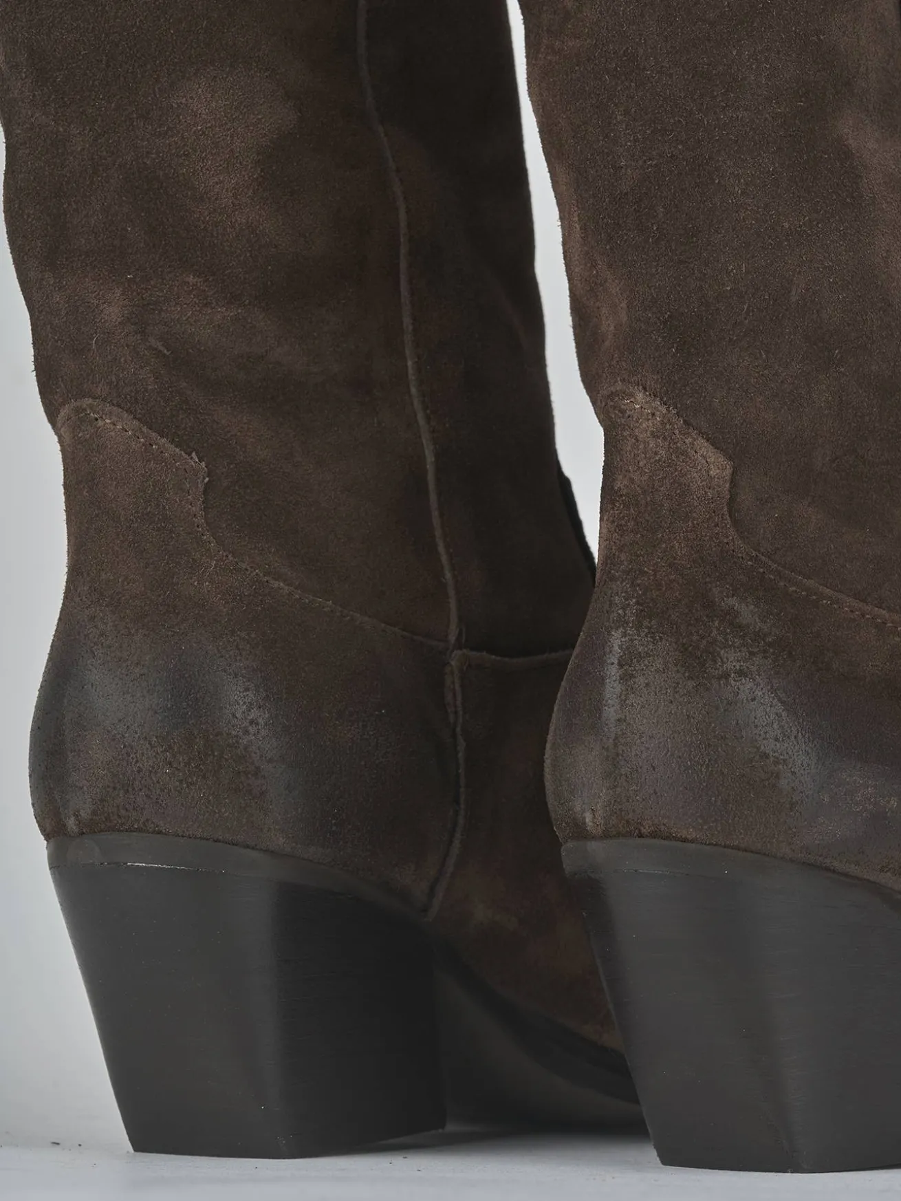 Realizzati in morbido camoscio, questi stivali presentano una punta sfilata e cuciture eleganti sul gambale ampio, che si ferma appena sotto il ginocchio.
