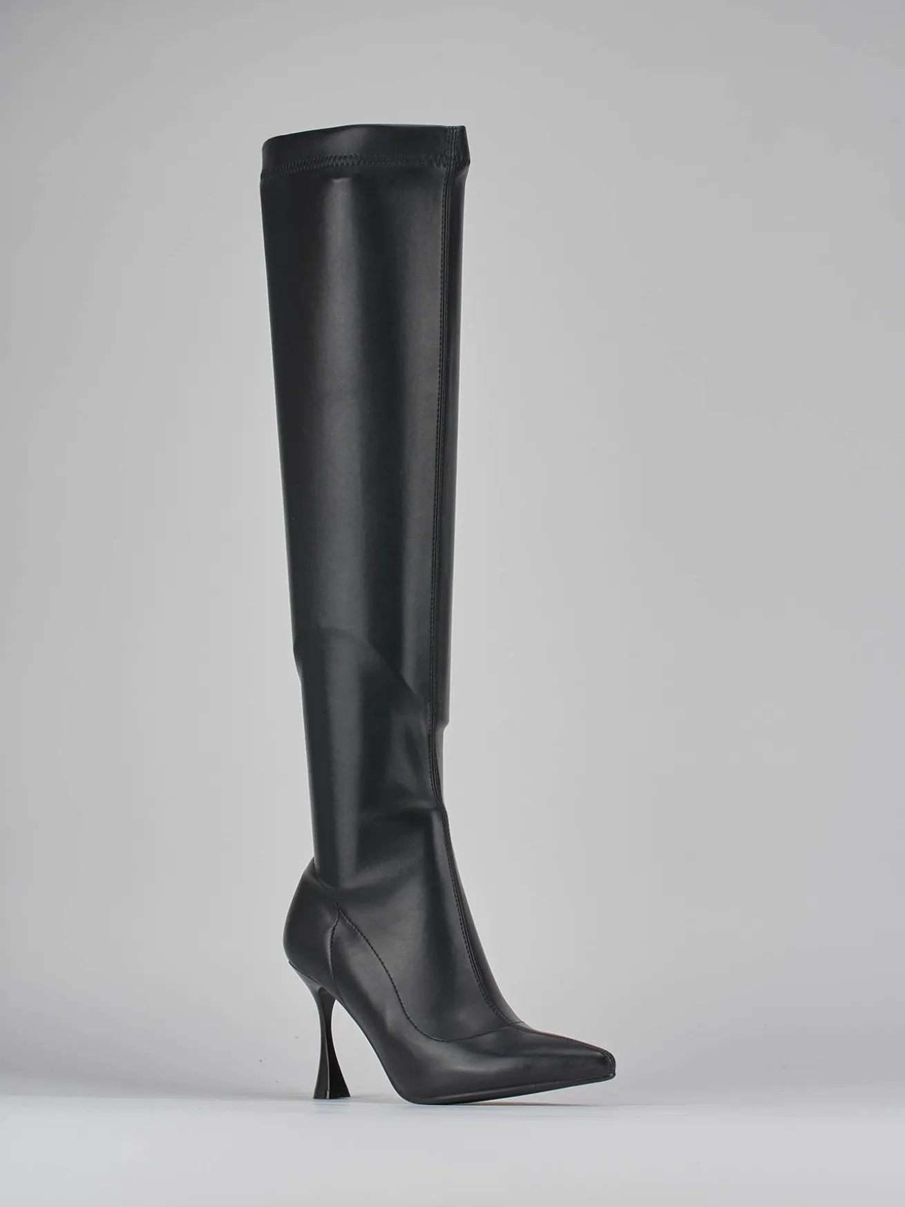 Stivale tacco 8 cm fondo in leggera gomma e soletto interno in vera pelle. Tomaia in pelle elasticizzata, punta sfilata, cuciture visibili, gambale elasticizzato aderente fino a sopra l’altezza del ginocchio, e moderno tacco a rocchetto per un look contemporaneo.