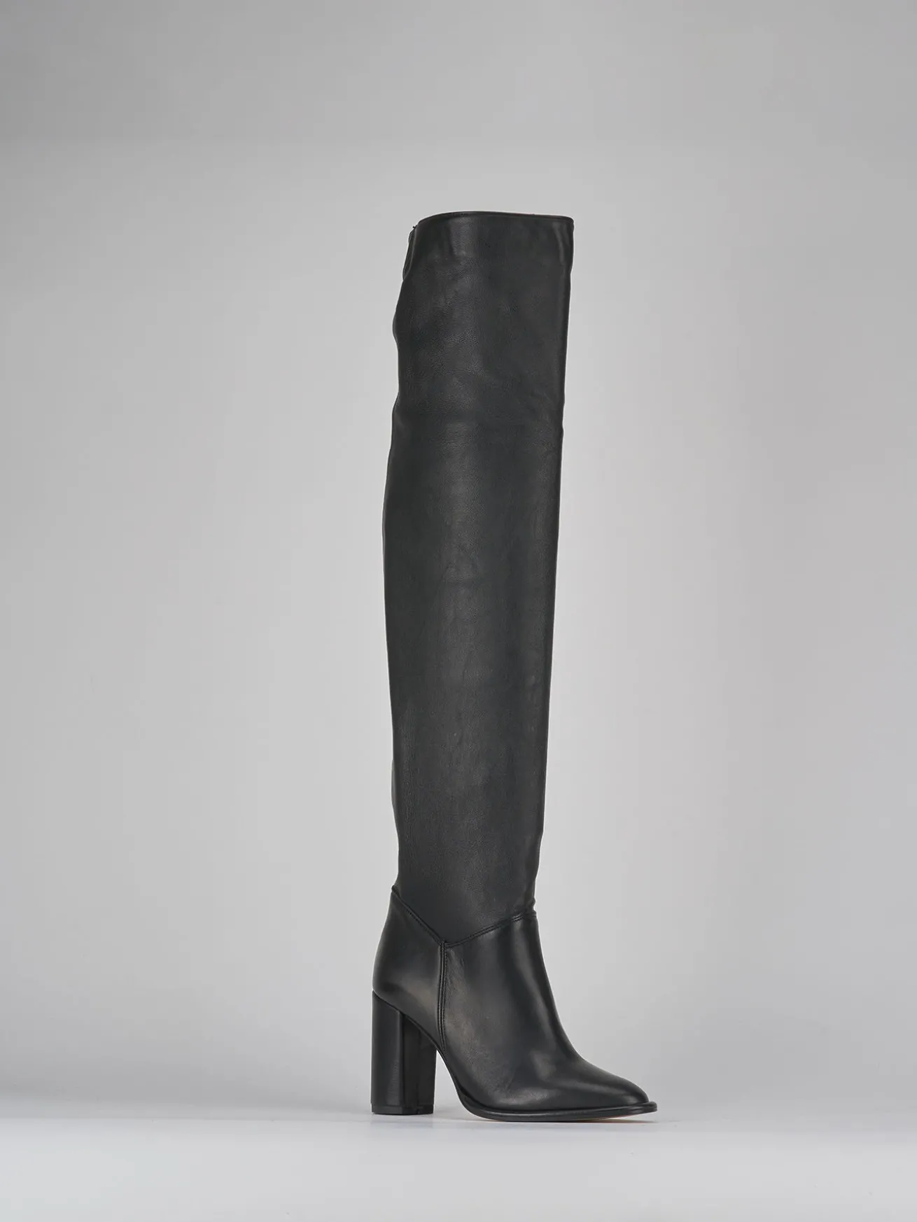 Stivale tacco 9 cm fondo in leggera gomma e soletto interno in vera pelle. tomaia in morbida pelle nappata, punta affusolata, guardolo sporgente, gambale ampio e tubolare che misura appena sopra il ginocchio e tacco grosso. dal design semplice e senza tempo è il modello passepartout che durà nella stagioni.
