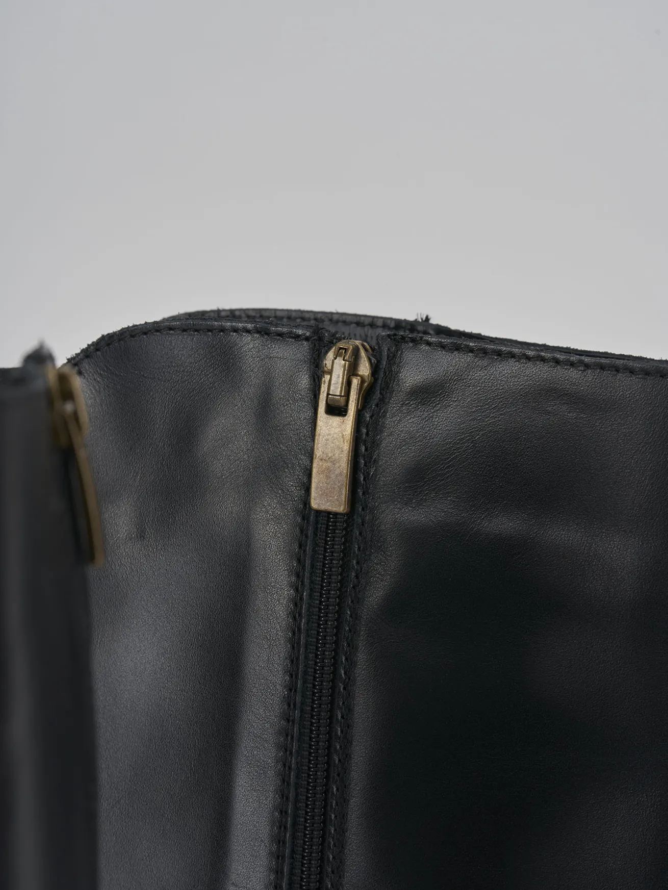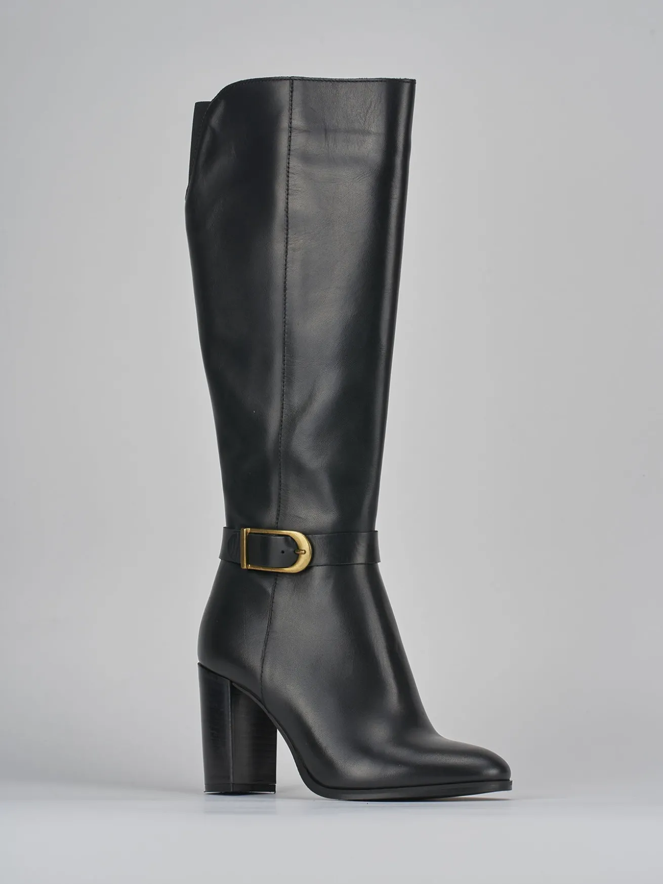 Stivale tacco 8 cm fondo in gomma e soletto interno in vera pelle. Tomaia in morbida pelle, punta affusolata, cerniera laterale lungo il gambale che misura appena sotto il ginocchio, cinturino con fibbia regolabile e tacco grosso per un look chic. particolare spacco sulla parte posteriore del gambale.