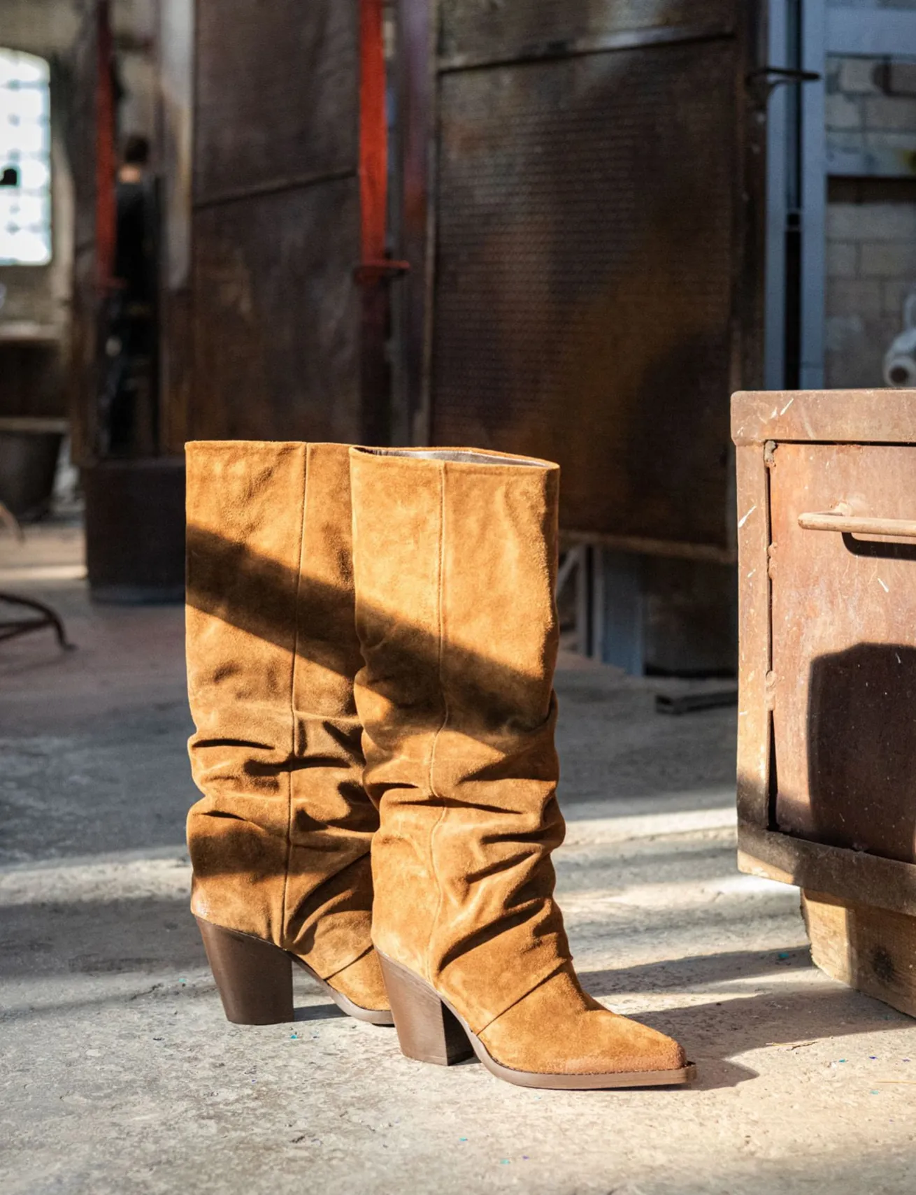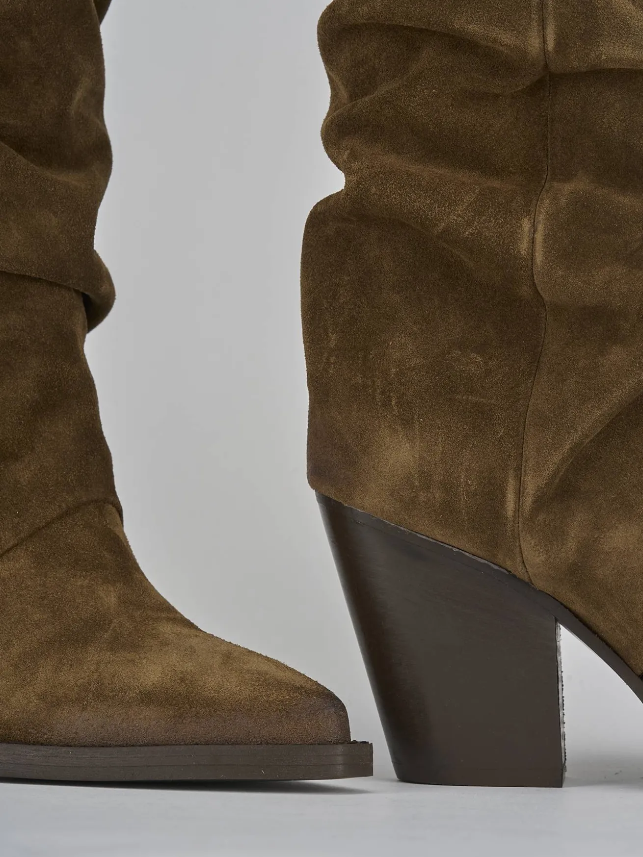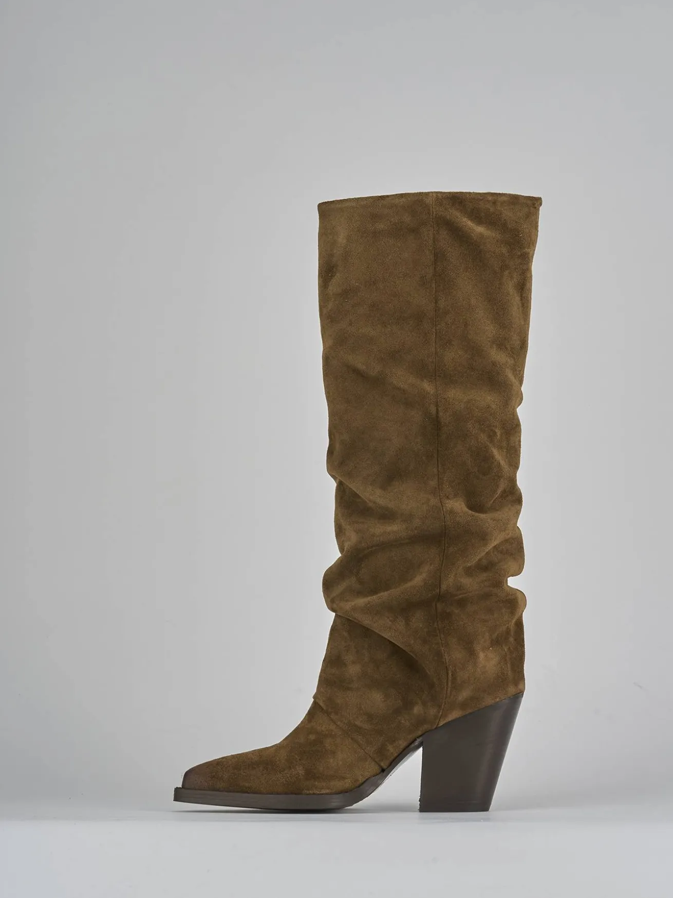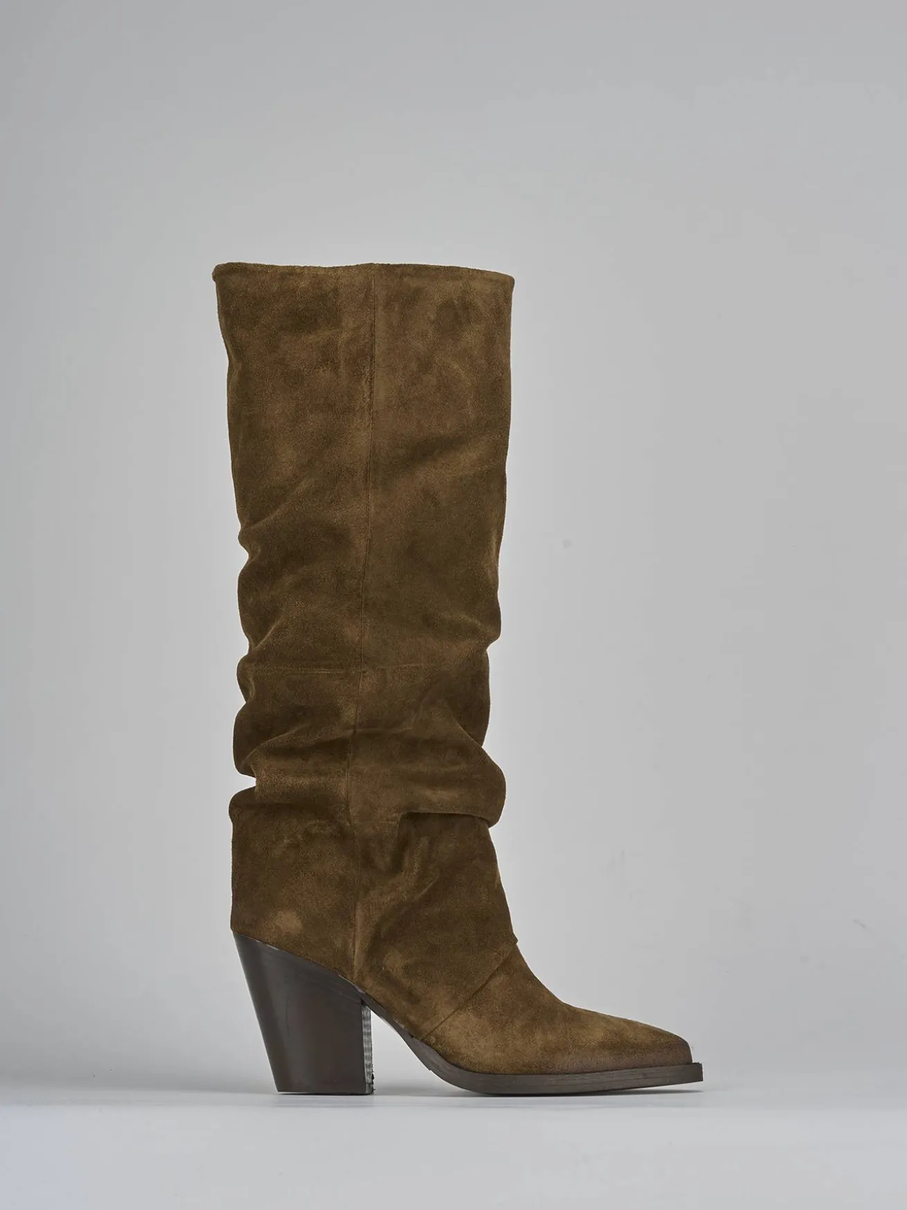 La tomaia in morbido camoscio avvolge la gamba con eleganza, mentre la punta sfilata e le cuciture sul gambale aggiungono un dettaglio sofisticato.